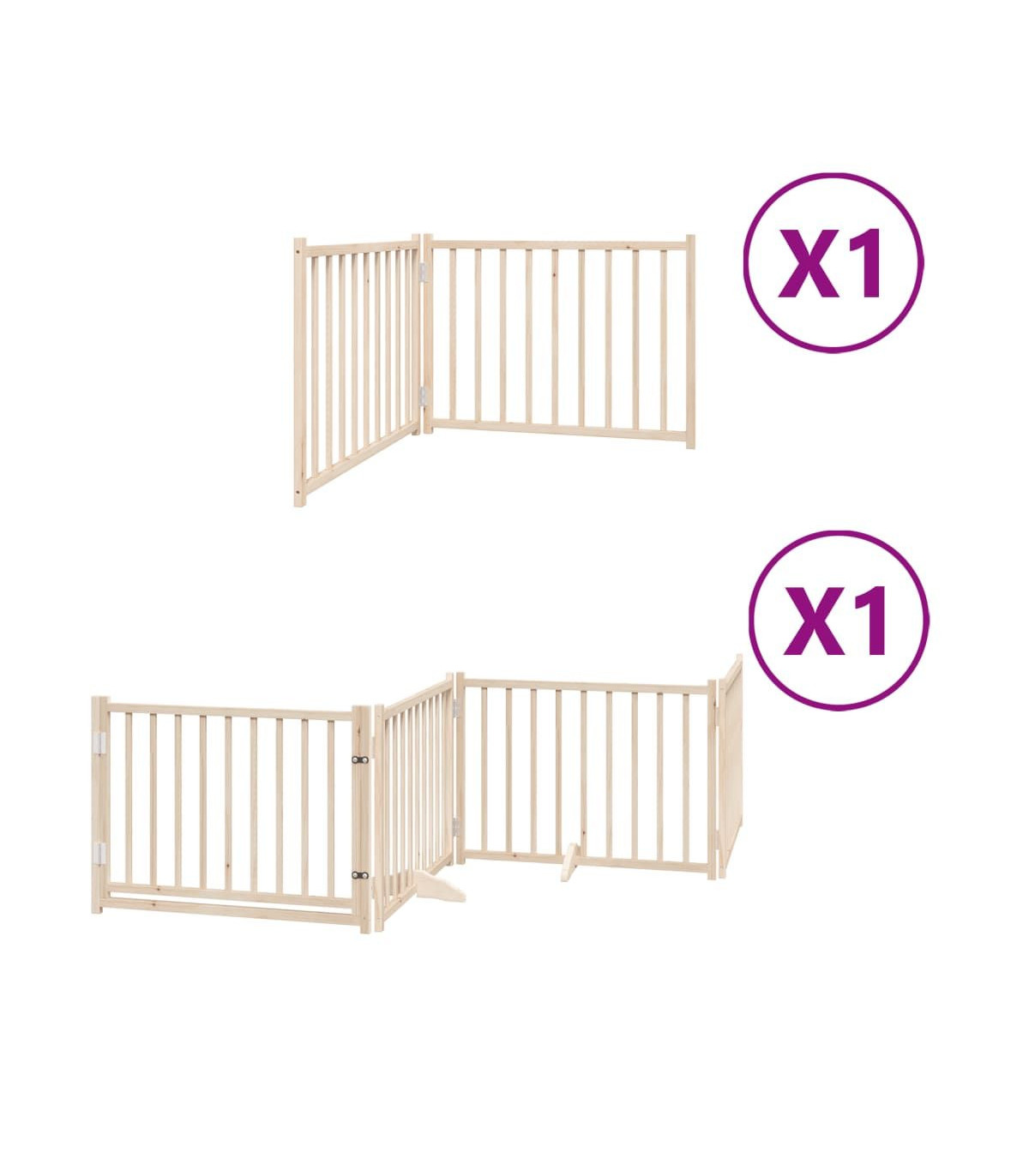 The dog gate puts your pet in a fixed activity area, which can keep your pet safe and prevent you from being disturbed. Durable material: The dog gate is made of poplar wood with water-base paint, making it durable, long-lasting, and easy to clean. Easy to use: The dog gate does not require installation or drilling that doesn't damage your home. This dog gate can be totally foldable when without feet, making it easy to carry and store in the closet or somewhere else. Practical design: The dog gate features two sturdy feet, providing stability and allowing for easy adjustments. Additionally, it includes a door panel and is equipped with locks, providing enhanced security and convenience for both you and your pets. Multiple applications: This dog gate can effectively prevent your pets from jumping over and getting through. Therefore, it is perfect for keeping your pets safe in the living room, kitchen, stairs, and doorway.