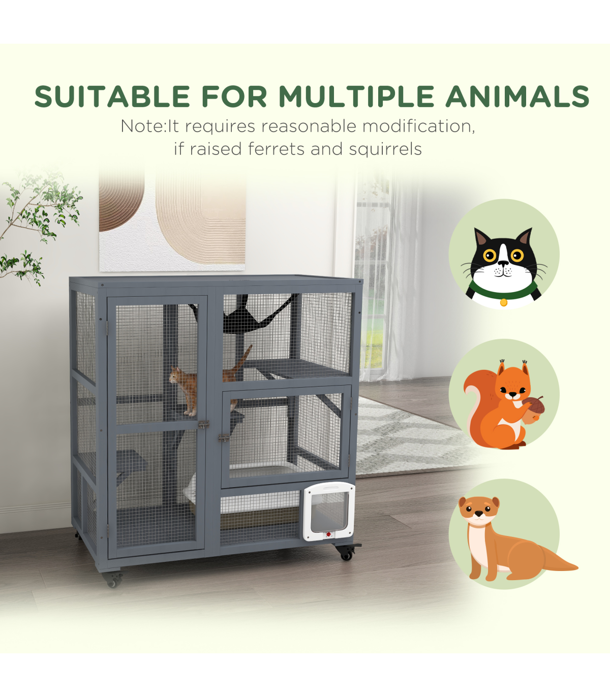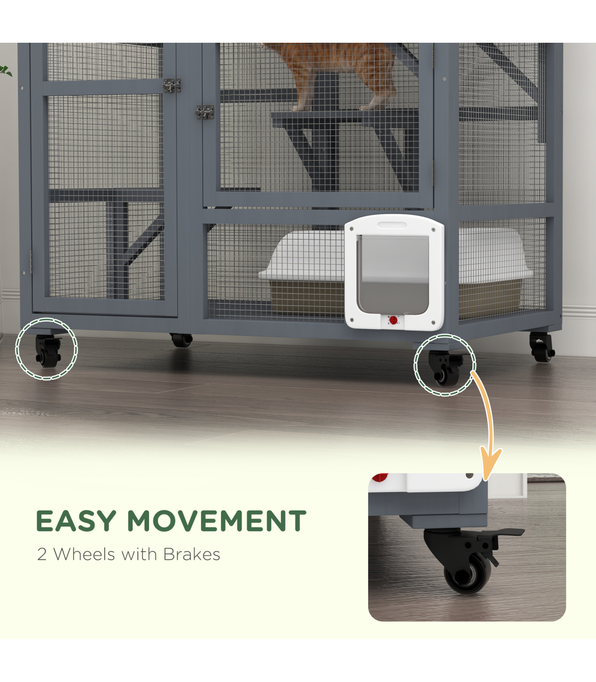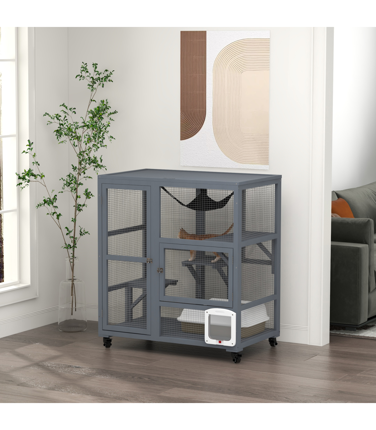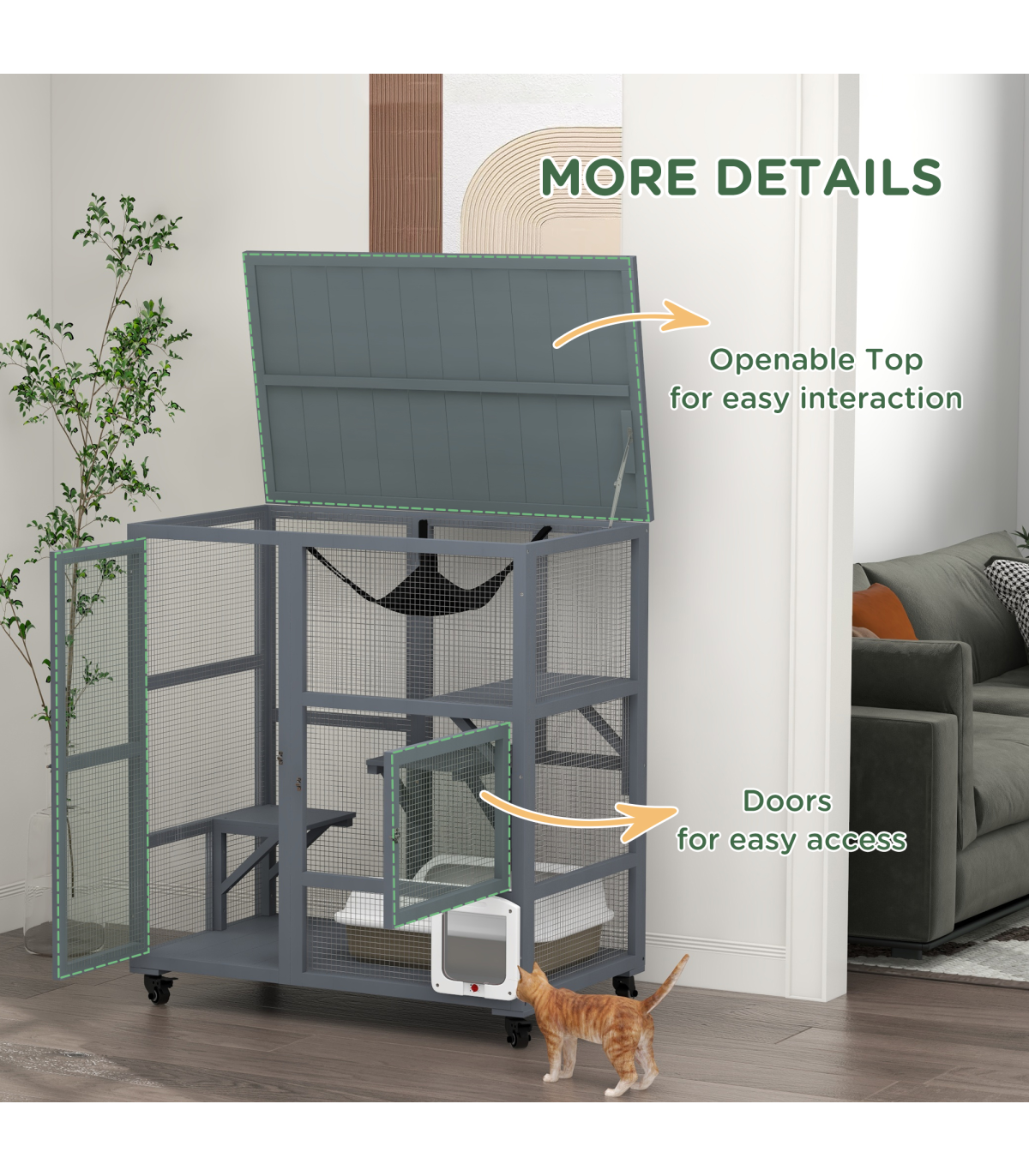 - - Two doors for easy access and a large door for convenient placement of a cat litter box