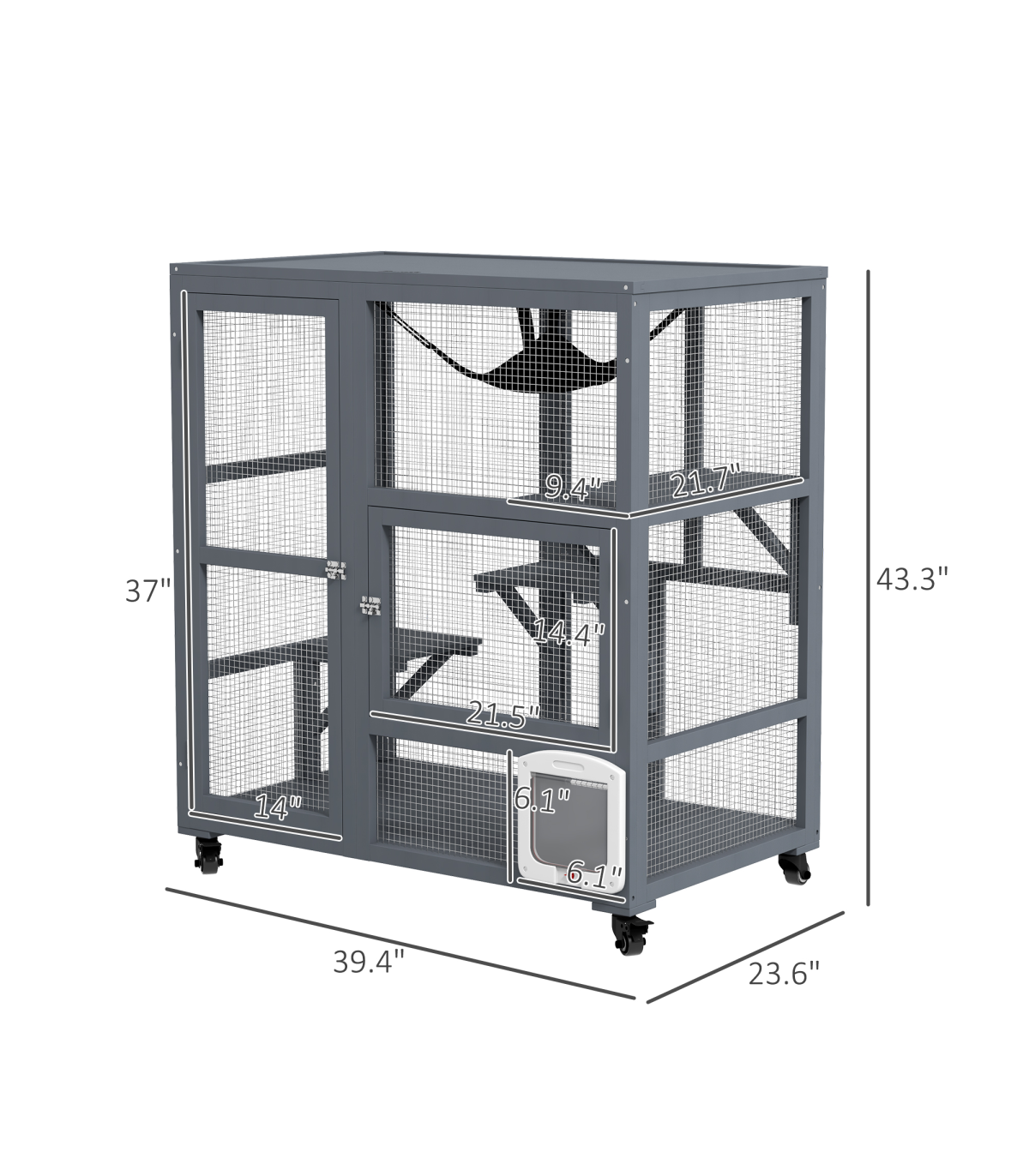 - - Door Size: Front: 14" W x 37" H. Middle: 21.5" W x 14.25" H. Flap door: 6" W x 6" H