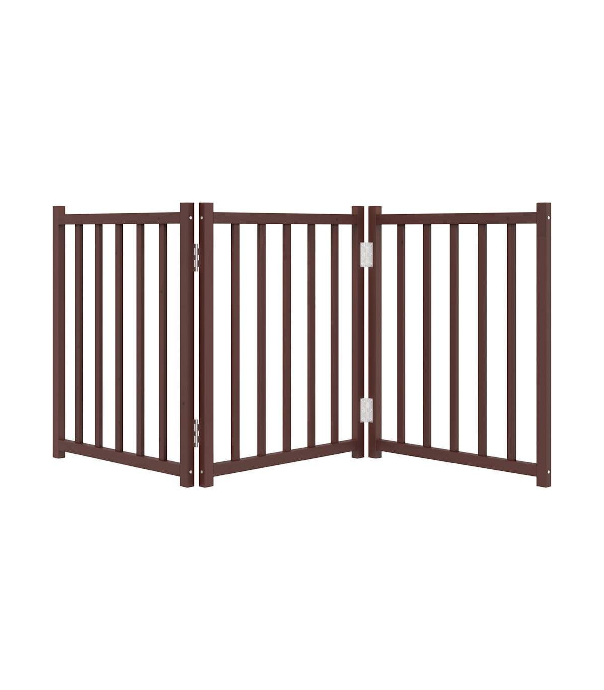 The dog gate puts your pet in a fixed activity area, which can keep your pet safe and prevent you from being disturbed.Durable material: The dog gate is made of solid fir wood with water-base paint, making it durable, long-lasting, and easy to clean.Easy to use: The dog gate does not require installation or drilling that doesn't damage your home. This dog gate can be totally foldable when without feet, making it easy to carry and store in the closet or somewhere else.Practical design: The dog gate features two sturdy feet, providing stability and allowing for easy adjustment, providing enhanced security and convenience for both you and your pets.Multiple applications: This dog gate can effectively prevent your pets from jumping over and getting through. Therefore, it is perfect for keeping your pets safe in the living room, kitchen, stairs, and doorway.