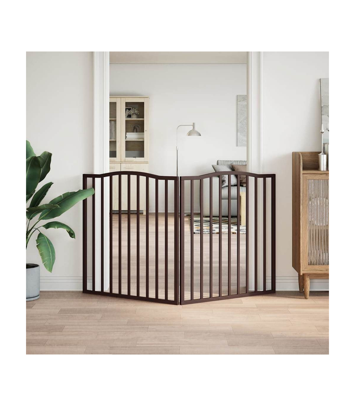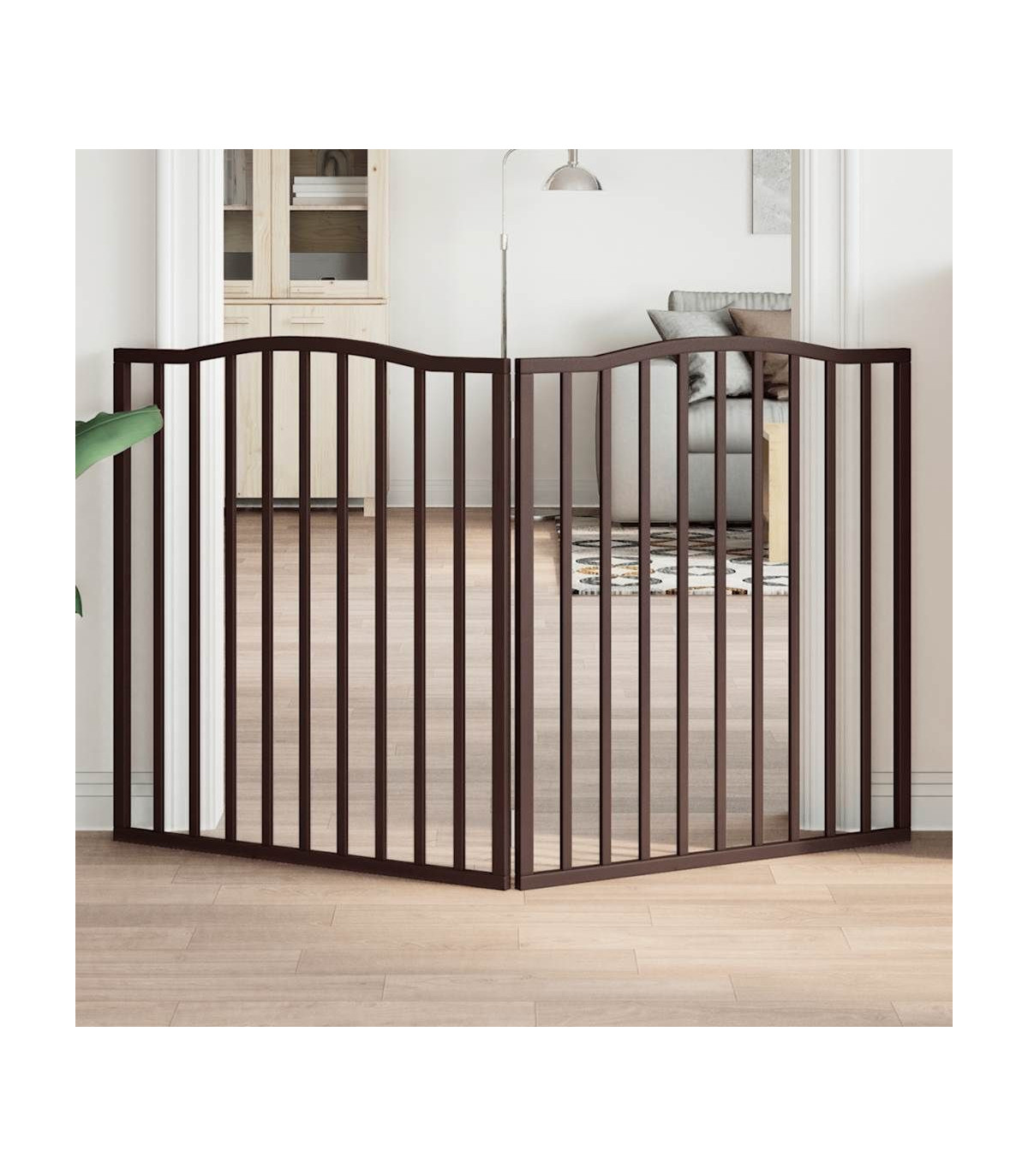 The dog gate puts your pet in a fixed activity area, which can keep your pet safe and prevent you from being disturbed.Durable material: The dog gate is made of poplar wood with water-base paint, making it durable, long-lasting, and easy to clean.Easy to use: The dog gate does not require installation or drilling that doesn't damage your home. This dog gate can be totally foldable when without feet, making it easy to carry and store in the closet or somewhere else.Practical design: The dog gate features two sturdy feet, providing stability and allowing for easy adjustment, providing enhanced security and convenience for both you and your pets.Multiple applications: This dog gate can effectively prevent your pets from jumping over and getting through. Therefore, it is perfect for keeping your pets safe in the living room, kitchen, stairs, and doorway.