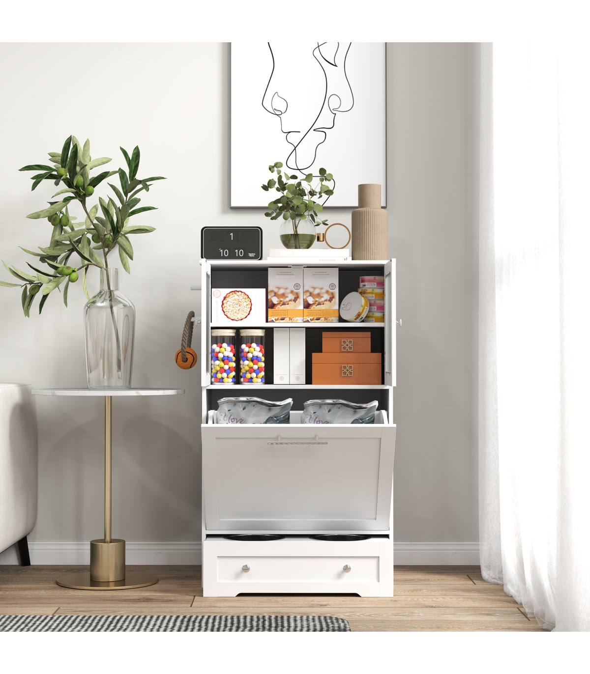 ● Large cabinets and tabletop provide convenient storage