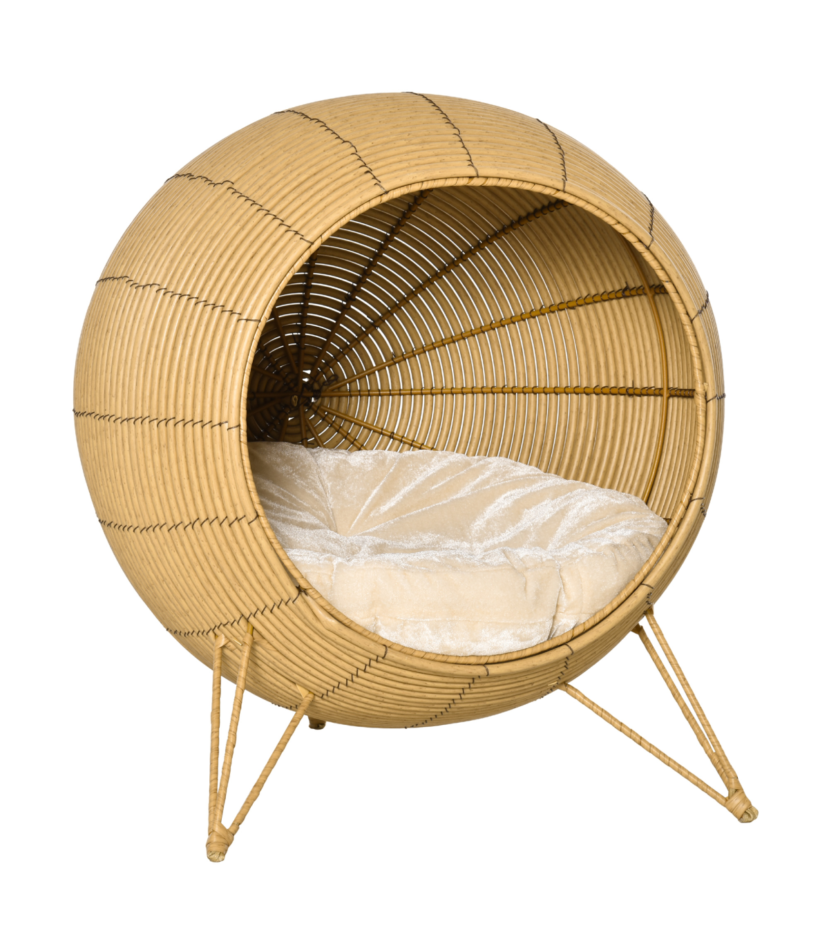 A stylish place for cats and kittens to rest and spend time alone. This cat wicker basket's large inner size, which can only be accessed by the entrance, means they have a comfortable haven to relax in anytime. Inside there is a soft cushion for comfort. Sturdy and safe metal frame, wrapped in beautiful PE wicker. Finished with hairpin-shaped feet to elevate off the floor and keep it balanced.