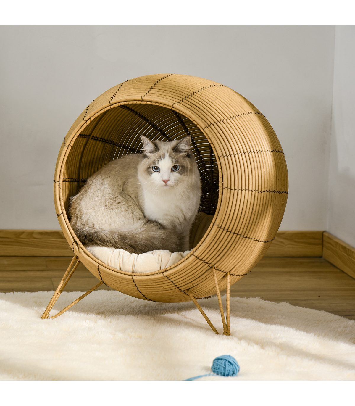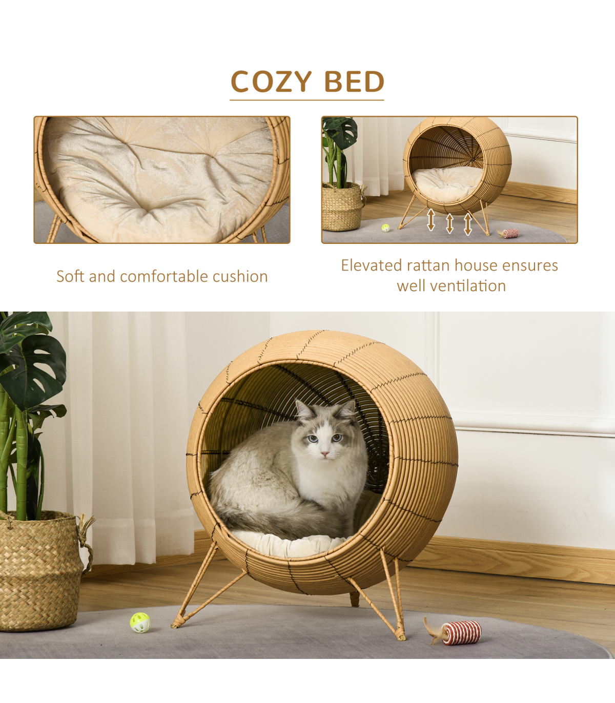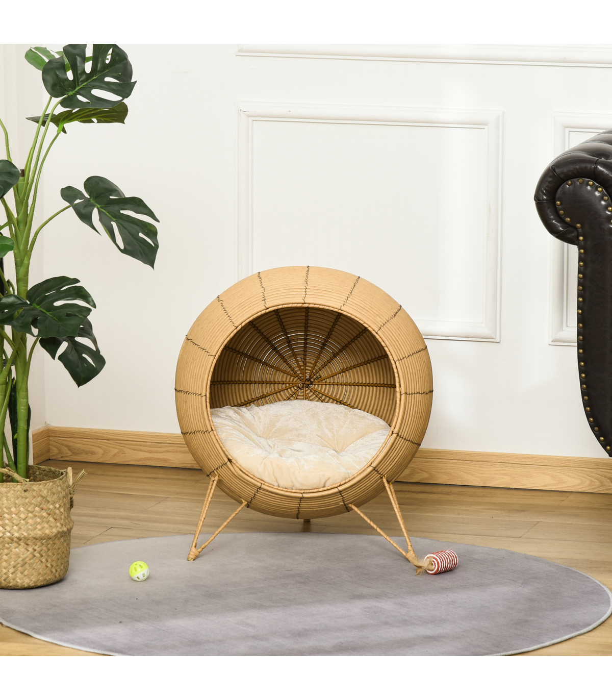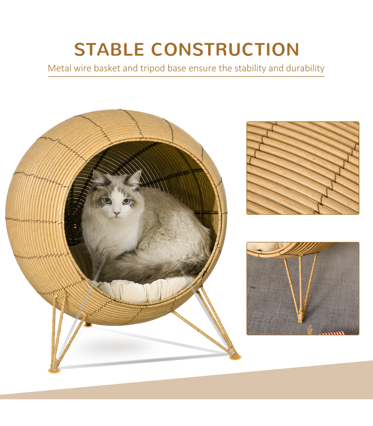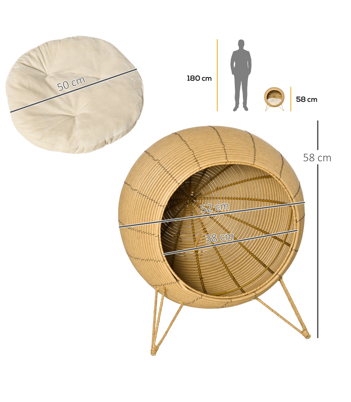 - Core metal frame for a tough and sturdy structure of this kitten bed, wrapped in beautiful PE wicker - Inner cushion of wicker cat basket for comfort. Cannot be washed - Elevated with the legs, no direct contact between floor and shell house for safety - Suitable for cats under 5kg - No assembly required- Color: Light Brown - Material: PE rattan, Metal Wire, Flannel, PP Cotton - Overall Dimension: 52 x 58H cm - Door Dimension: 38cm - Mat Dimension: 50cm - Item Label: D30-395