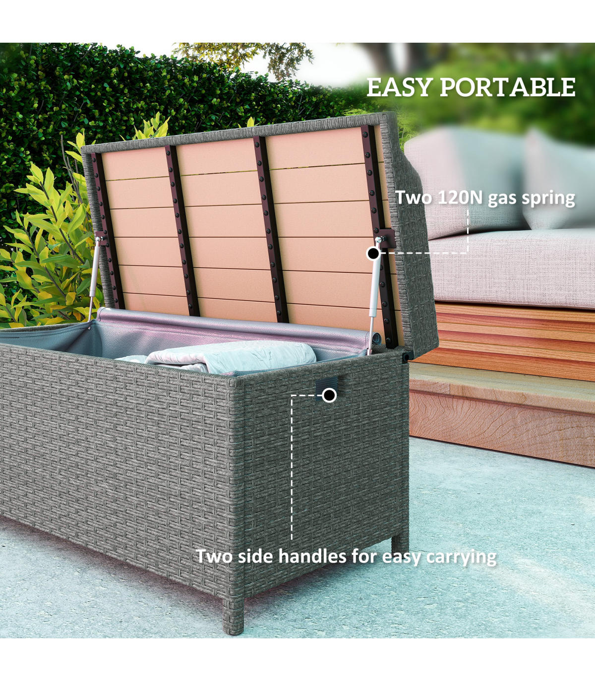 ● Material: Aluminium, PE Rattan, Plastic Wood Board, Polyester Cloth
