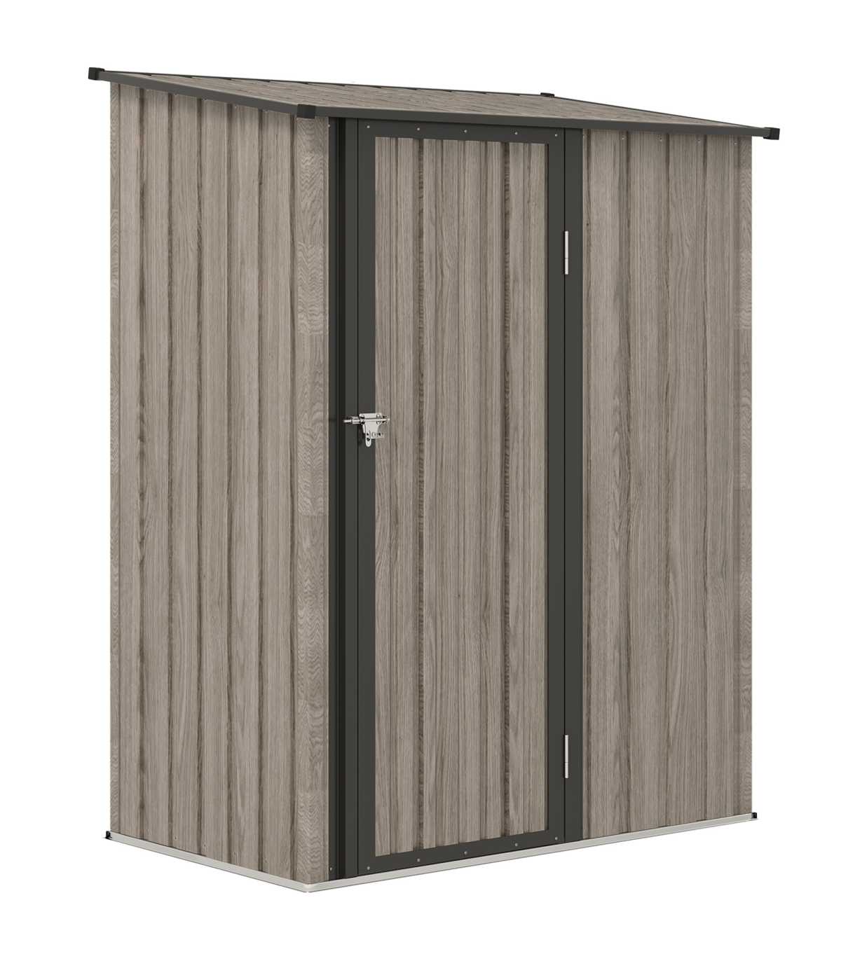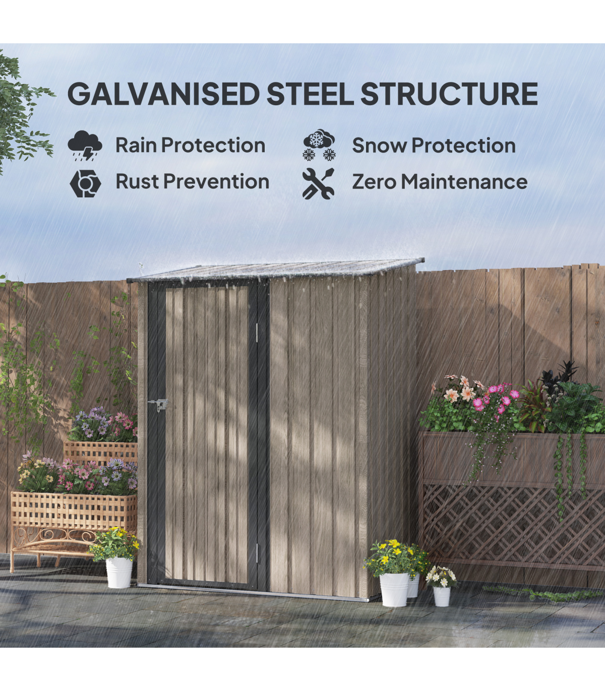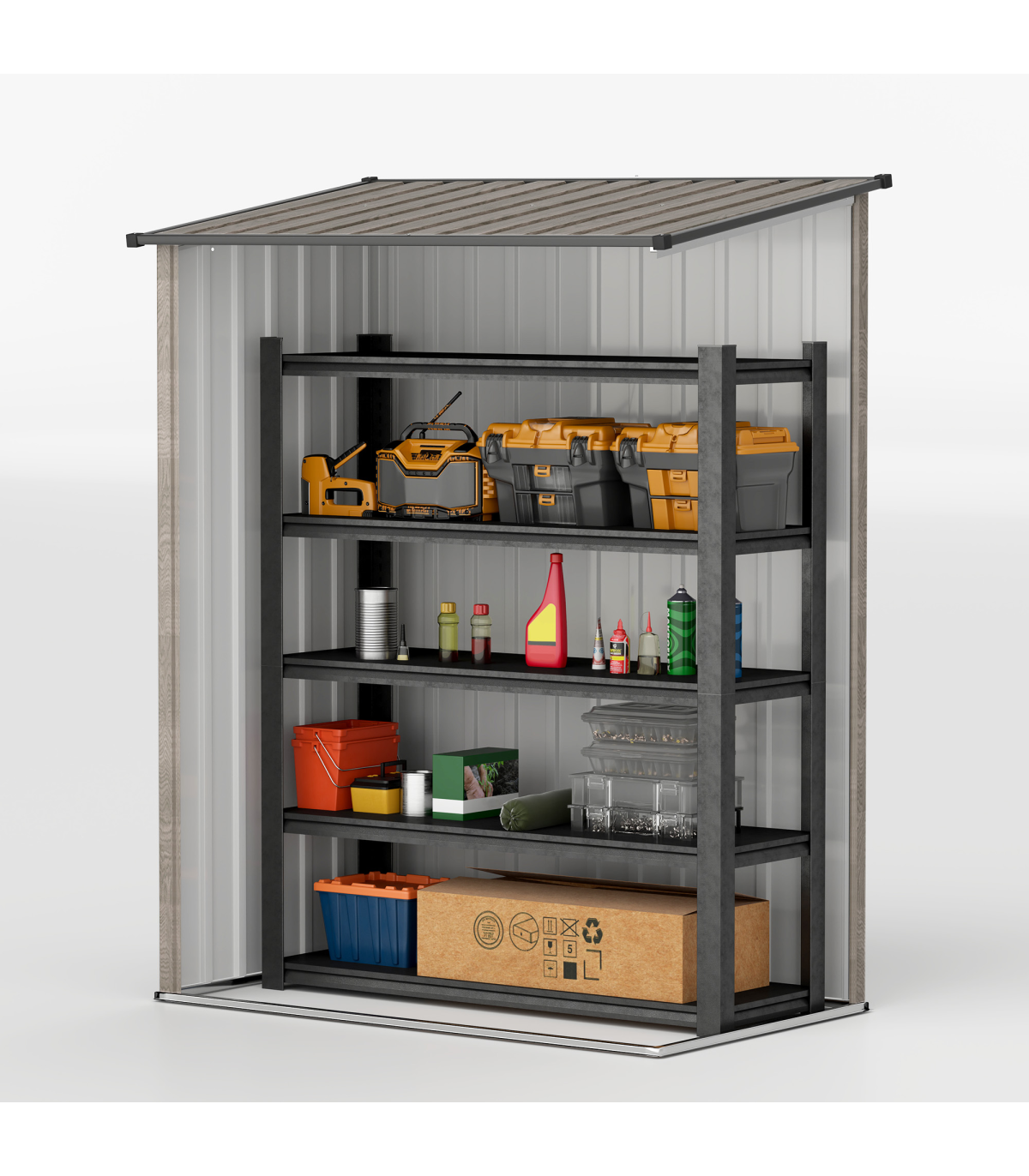 ● Sloped roof so water doesn't build up and rot/rust the frame of metal shed