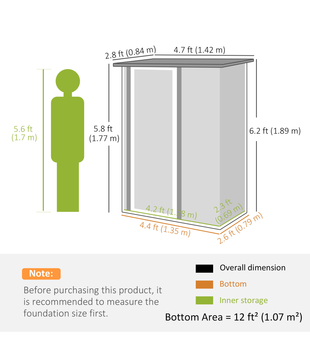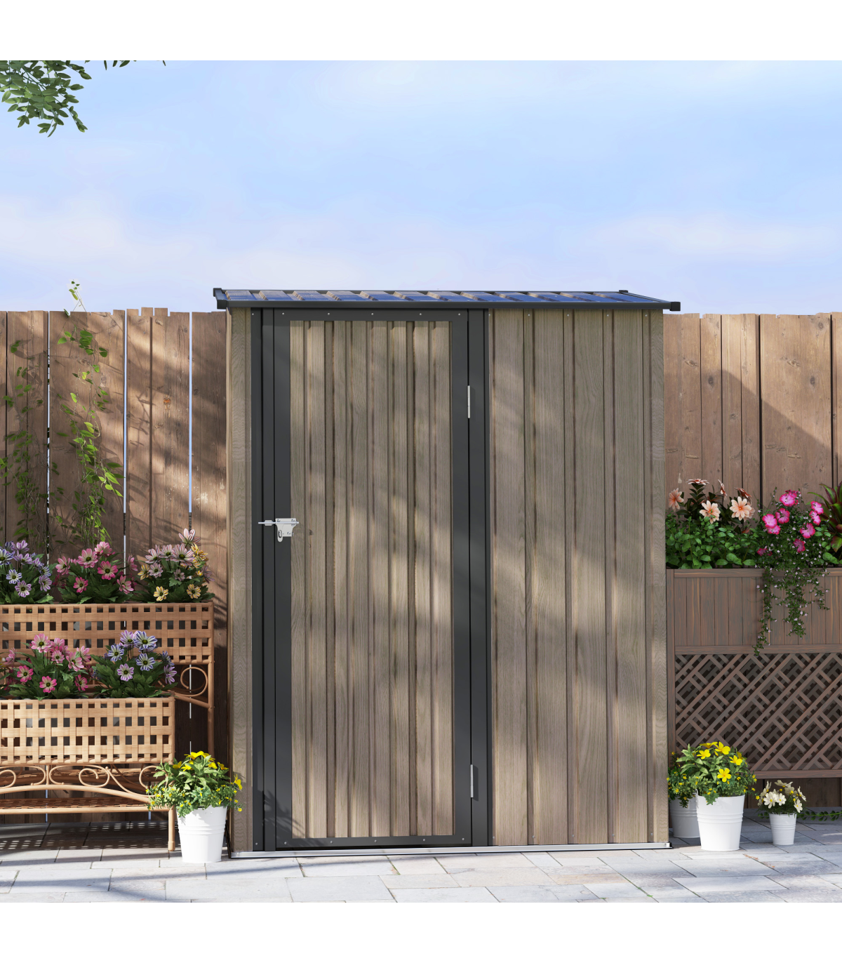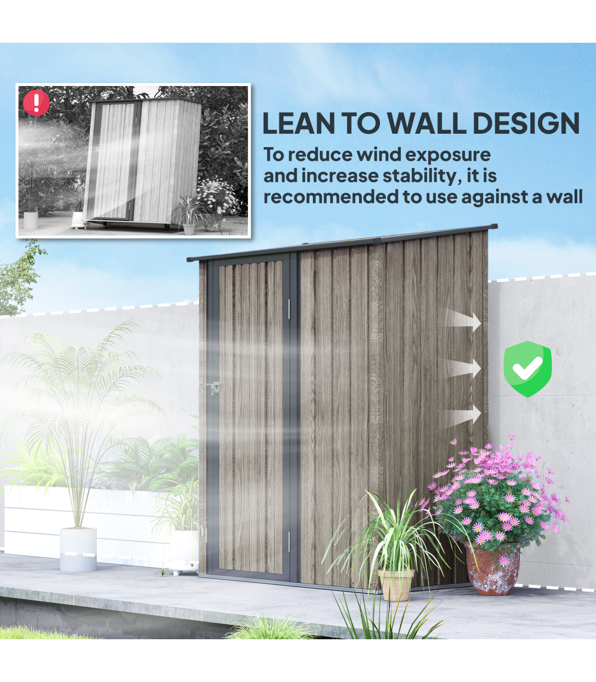 ● Sloped roof so water doesn't build up and rot/rust the frame of metal shed