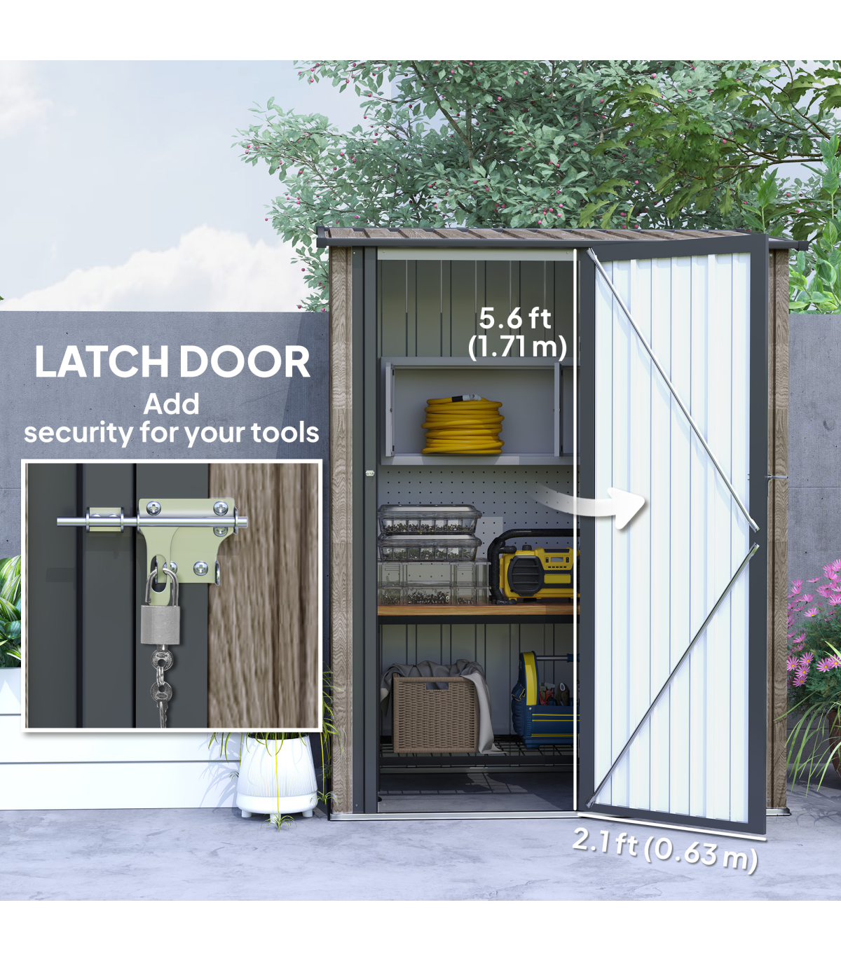 ● Tall door for easy access, with a latch for security