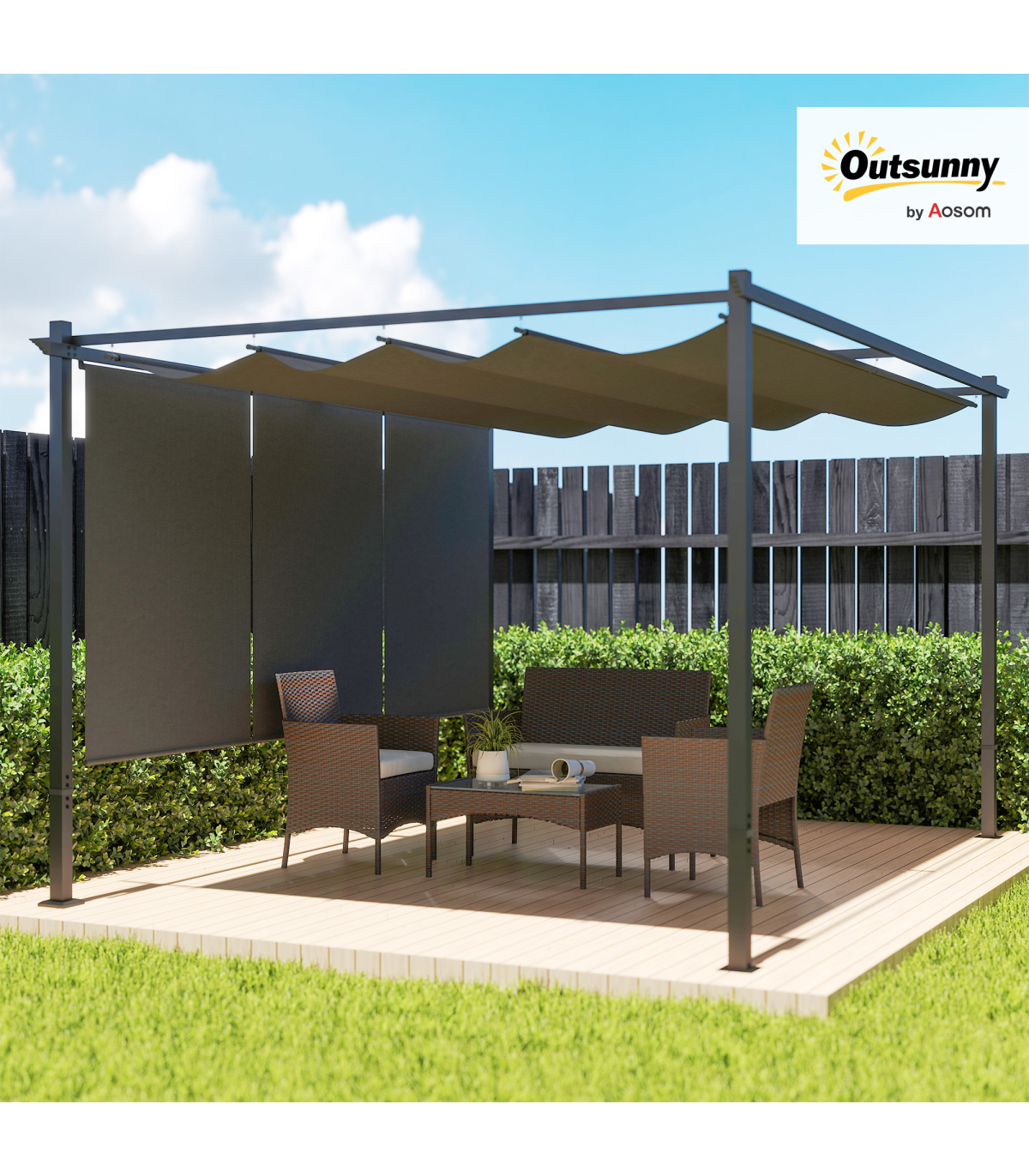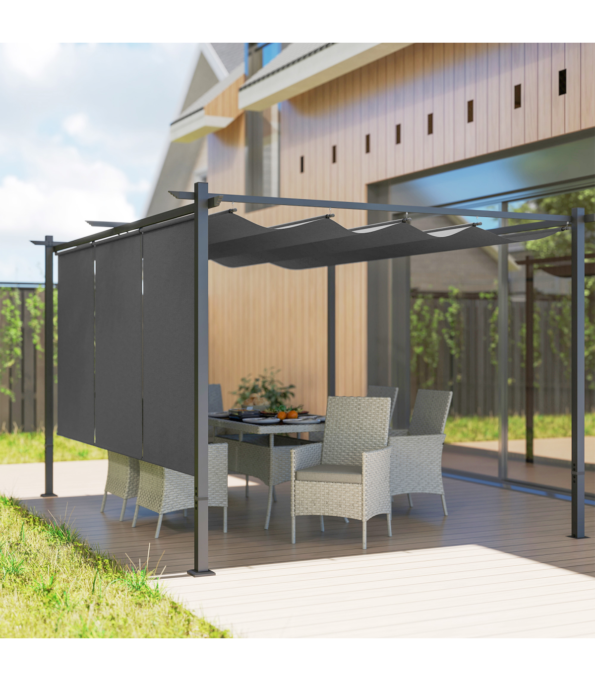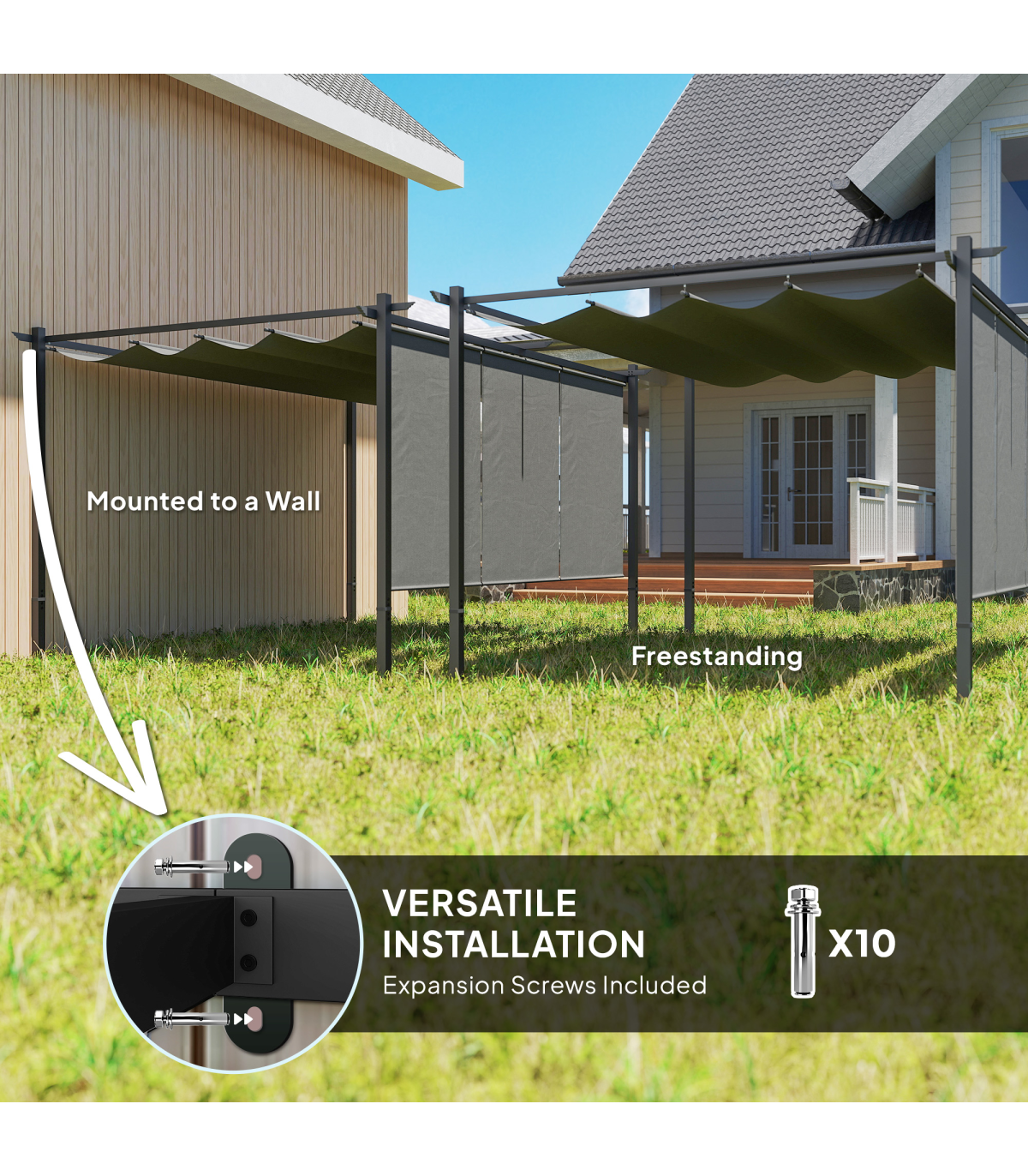 ● Metal pergola fixes to wall or stands independently for flexibility