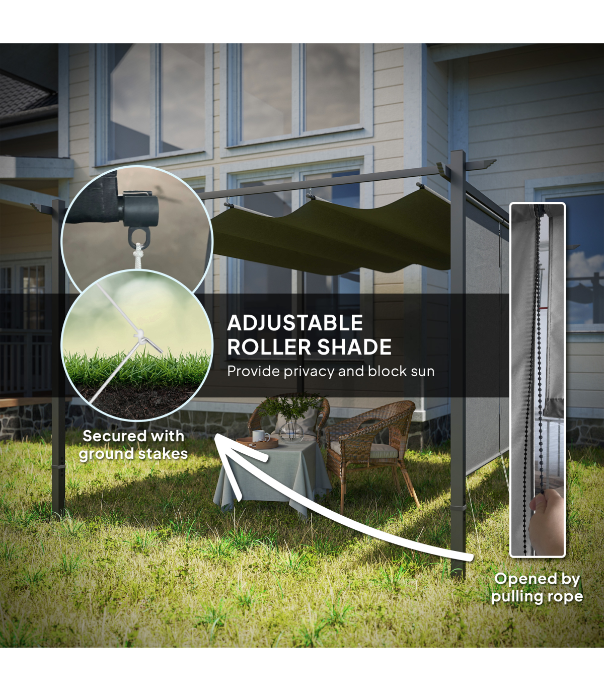● Adjustable roll-up sides block wind and sun, enhancing comfort