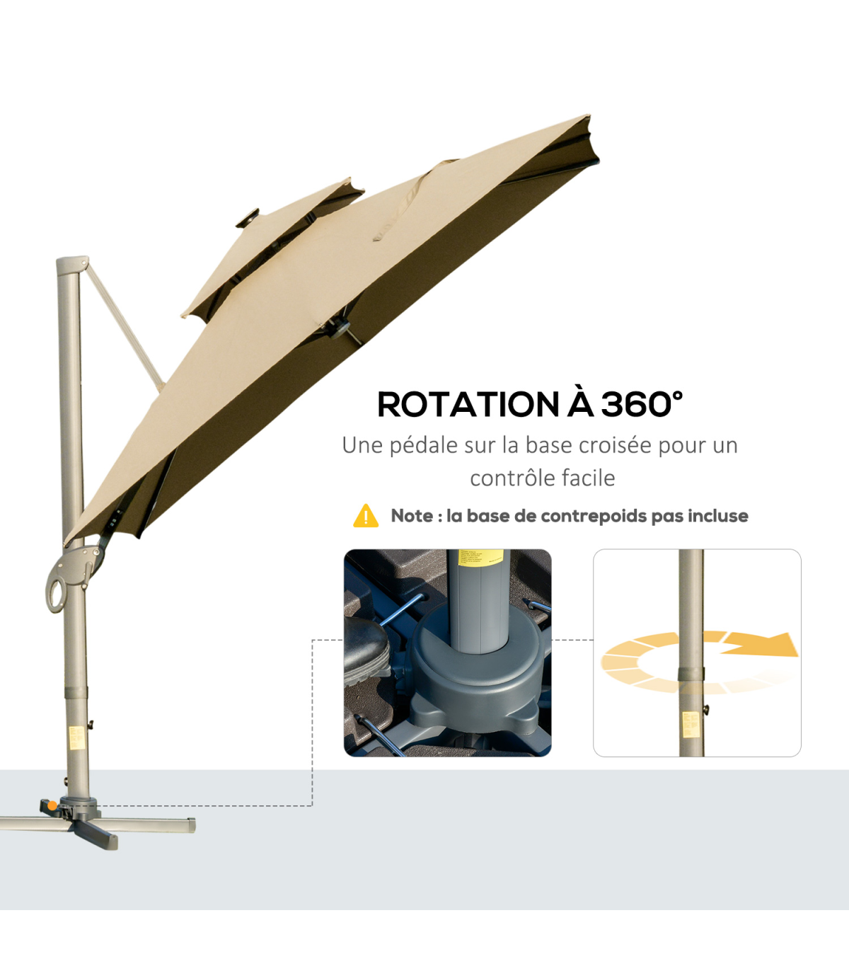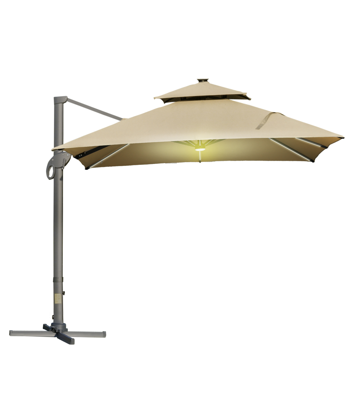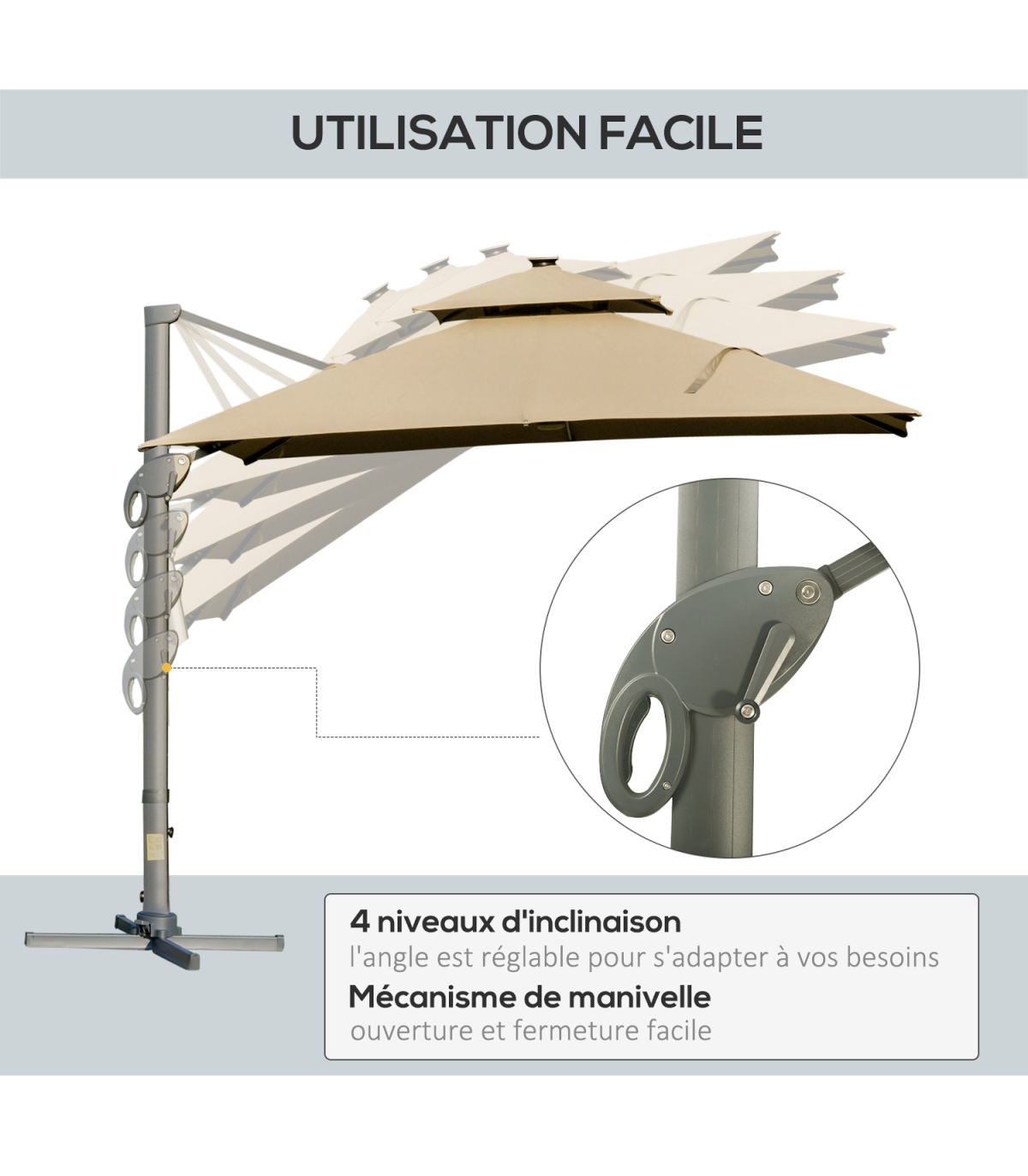 ● Canopy goes up and down to four different positions. Crank handle to open and move easily