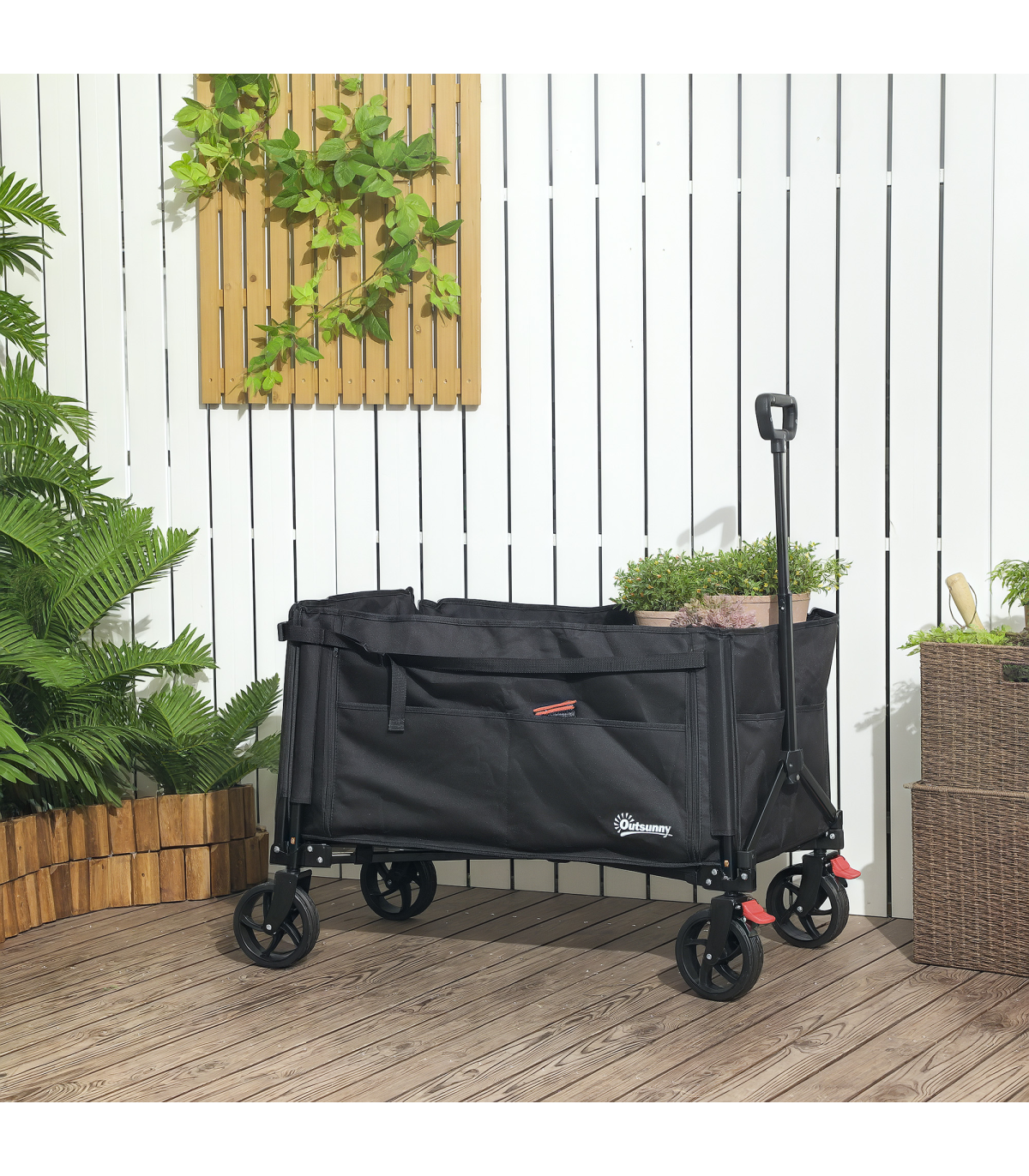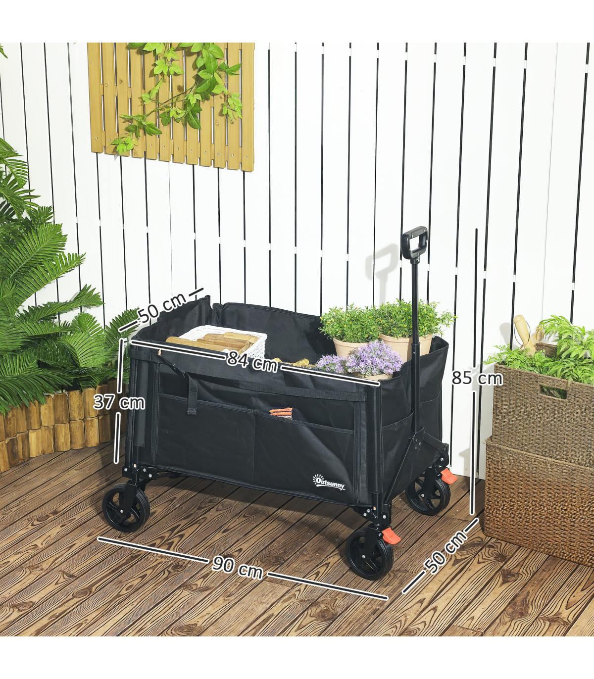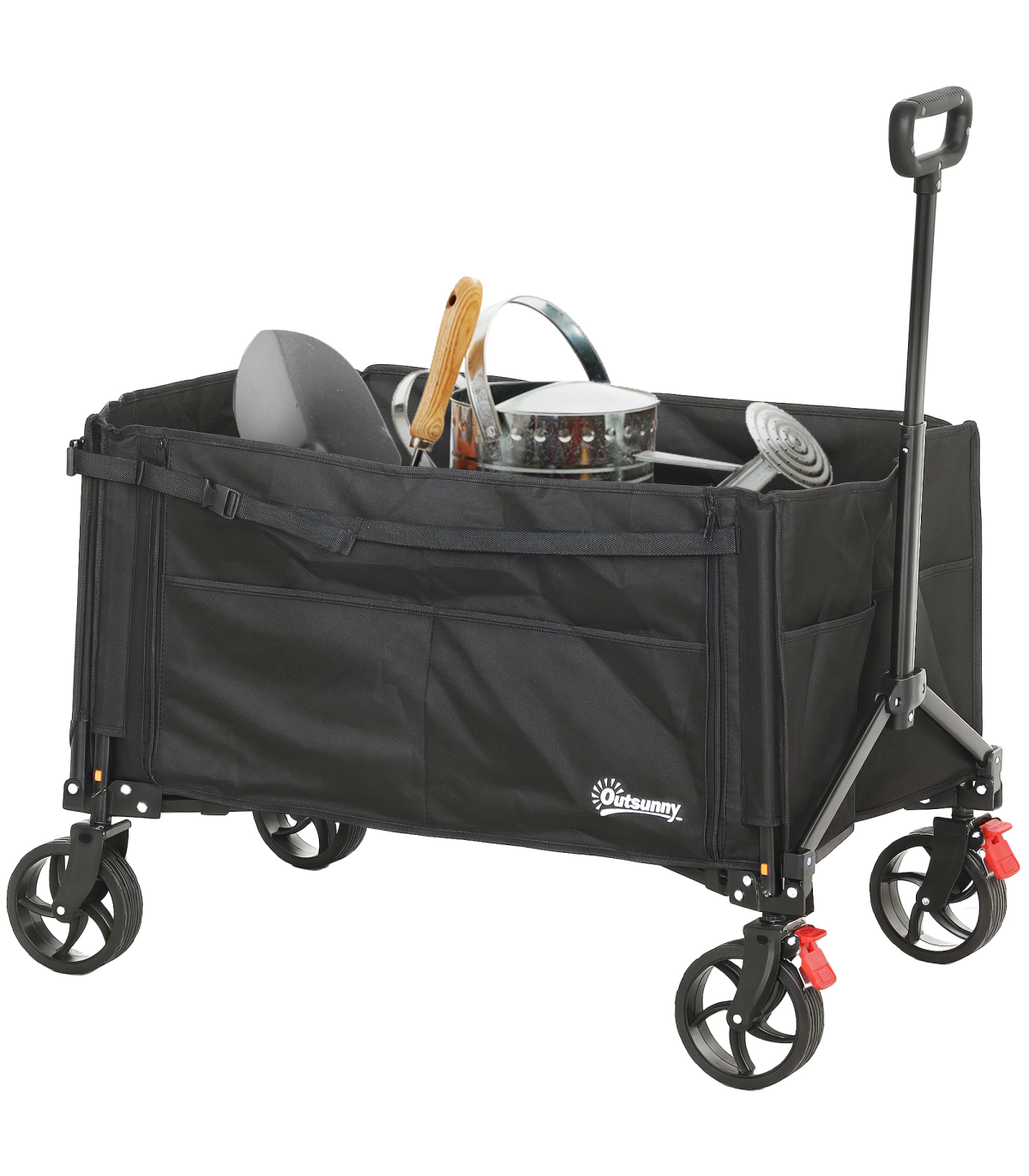 Discover the Outsunny foldable camping trolley, your versatile companion for every adventure! Whether you're camping, gardening or fishing, effortlessly transport bulky items with its flattenable back and side. Keep everything organised with handy side pockets. Effortlessly navigate through any terrain with its 360° rotating wheels and enjoy easy storage as it collapses into a compact size. Great for those on the go!