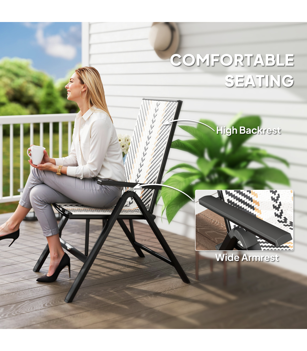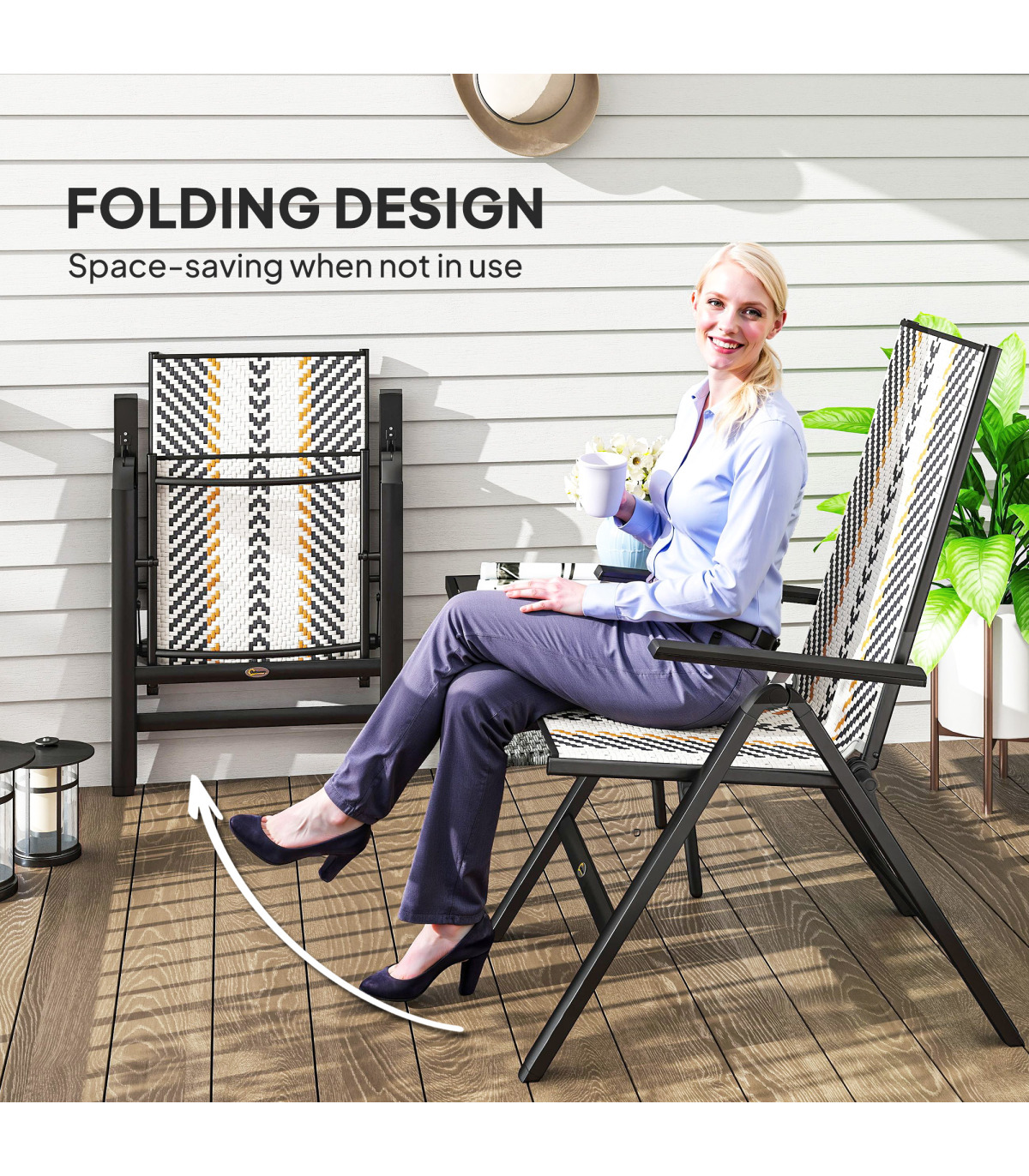 Unfold and relax with these Outsunny folding garden chair. With five adjustable back positions, so you can lie back to the position you want. The hand-woven plastic wicker seat create a stylish and beautiful rattan look. The foldable design makes it easy to store away and bring out, whenever you want.