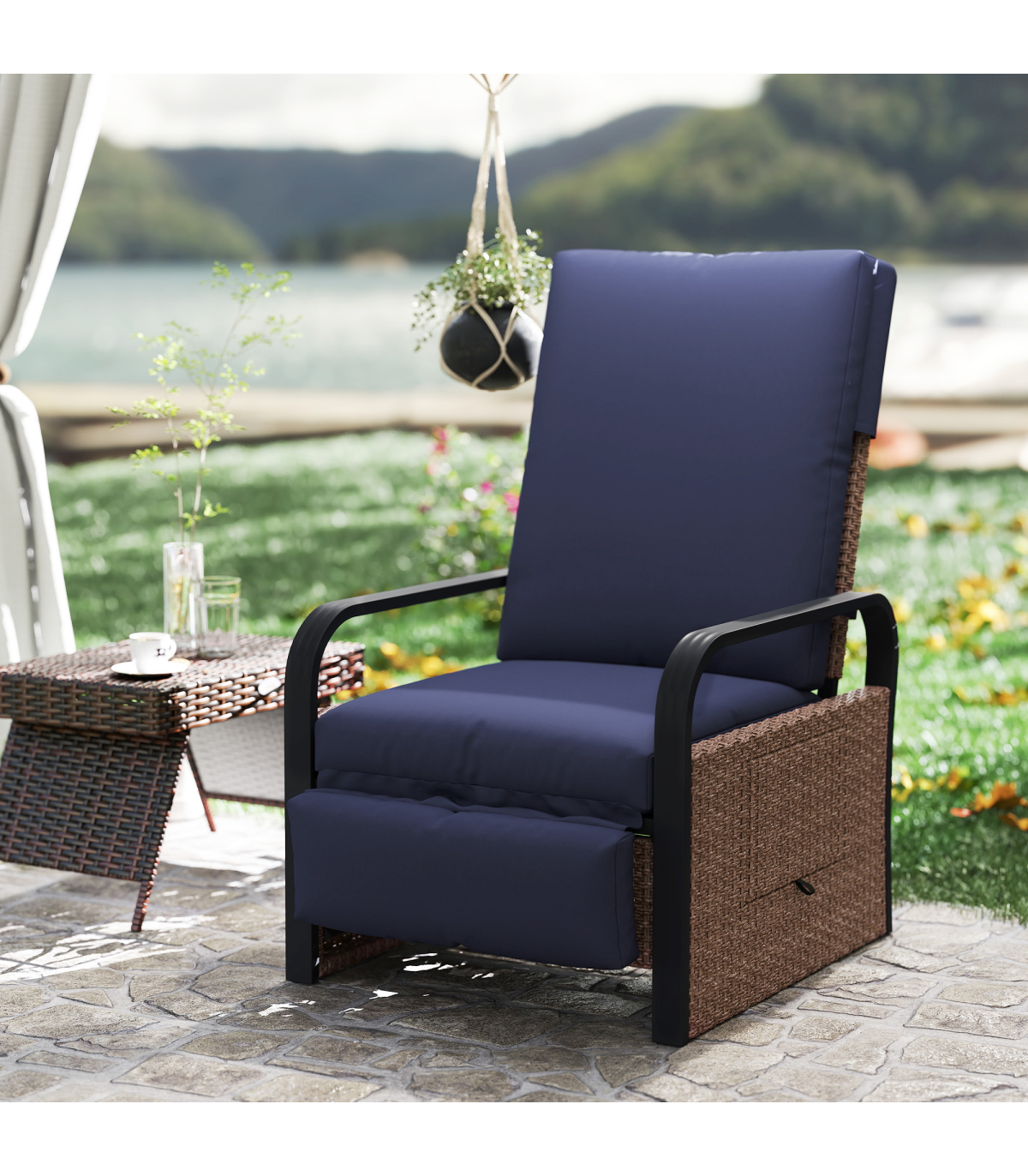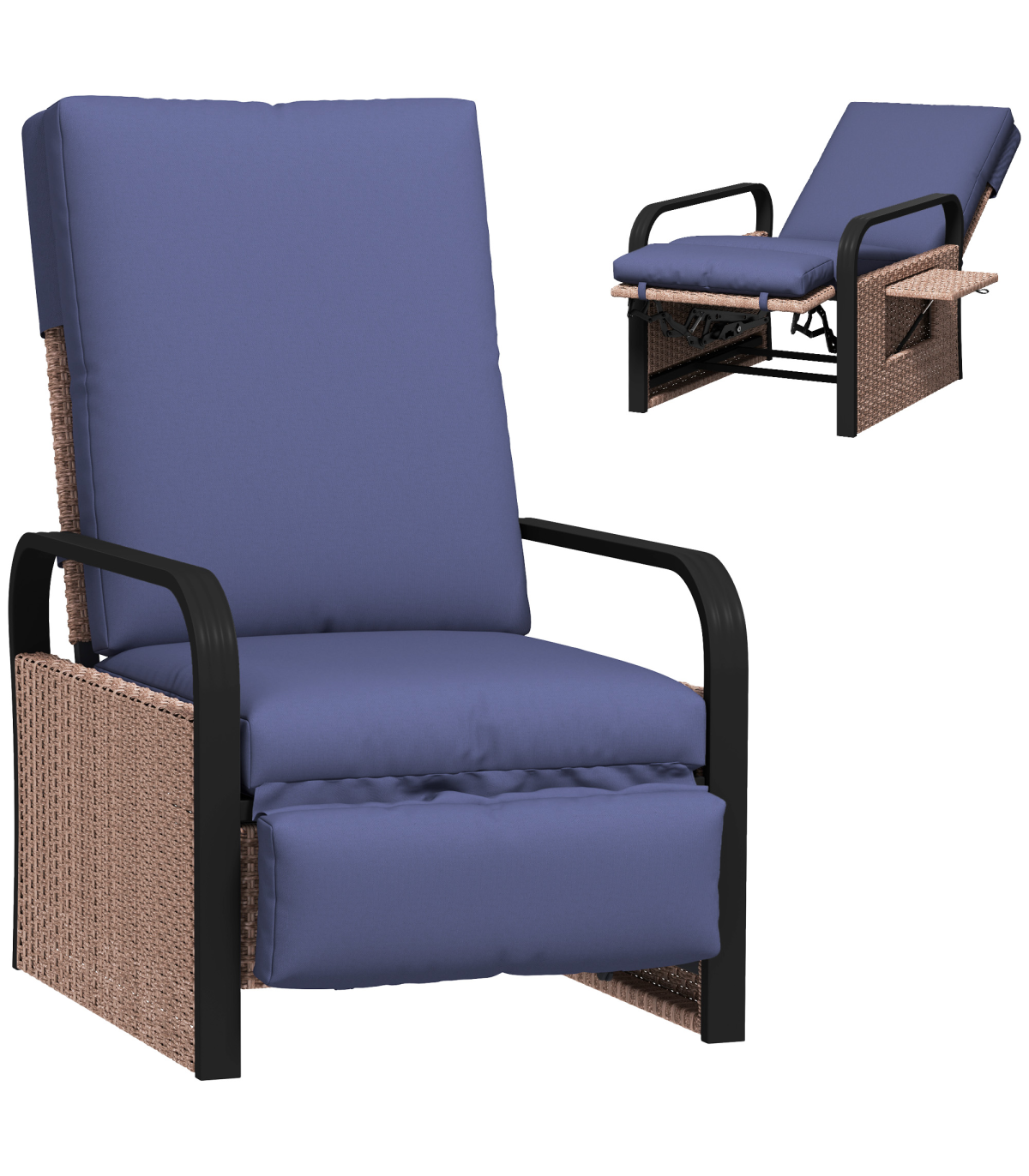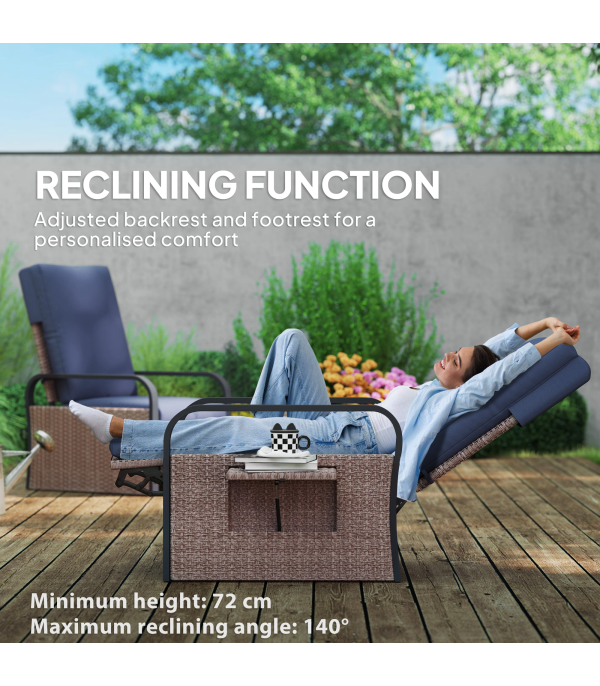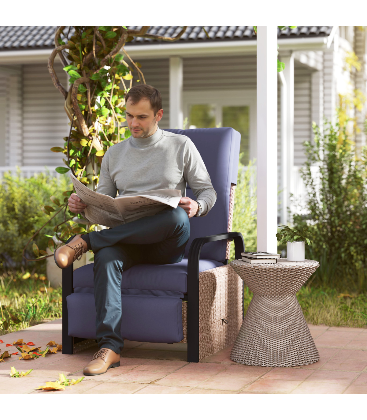 paired with the footrest to elevate the lower body. The seat comes with a thick padded cushion for plenty of comfort, complete with a handy lift-up side table.