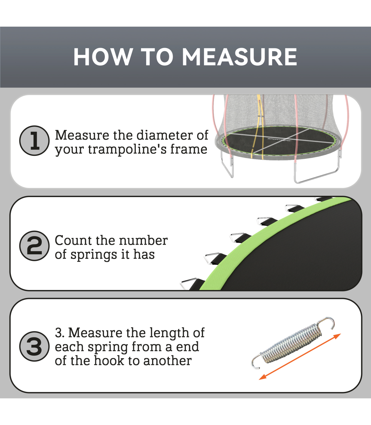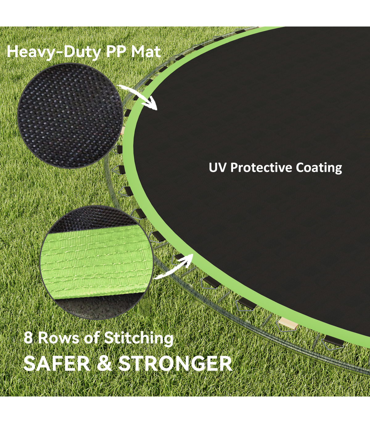 Tired of constantly replacing your trampoline mat? This SPORTNOW mat is your solution. With eight rows of heavy stitching for durability, its water-resistant PP material is easy to clean and maintain. With 42 V-rings included, it's suitable for a 8ft round trampoline using 14cm springs. Ensure a proper fit by measuring your trampoline frame, counting the number of springs and measuring the length of unstretched springs. Get ready for bigger and better jumps with this resilient mat.