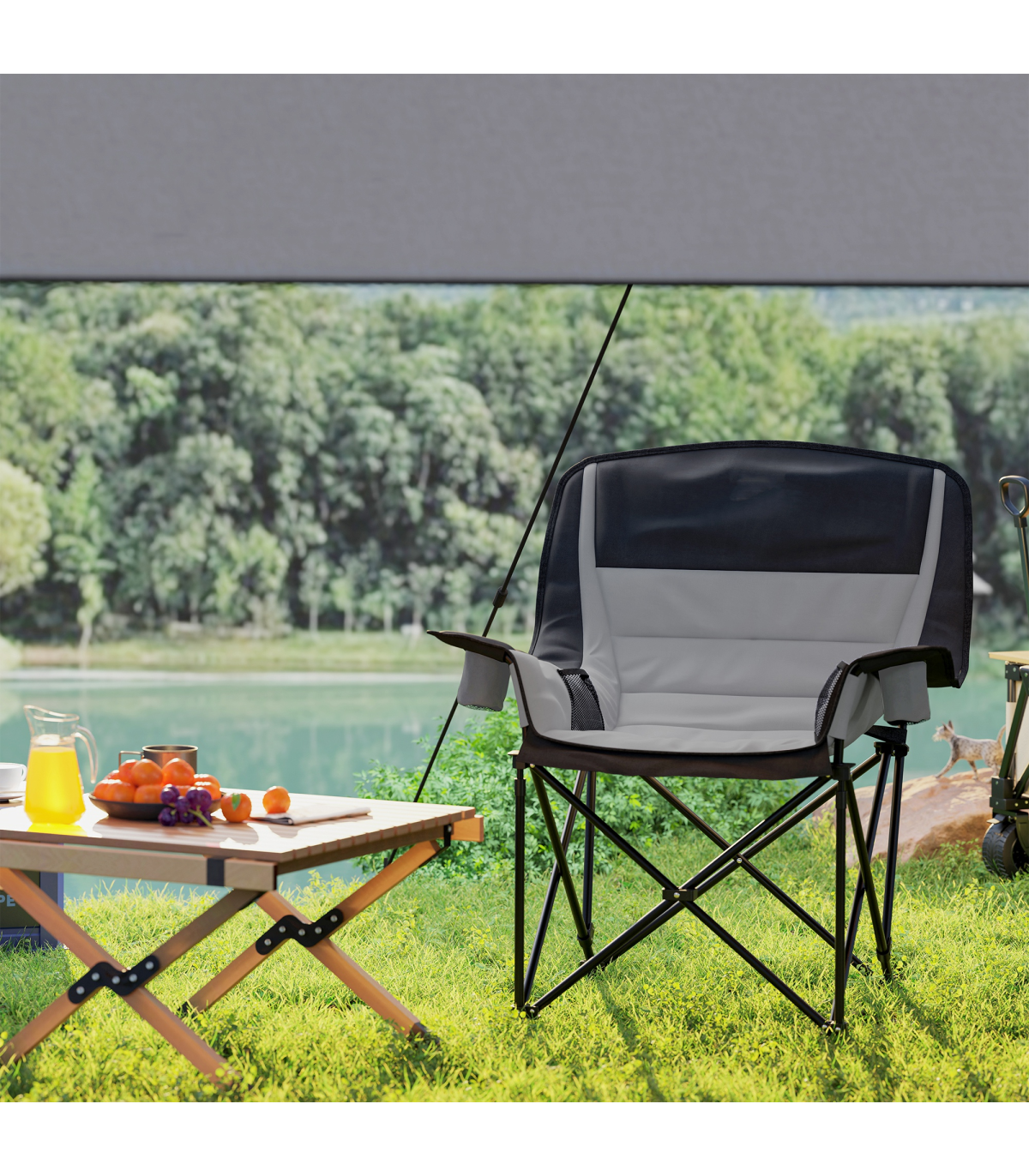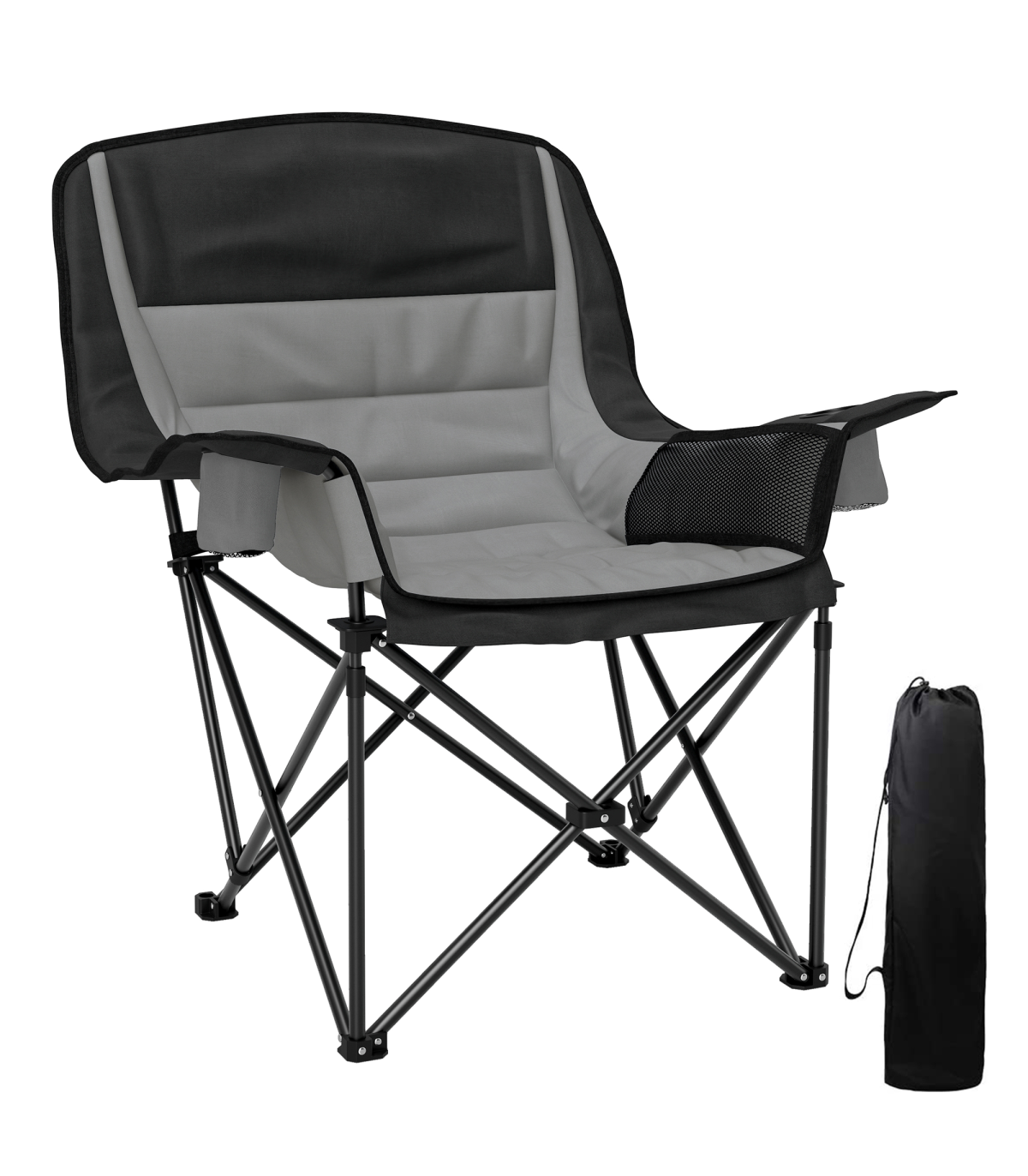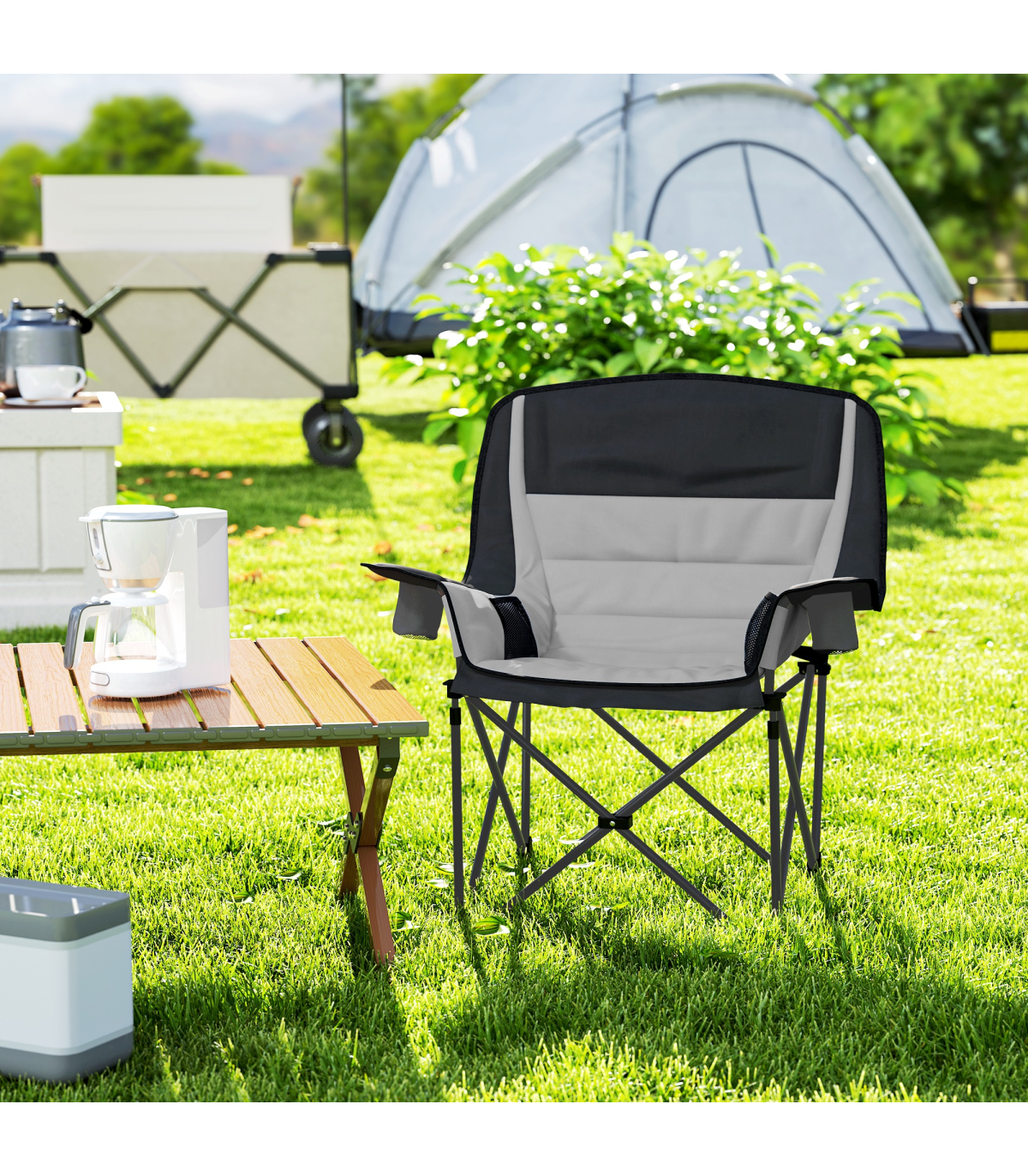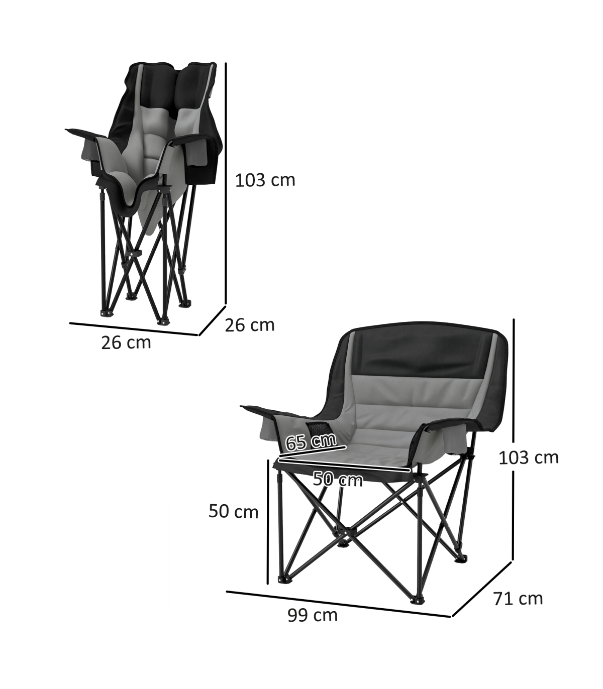 This Outsunny camping chair gives comfort to outdoor times, wherever you go. With the high density padding in the head, back, arms and seat, you'll sink in comfortably. A metal frame for a strong, supportive core, with the splash-resistant fabric seat for durability. Complete with two cup holders and side pockets. When done, all you need to do is fold it up and fit inside the included carry bag.