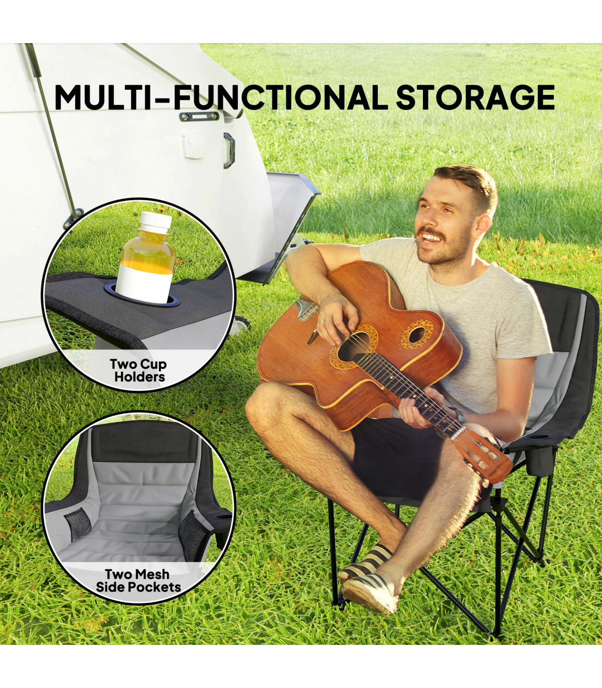 ● Two cup holders and side pockets for holding drinks and essentials