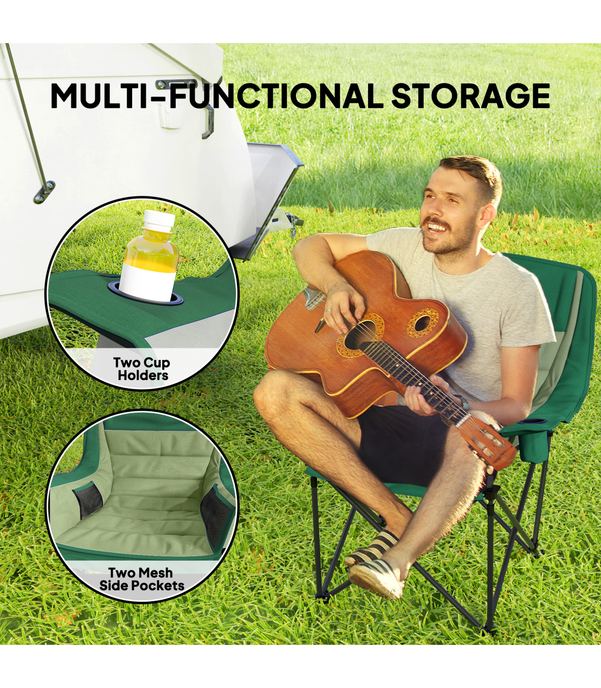 ● Two cup holders and side pockets for holding drinks and essentials