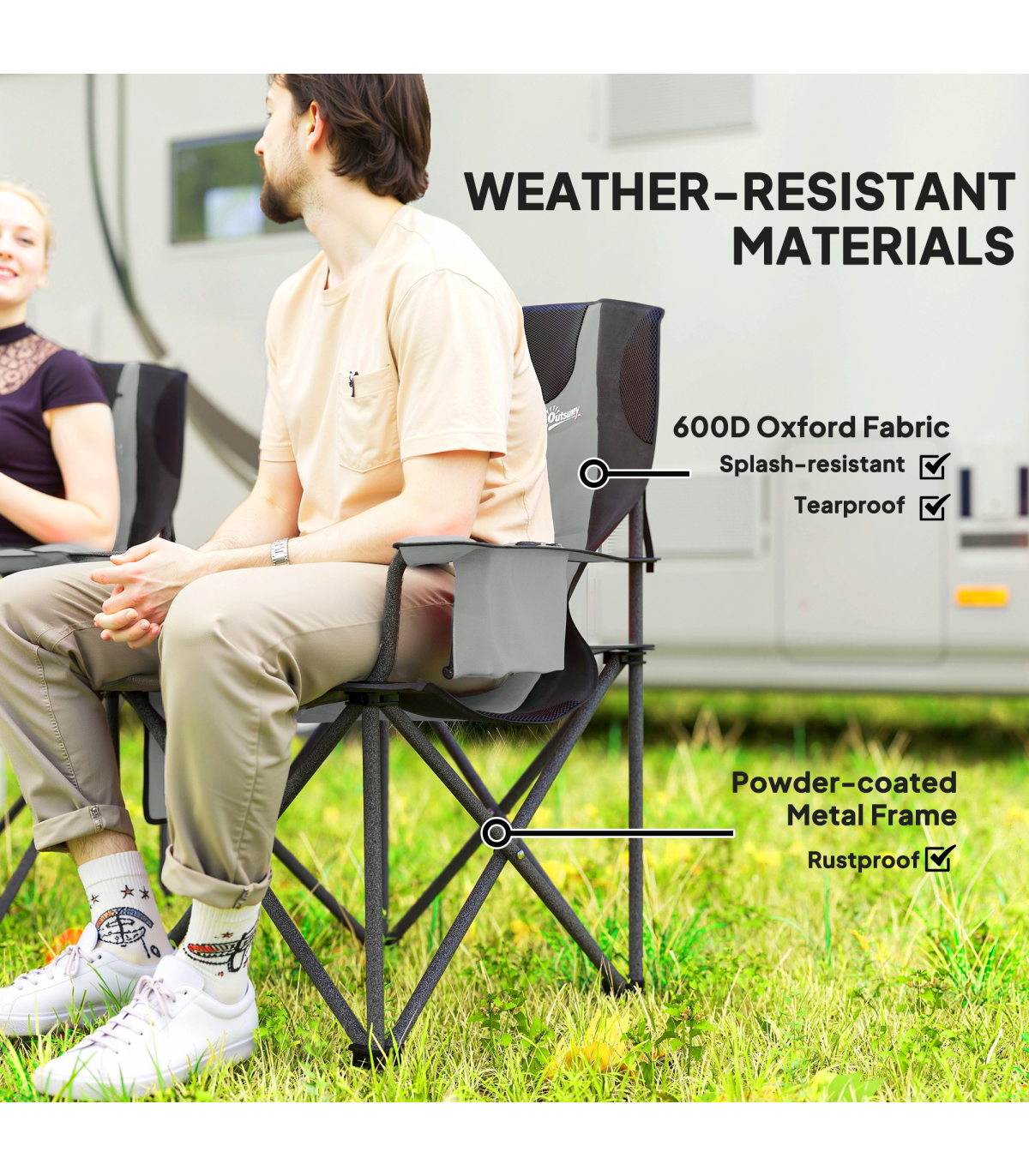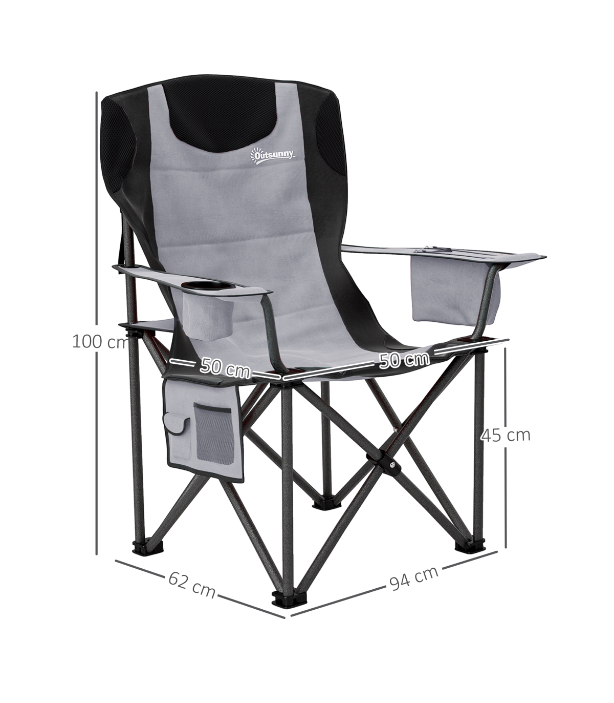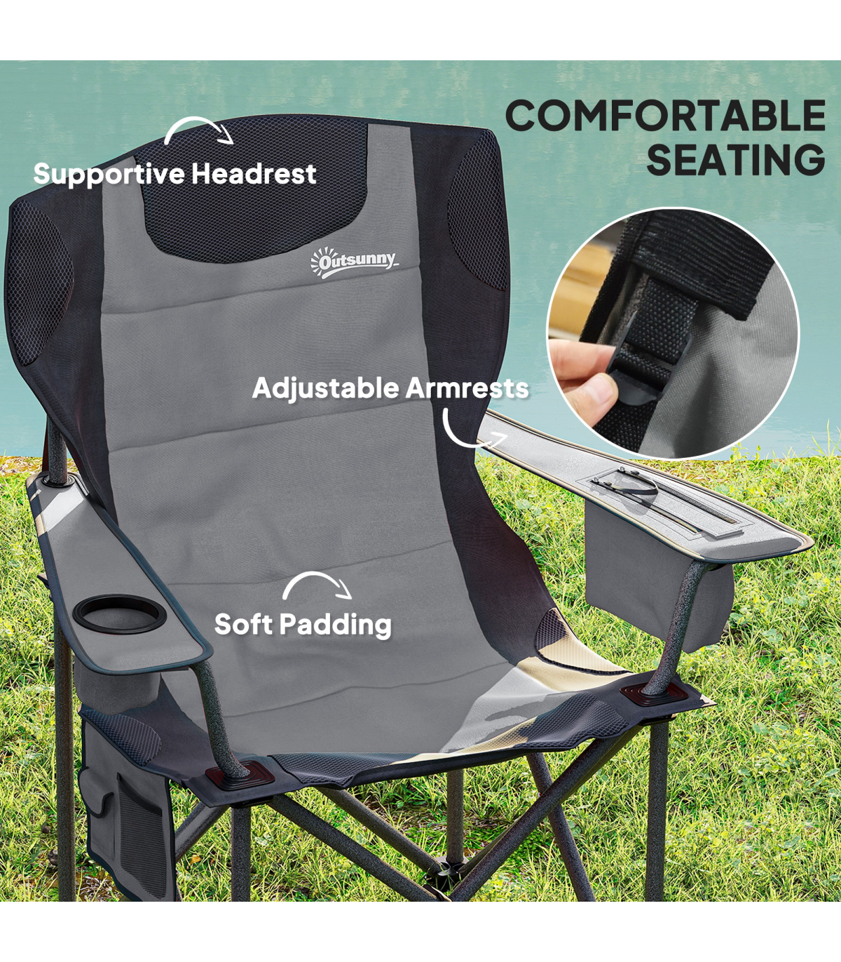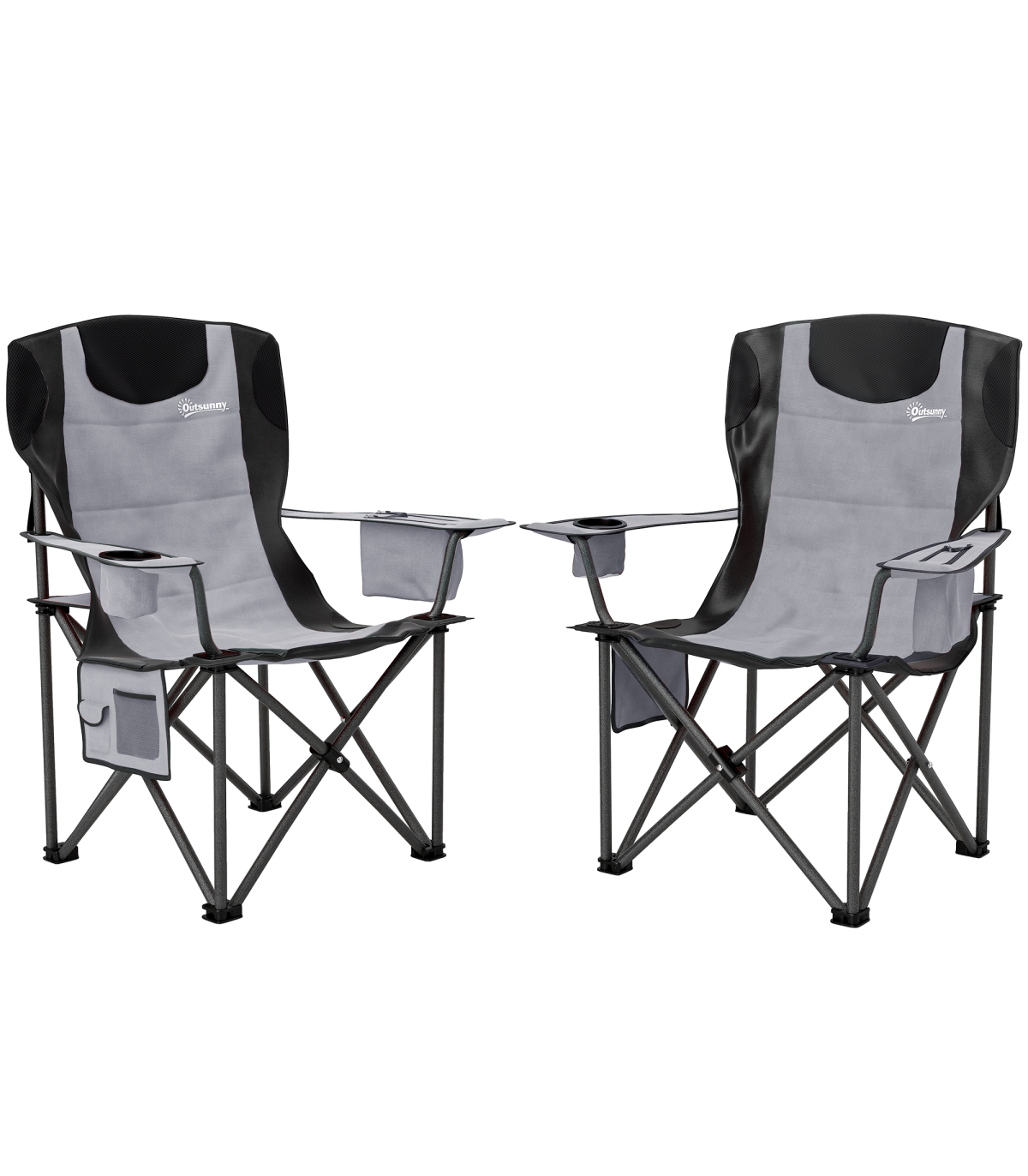 Discover the comfort of the Outsunny camping chairs for adults, a set of 2 that transforms any outdoor sitting into a comfortable retreat. Enjoy the luxury of a supportive headrest and full padding, crafted with a robust metal frame and splash-resistant Oxford fabric. Complete with a cup holder and cooler bag, our folding chairs are your go-to for effortless outdoor relaxation.