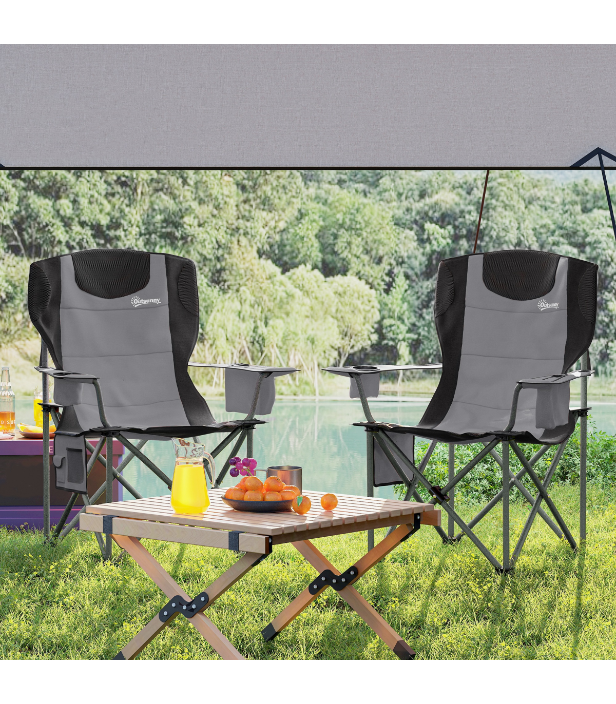 Outsunny Set of 2 Padded Folding Picnic Chairs with Cooler Bag, Grey
