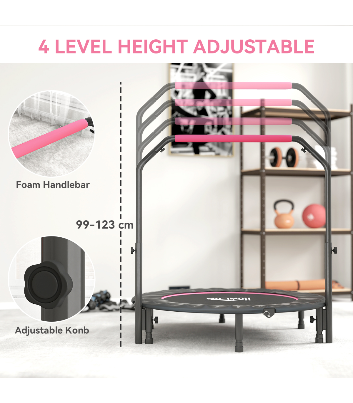 ● Four-level adjustable handlebar, providing flexibility when bouncing