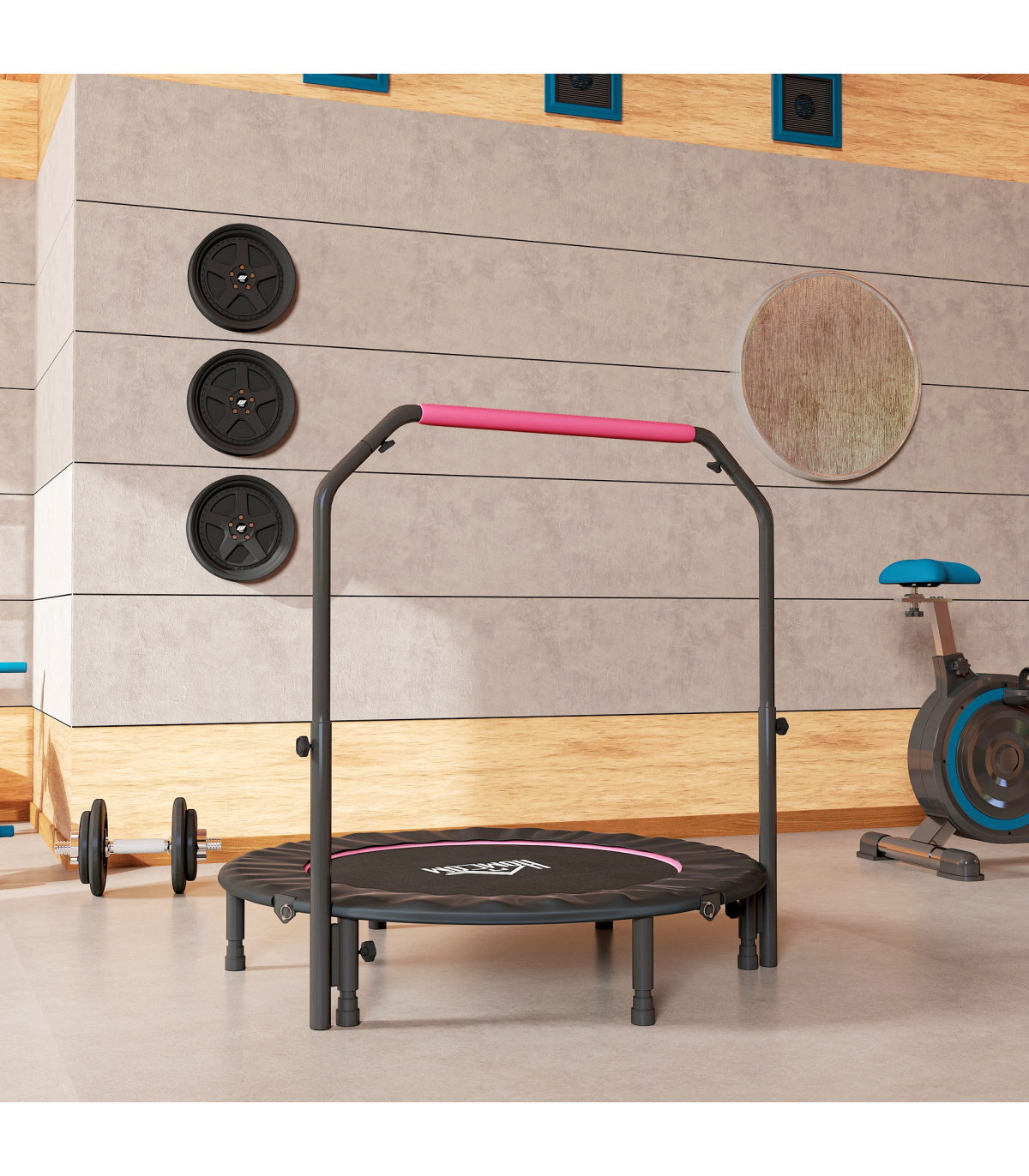 Aerobic workouts have never been better, thanks to this HOMCOM folding trampoline. There's a full range of exercises, which helps build muscle strength and lose weight. Made with a steel frame, it can support up to 100kg, whilst the adjustable handlebar gives you something to hold, keeping you balanced – it also has six legs underneath for extra stability. Once finished, fold the trampoline to save space when storing. When folded, it can be carried, so you can exercise anywhere with ease.