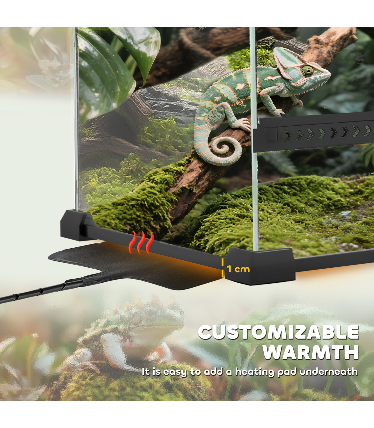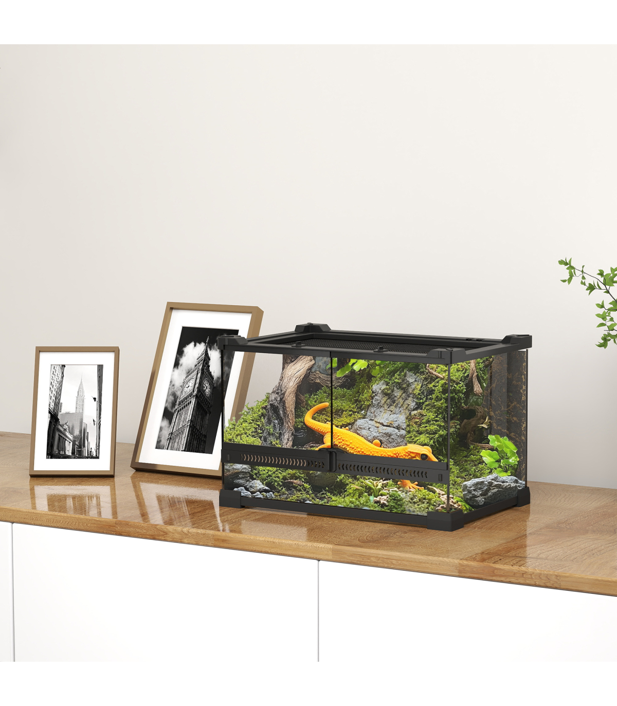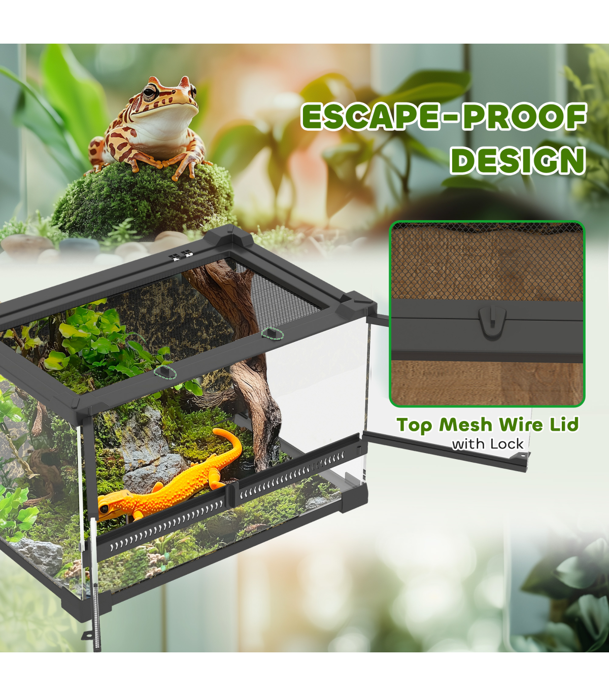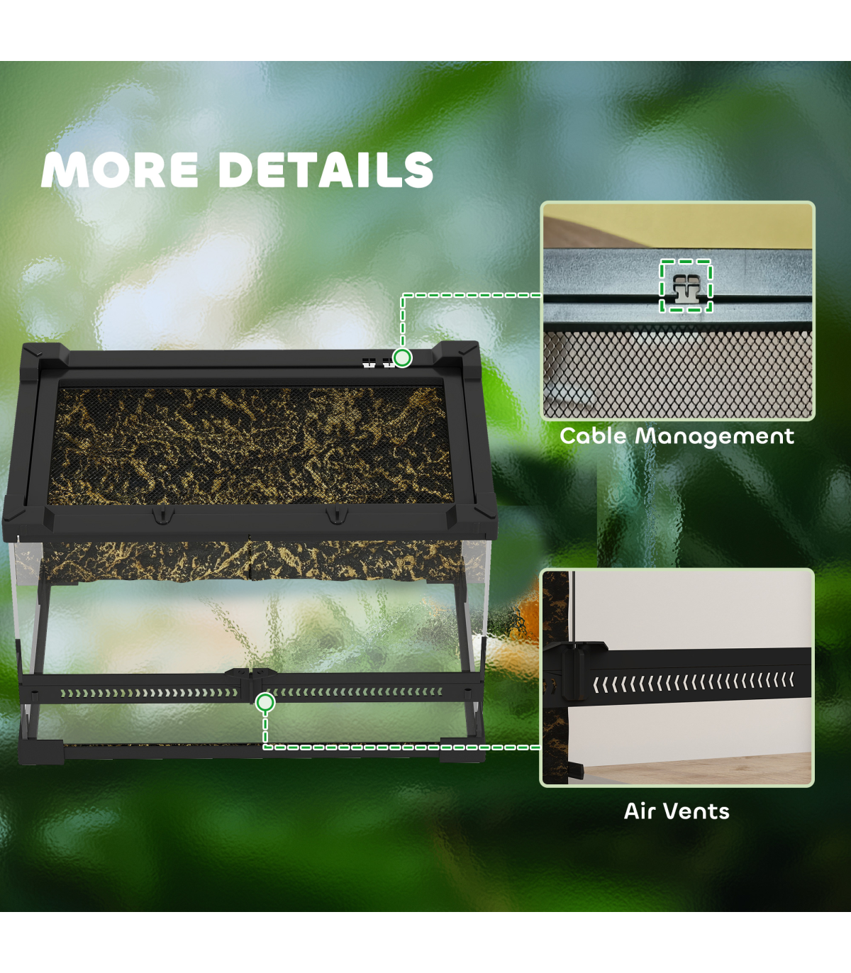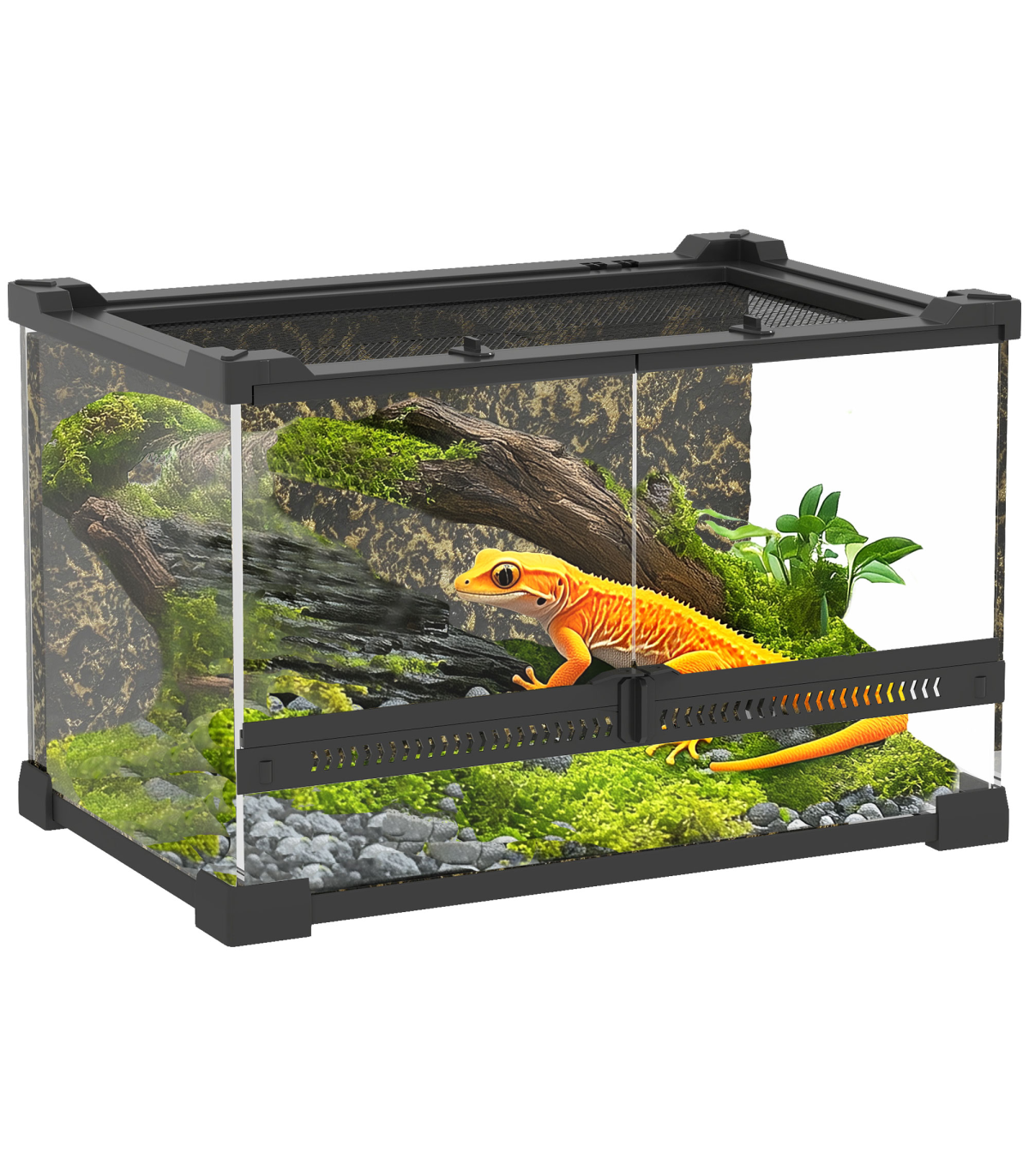 A stylish glass vivarium designed for clear viewing of your reptile's habitat. The front-opening door includes a secure knob lock to prevent escapes, while the ventilated mesh top ensures consistent airflow. Suitable for lizards, snakes, frogs, turtles, tortoises and other reptiles, it features a textured rock background that supports naturalistic landscaping, creating a space that mimics their natural surroundings.