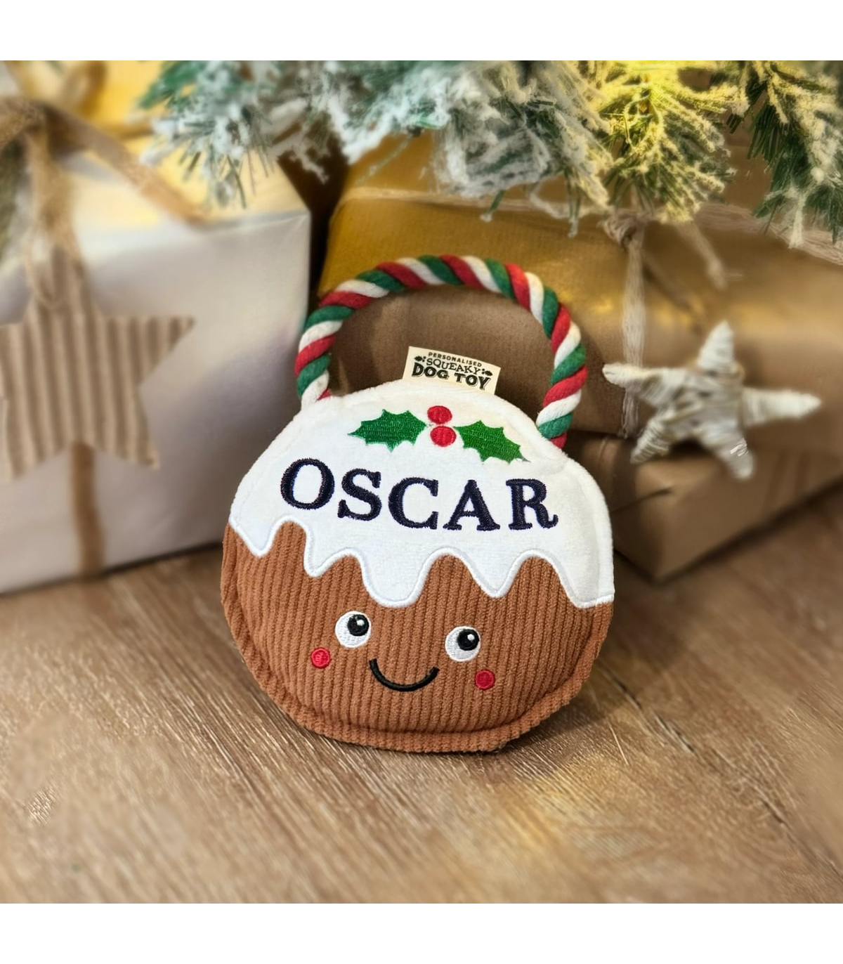 Pre-personalised Christmas Pudding Squeaky Dog Toy Gift - Oscar