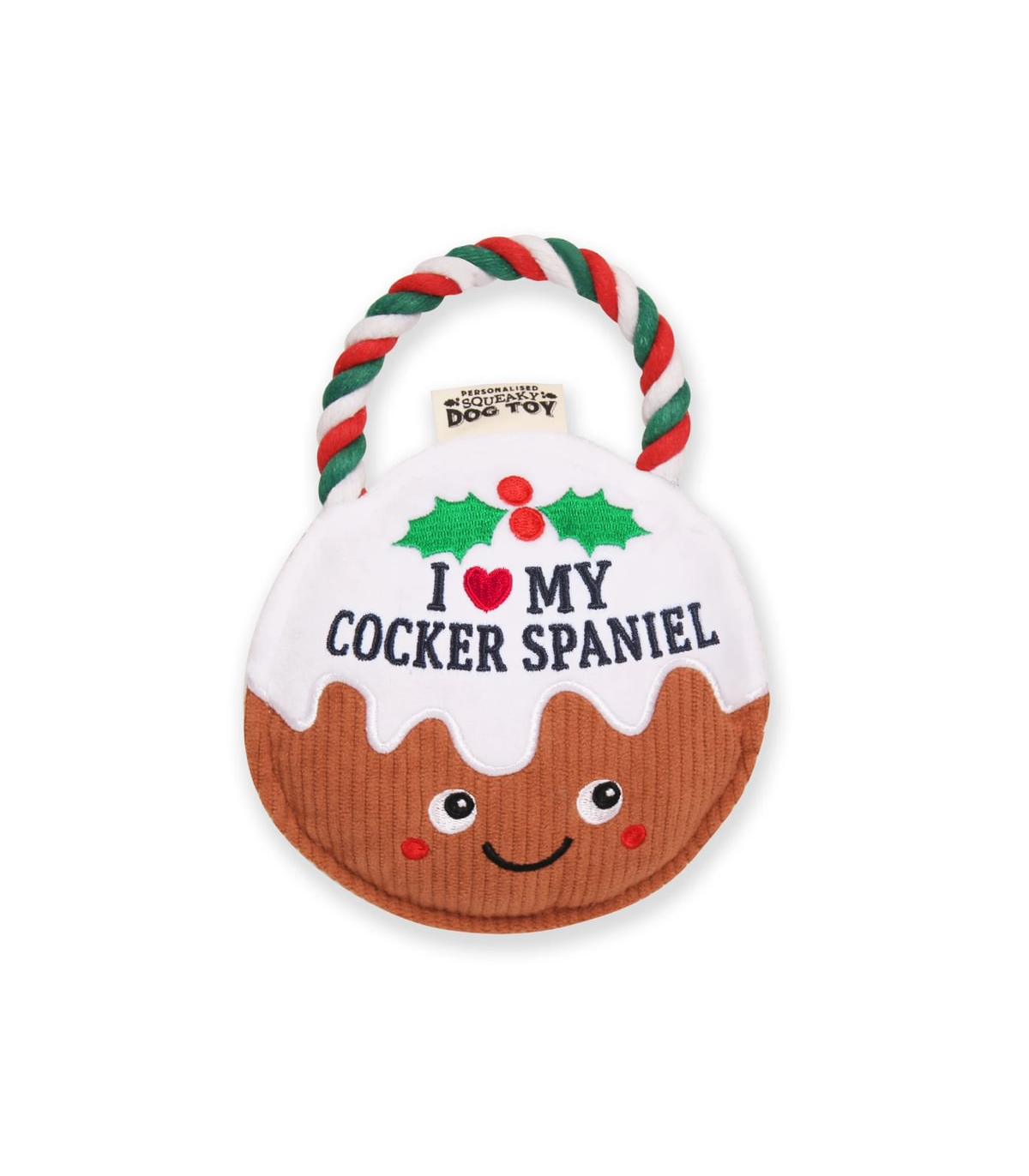 Pre-personalised Christmas Pudding Squeaky Dog Toy Gift - I love my Cocker Spaniel