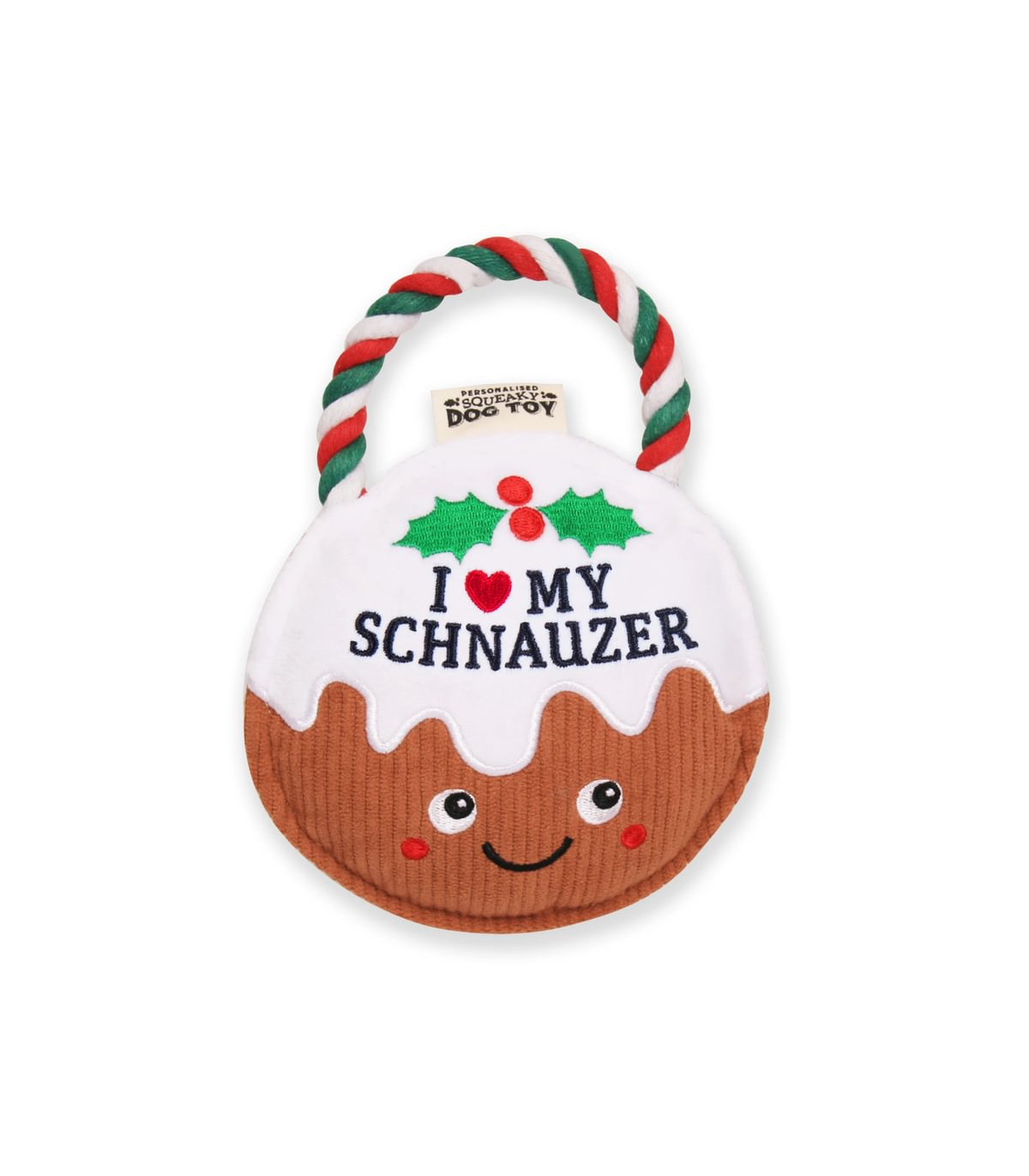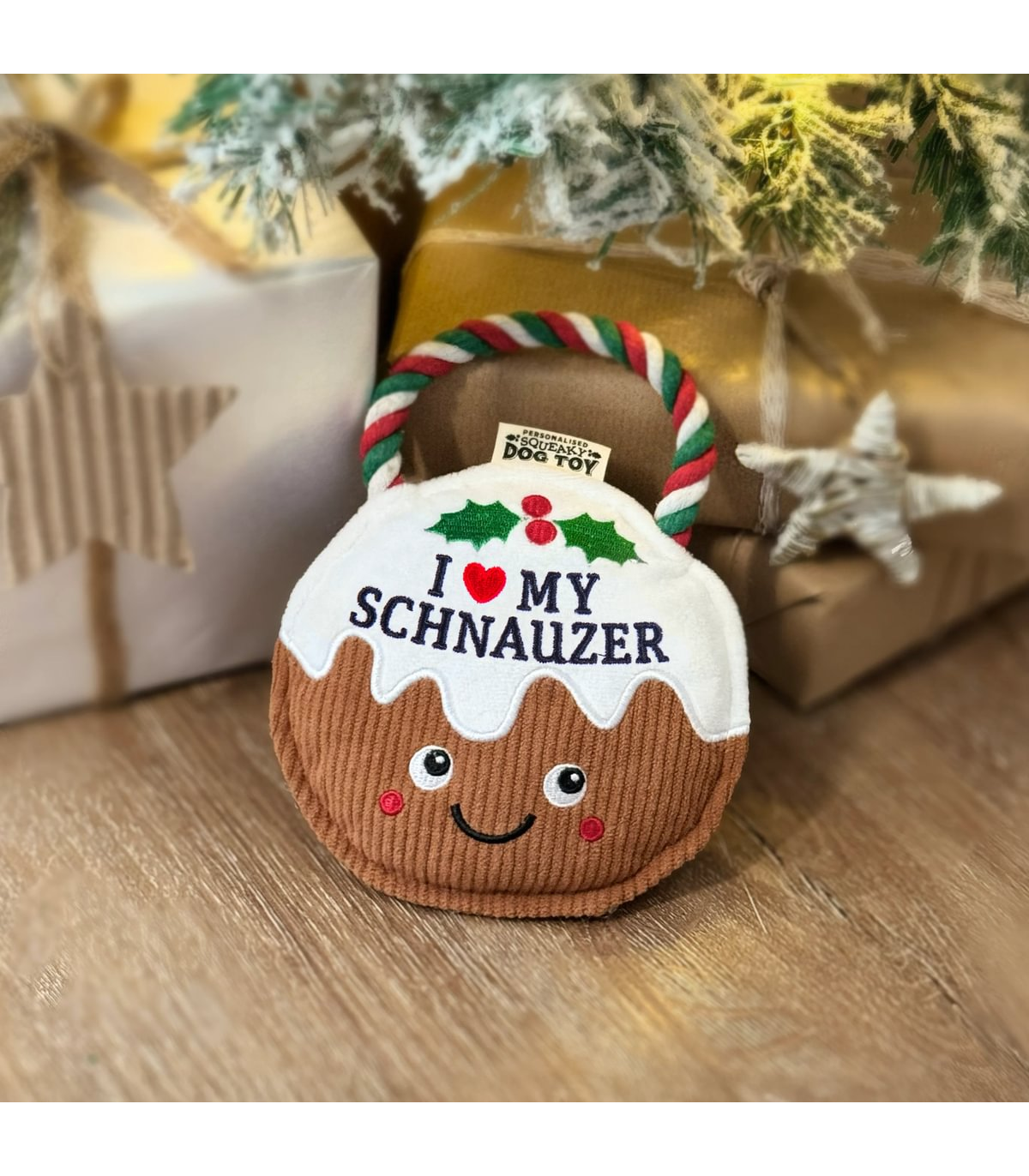 Pre-personalised Christmas Pudding Squeaky Dog Toy Gift - I love my Schnauzer