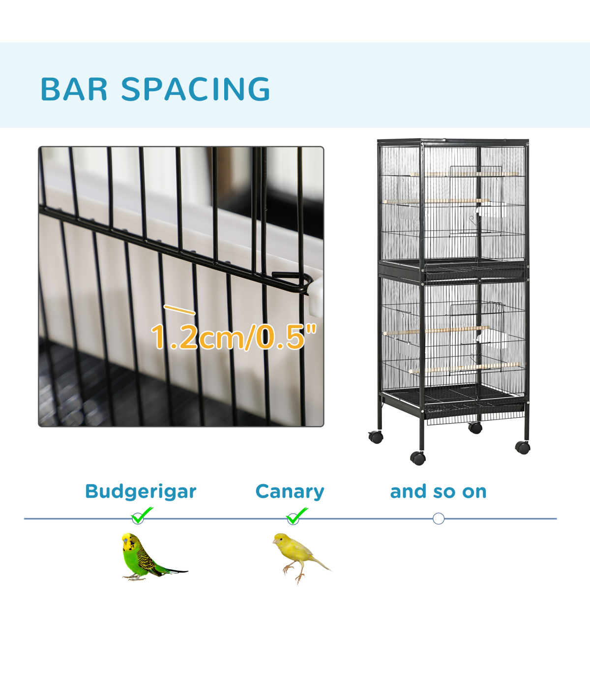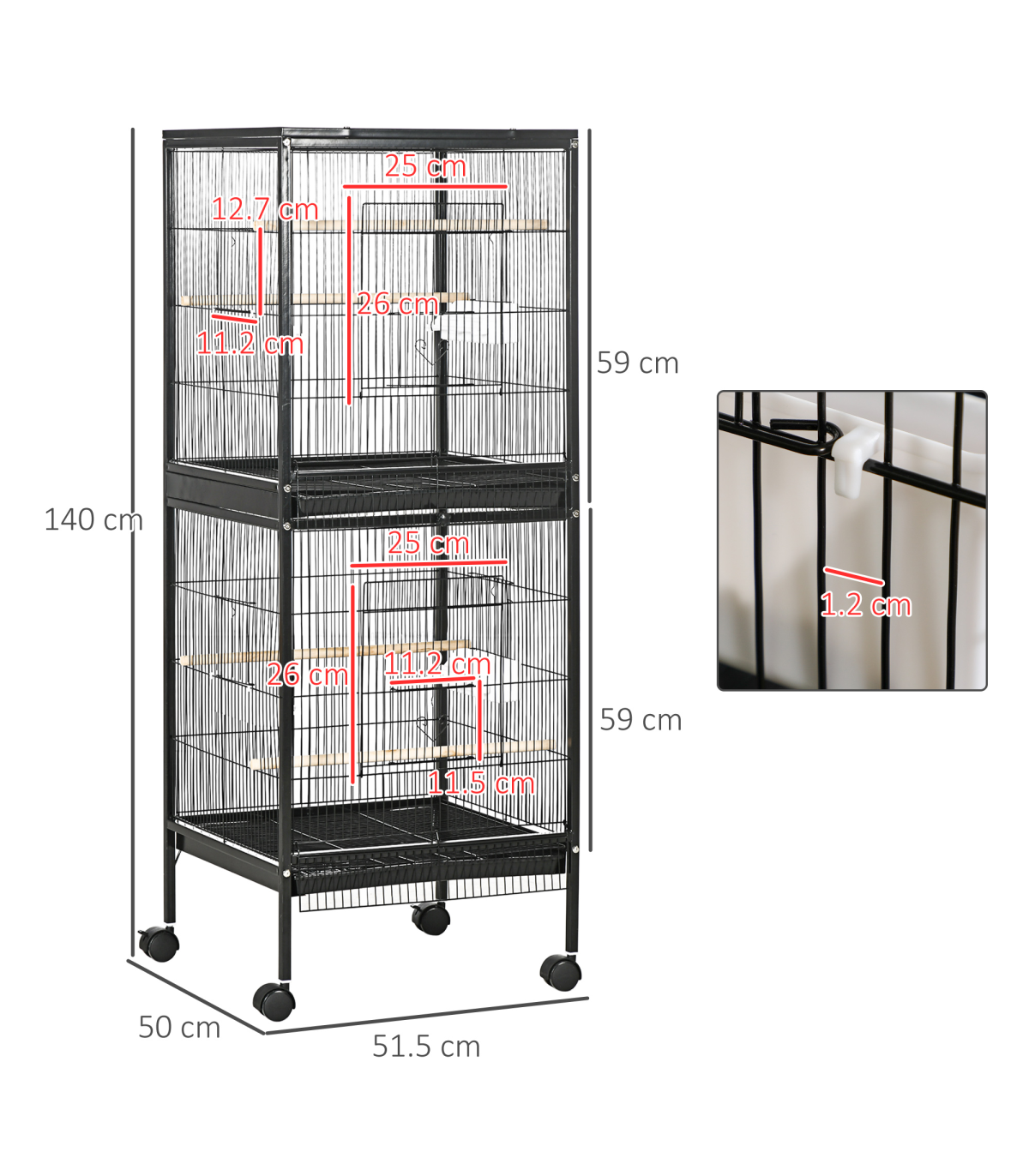 ● Dimensions: 140H x 51.5L x 50Wcm. Each layer: 59H x 52L x 50Wcm. Large front door: 25L x 26Wcm. Small front door: 11.2L x 11.5Wcm. Side door: 11.2L x 11.7Wcm. Tray: 3.5H x 48.7L x 48.7Wcm. Bar spacing: 1.2cm