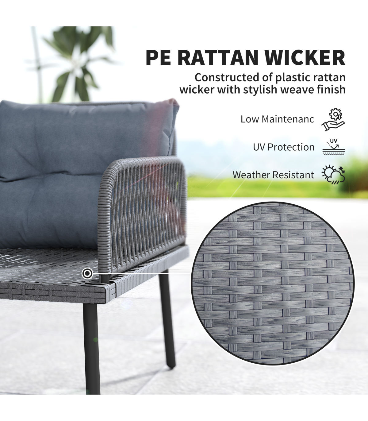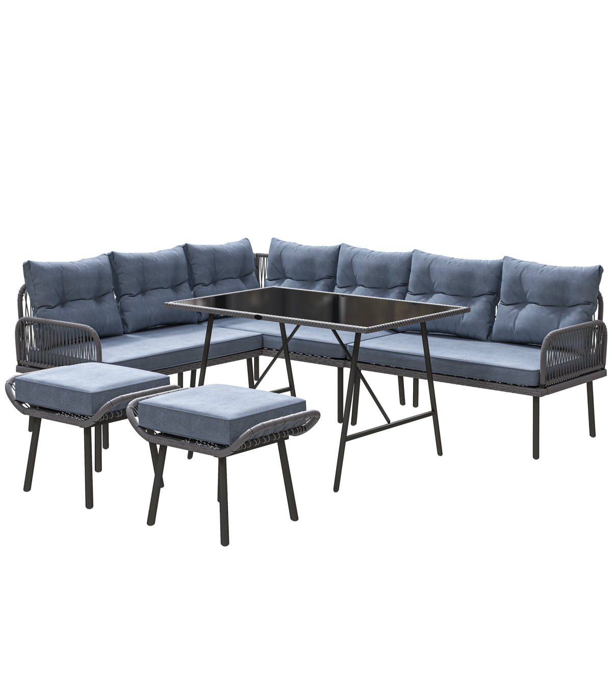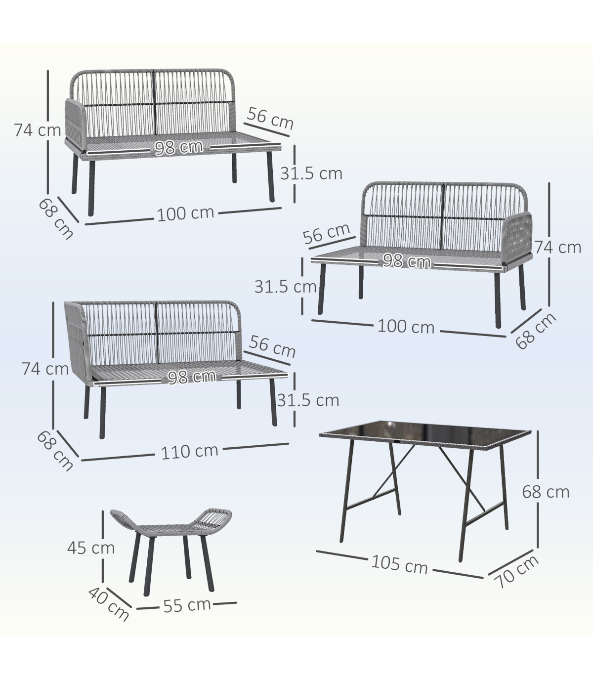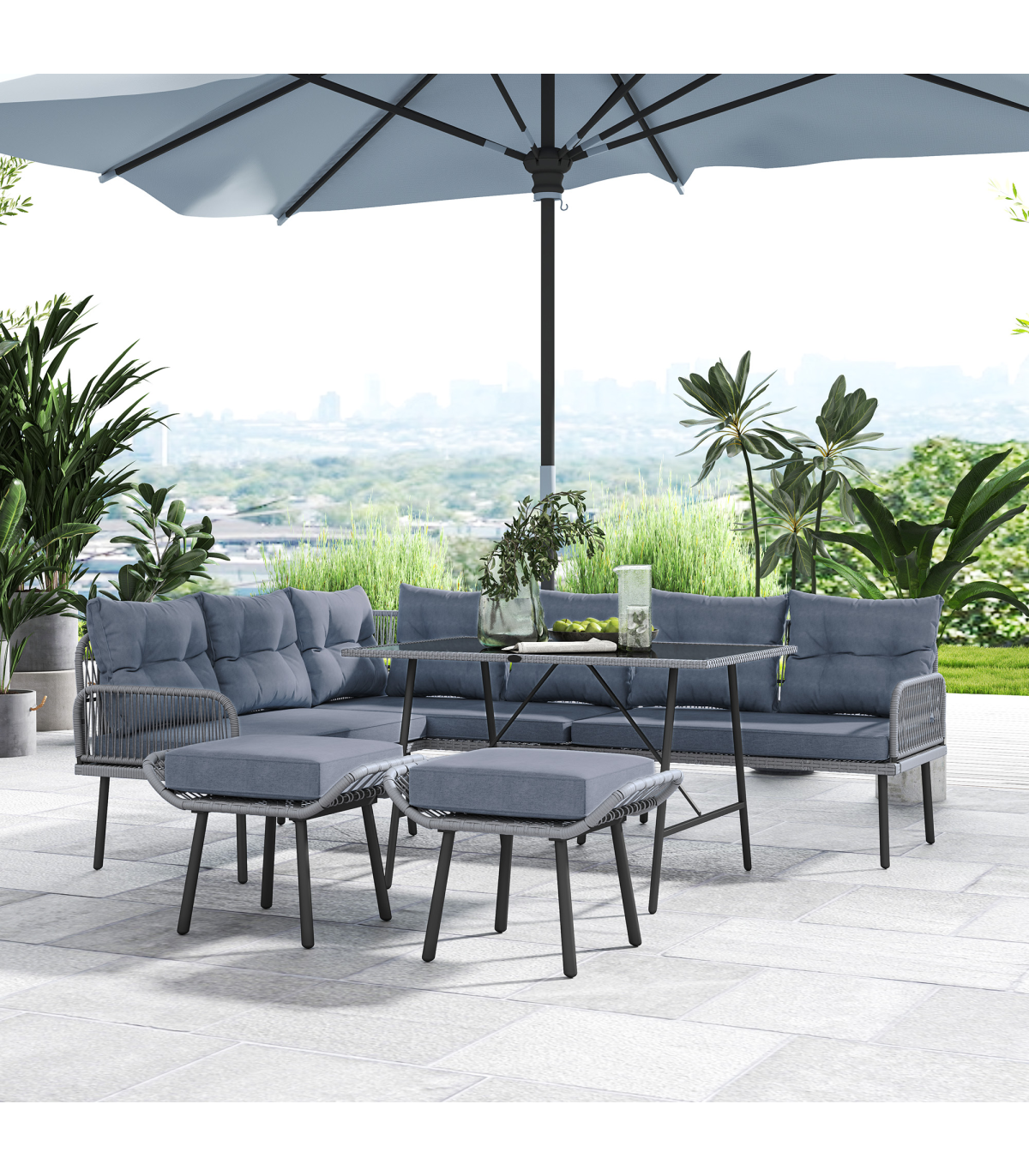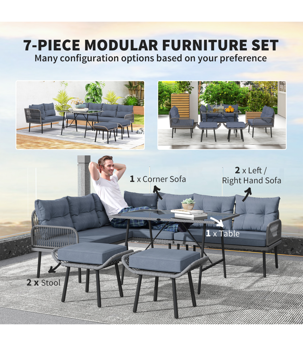 Transform your garden into a relaxing haven with the Outsunny 6-piece garden sofa set. This versatile outdoor garden furniture includes two left/right-hand sofas, a cosy corner sofa, a table and two stools, all designed for customizable configurations. Crafted with robust steel and wrapped in all-weather wicker PE rattan, paired with plush cushions, it's a great choice for outdoor lounging.