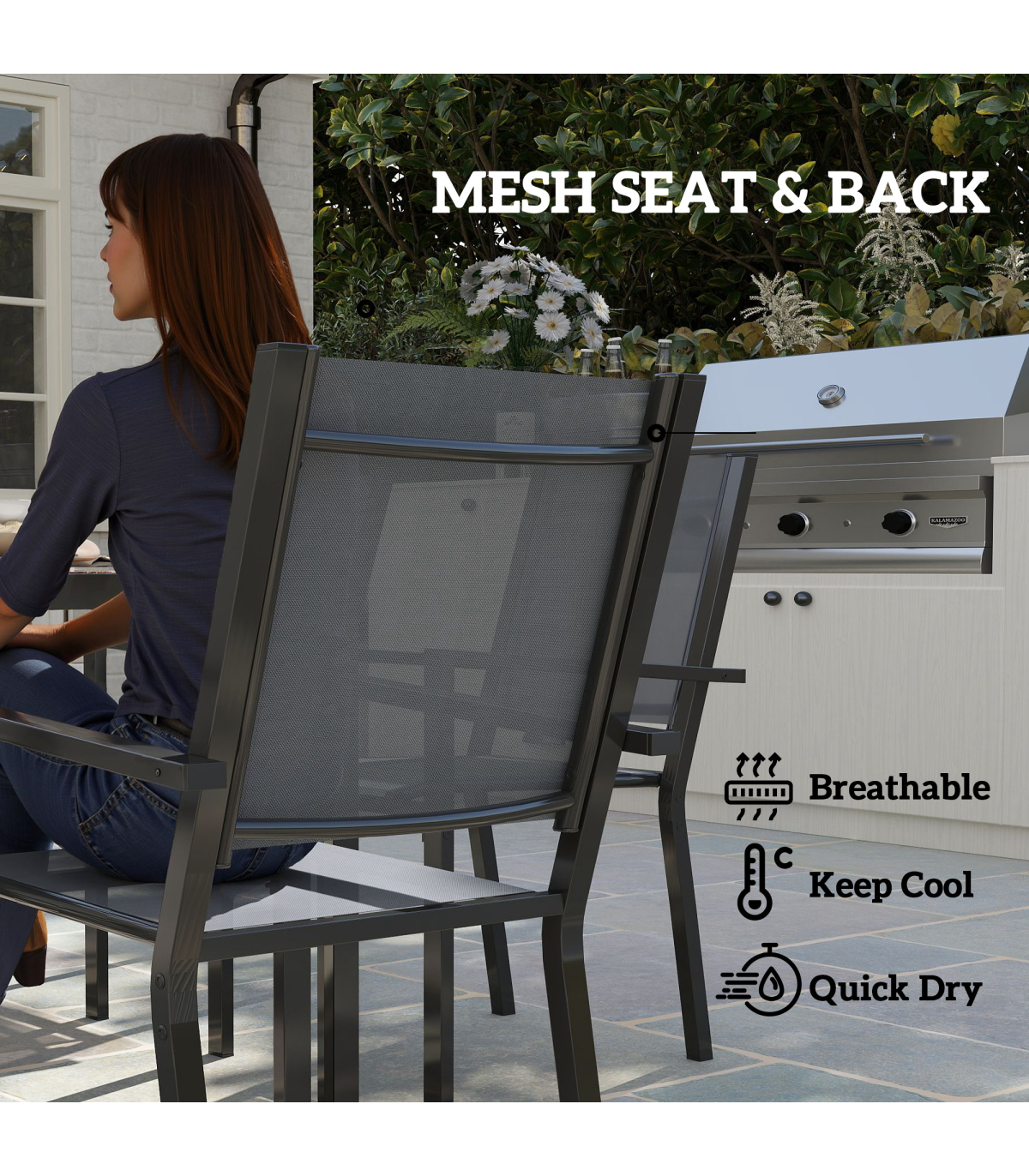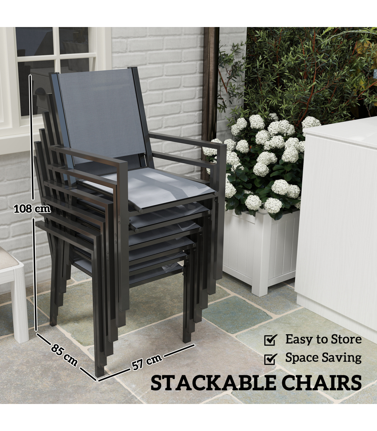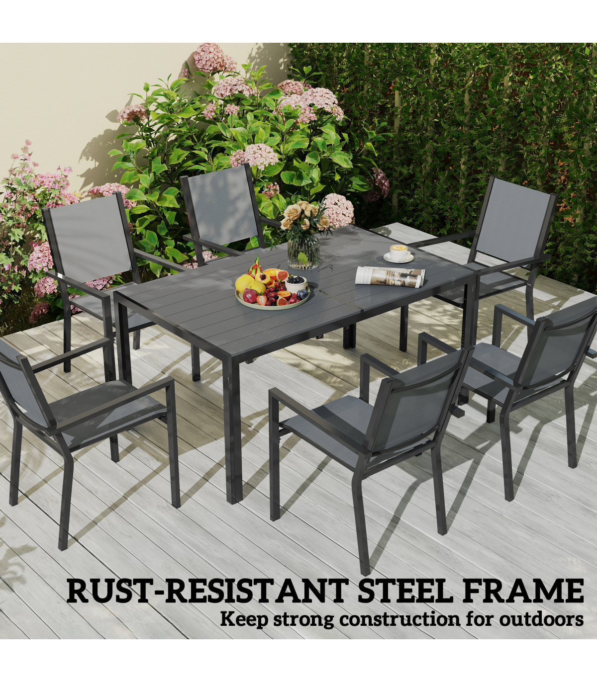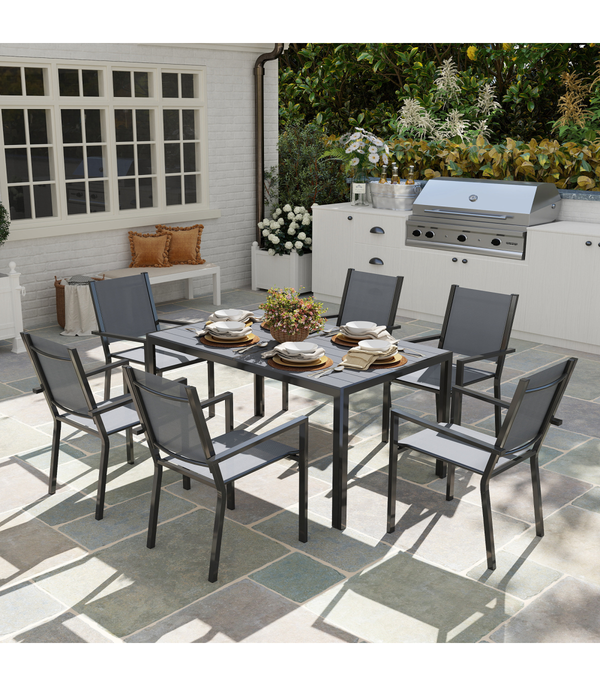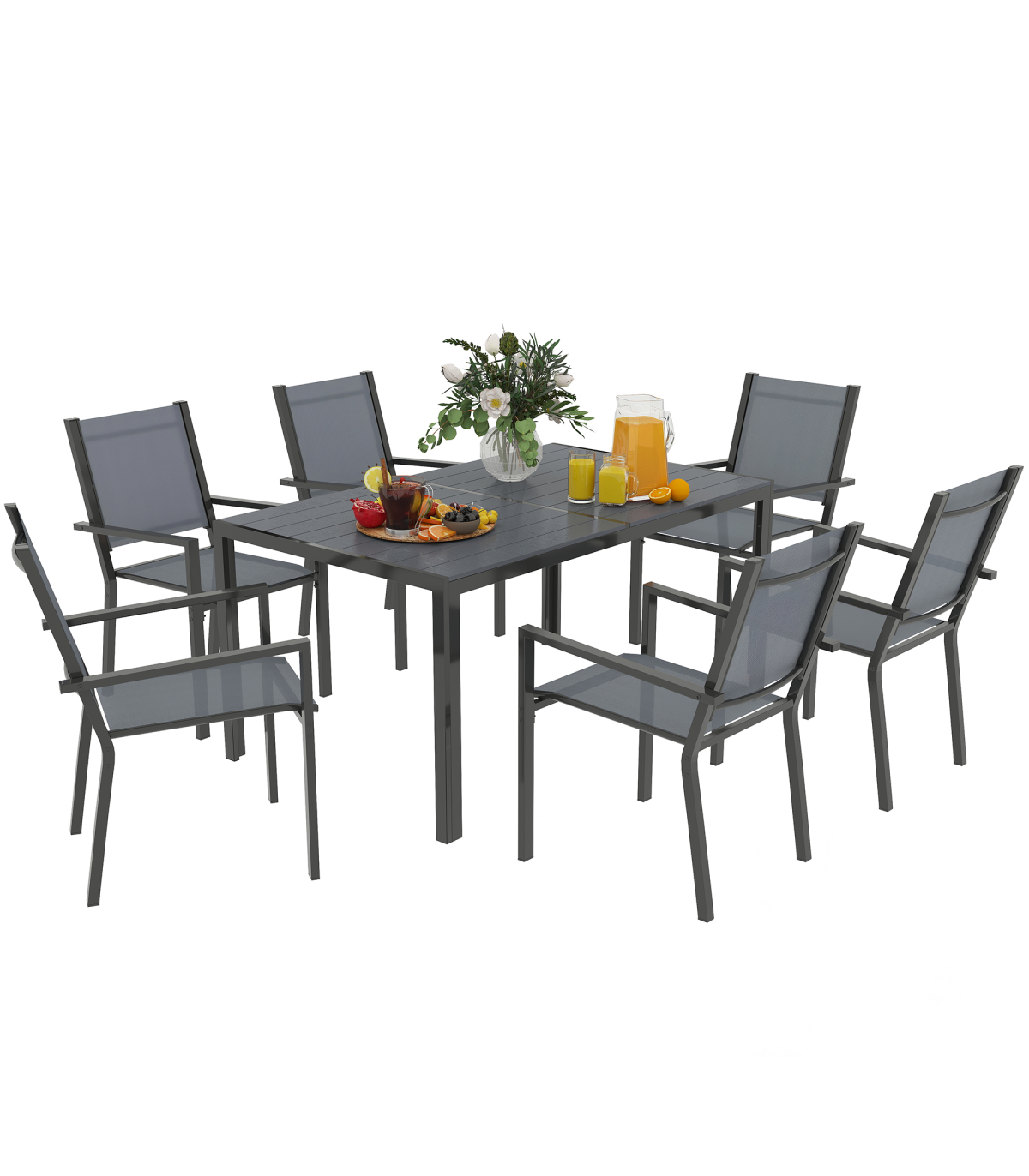 ● Seven-piece balcony furniture set includes a rectangular table and six chairs