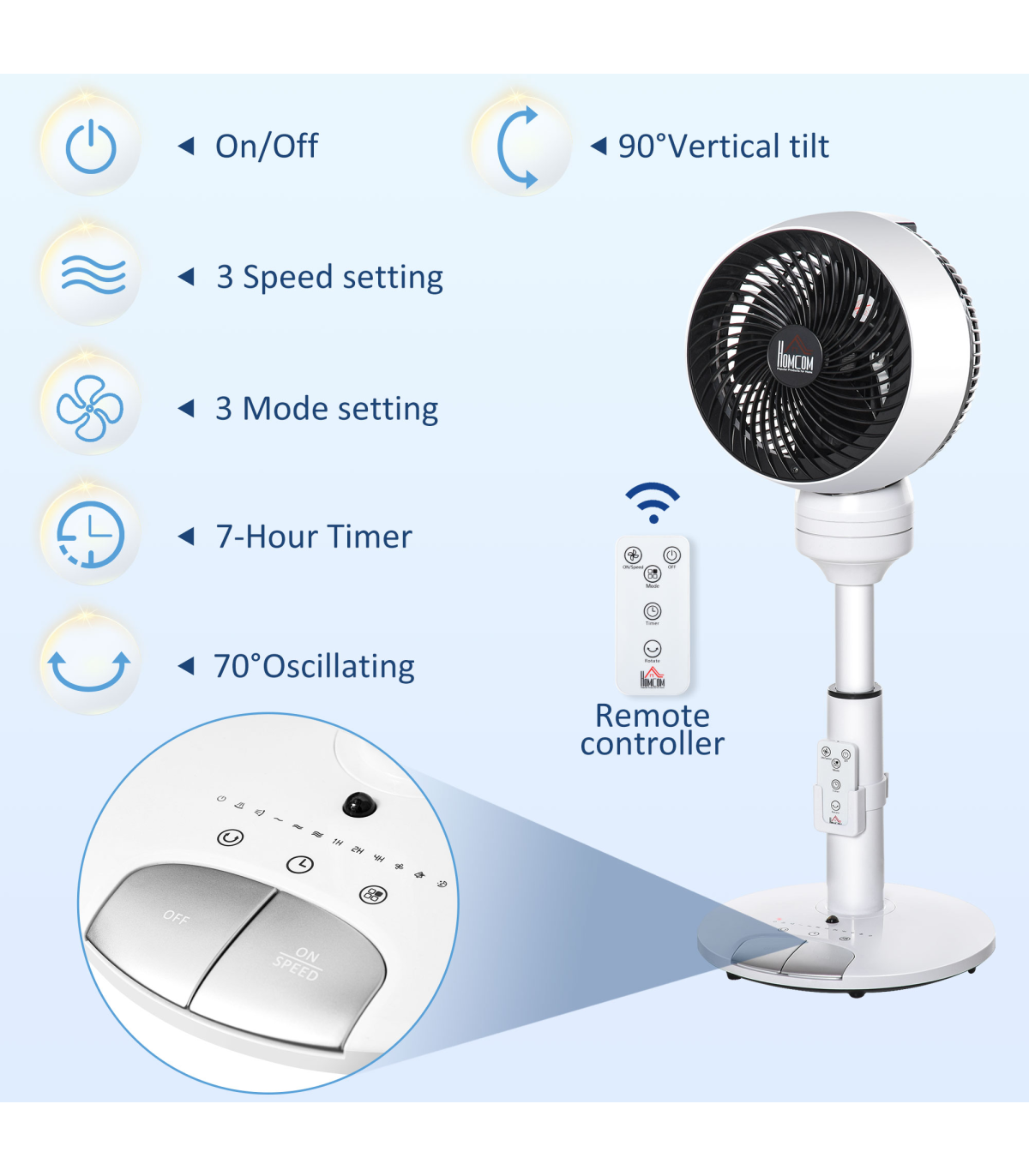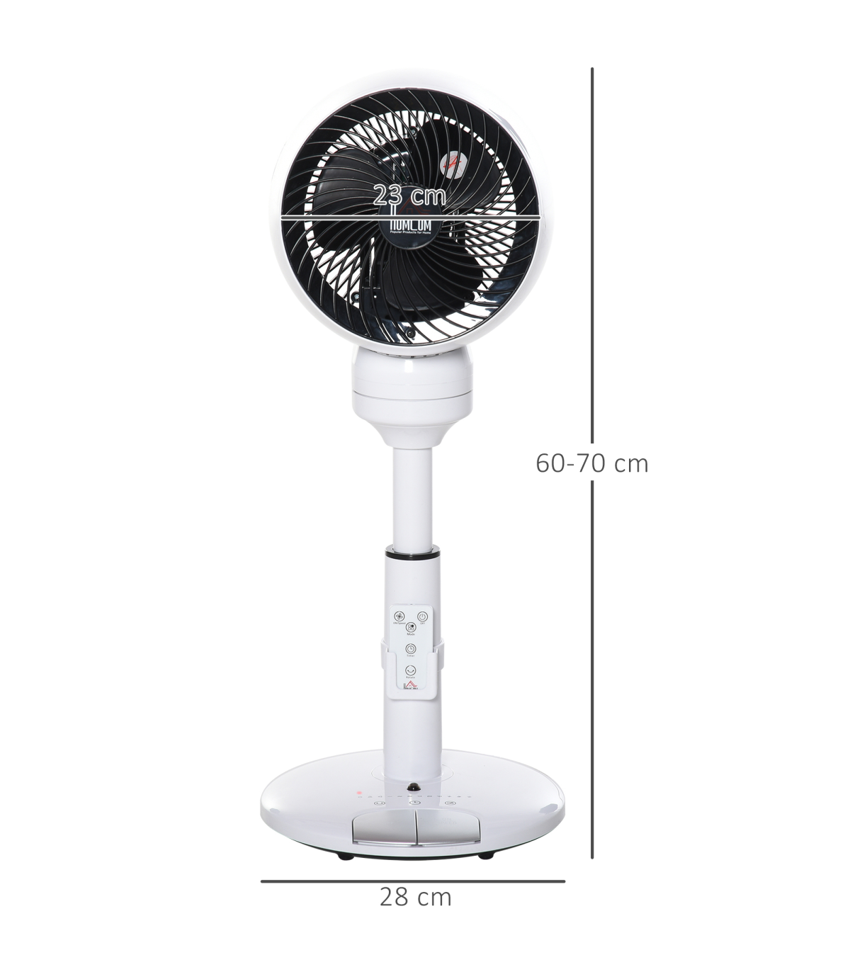 Stay comfortably cool during those hot summer afternoons and nights with this fan from HOMCOM. It is easy to use and perfect for home and office use. It features three variable speed settings and modes for personalised comfort. The 70� oscillation, 90� vertical tilt and 360� rotation allow you to direct air to a specific point. A maximum seven hour timer is perfect for night bedroom use. It's finished with a carry handle and also comes with a remote.
