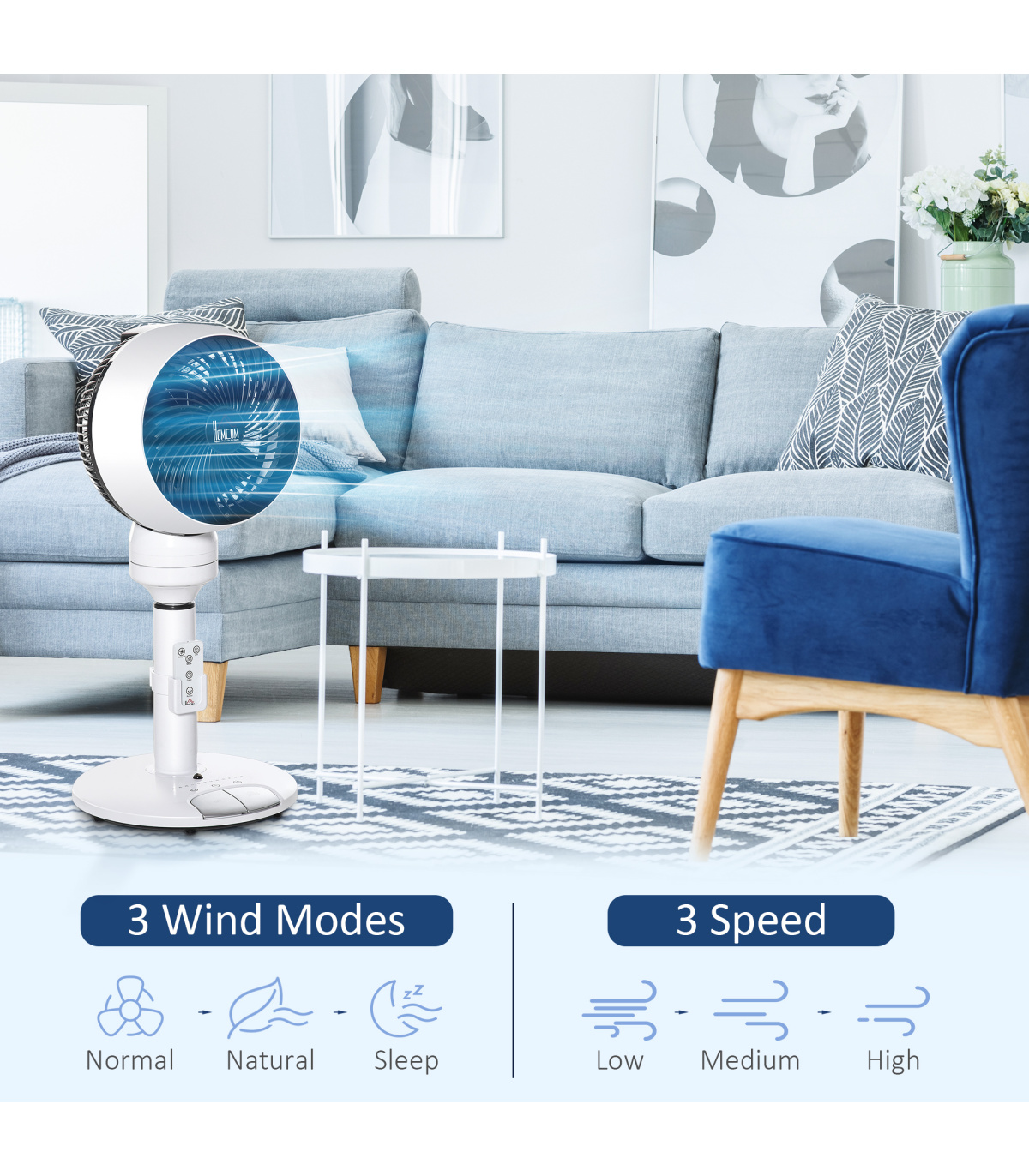 - Switches between low, medium and high speeds, as well as between sleep, natural and normal mode