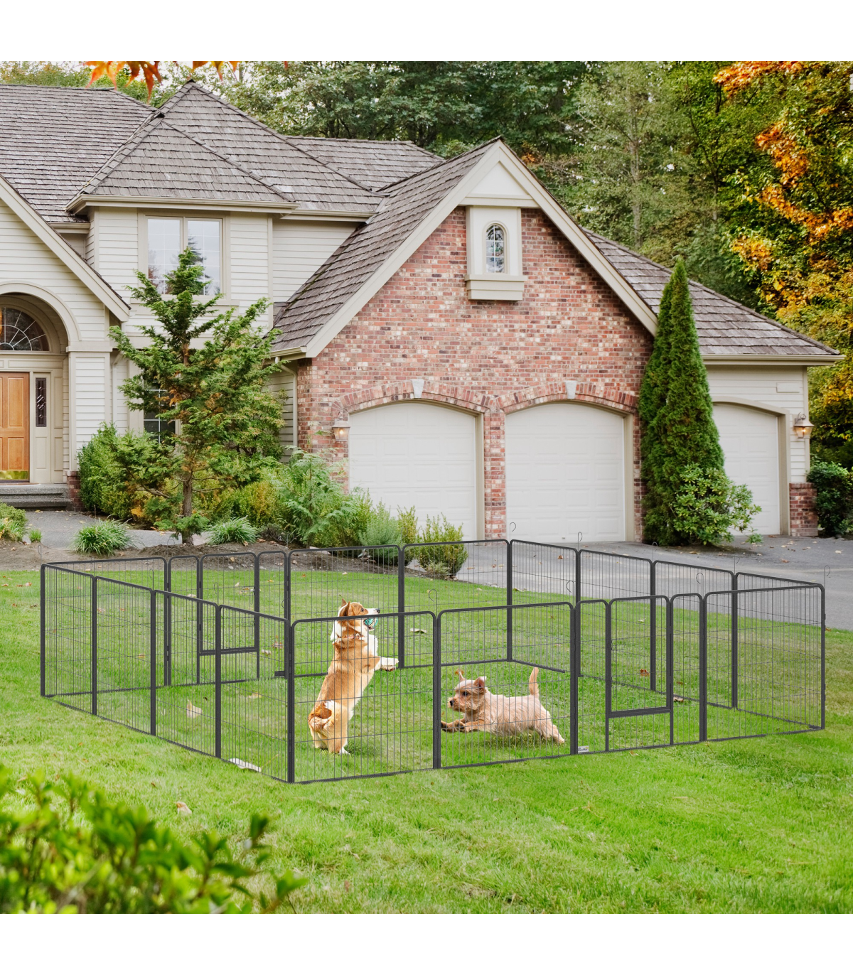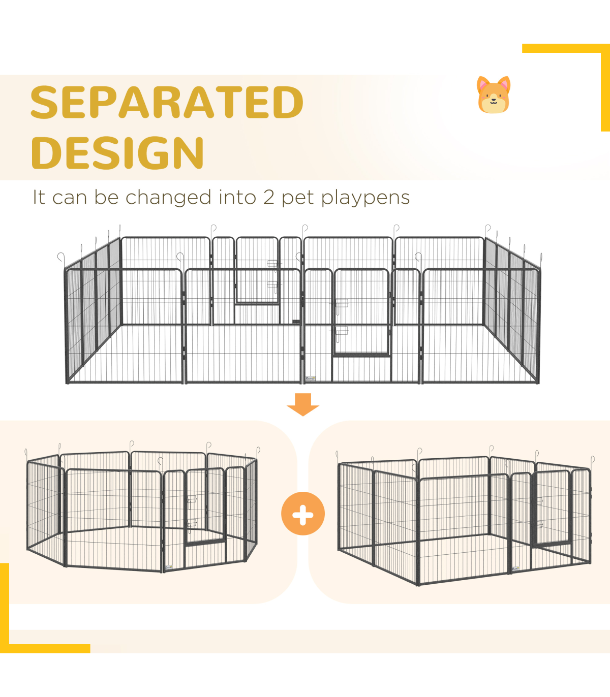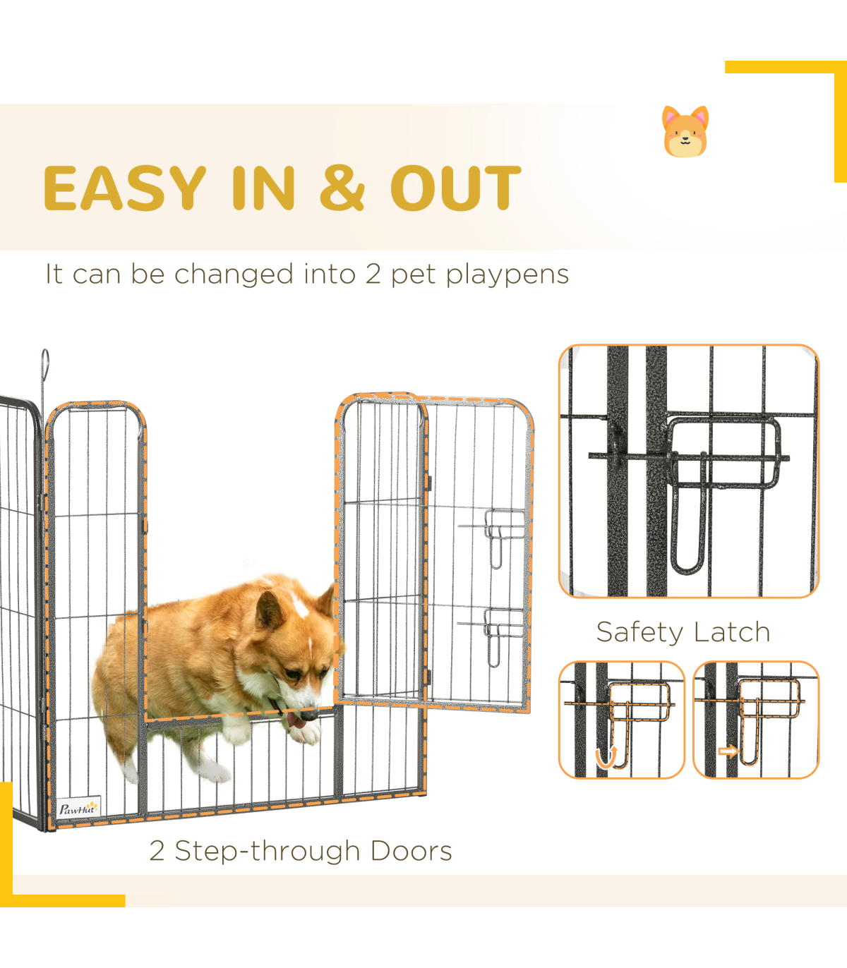 - Steel frame: Durable dog pen for indoor and outdoor use. Includes step-through doors for easy access. Locks keep pets securely inside.