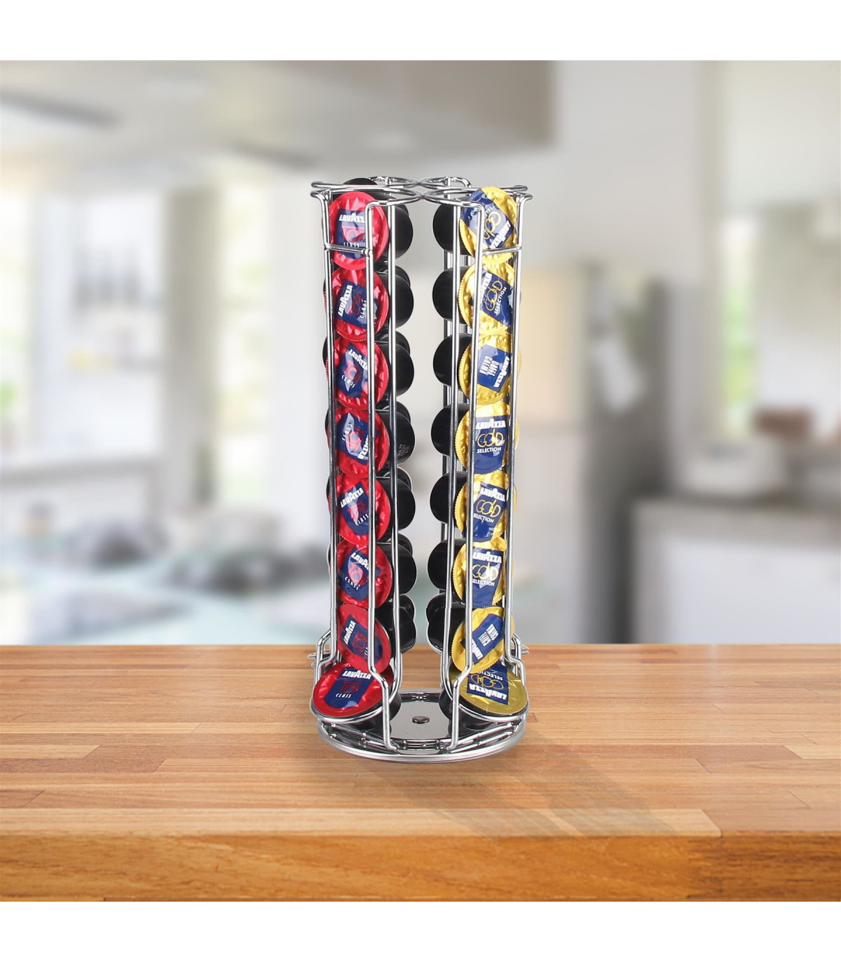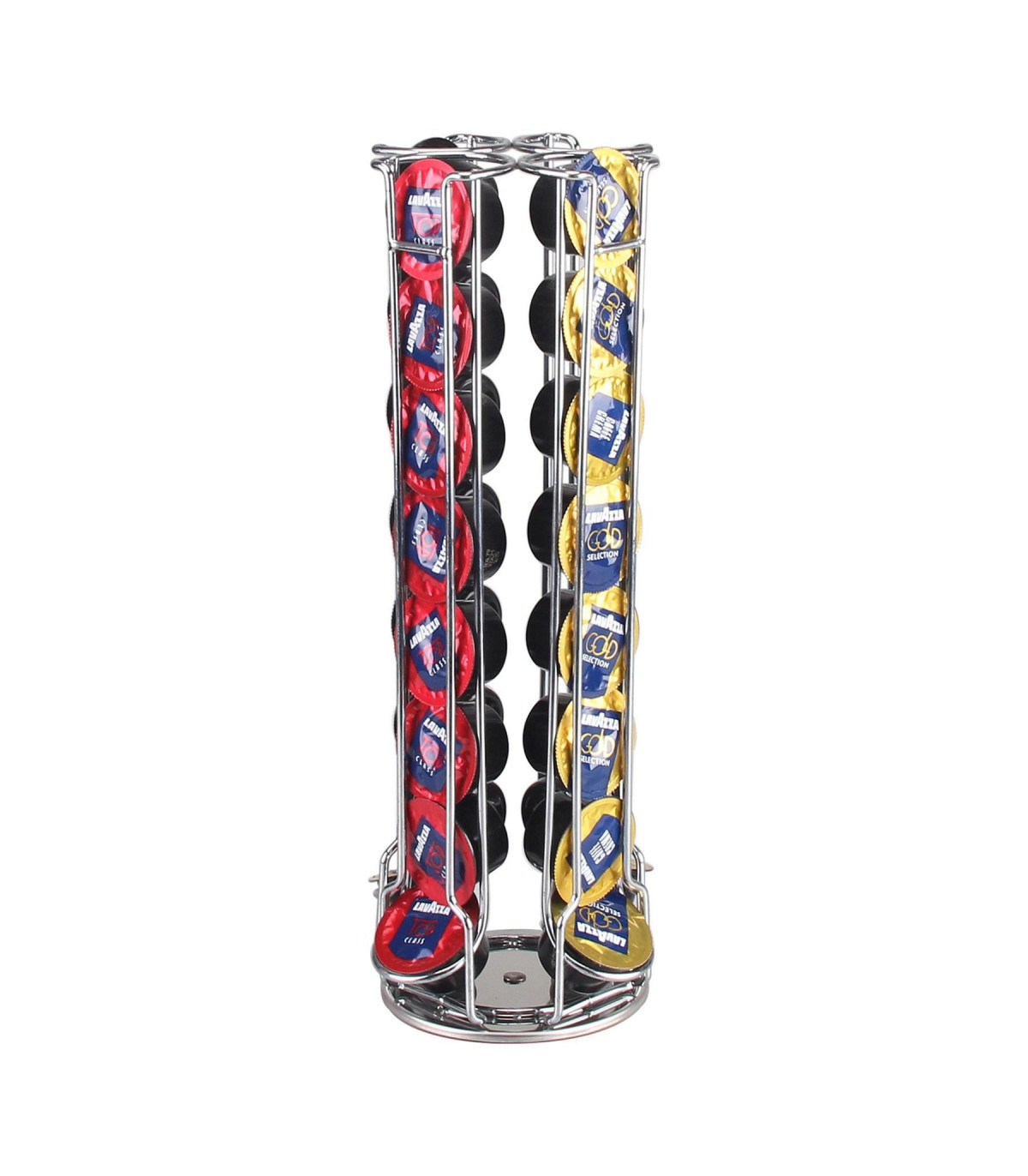 This stylishly designed revolving capsule holder allows you to hold up to 32 Lavazza Mio capsules in 4 tiers. It is made of chrome, non-slip base, and rotates 360 degrees to aid pod selection. Great space-saving storage rack, keeping your workspaces clear of clutter.