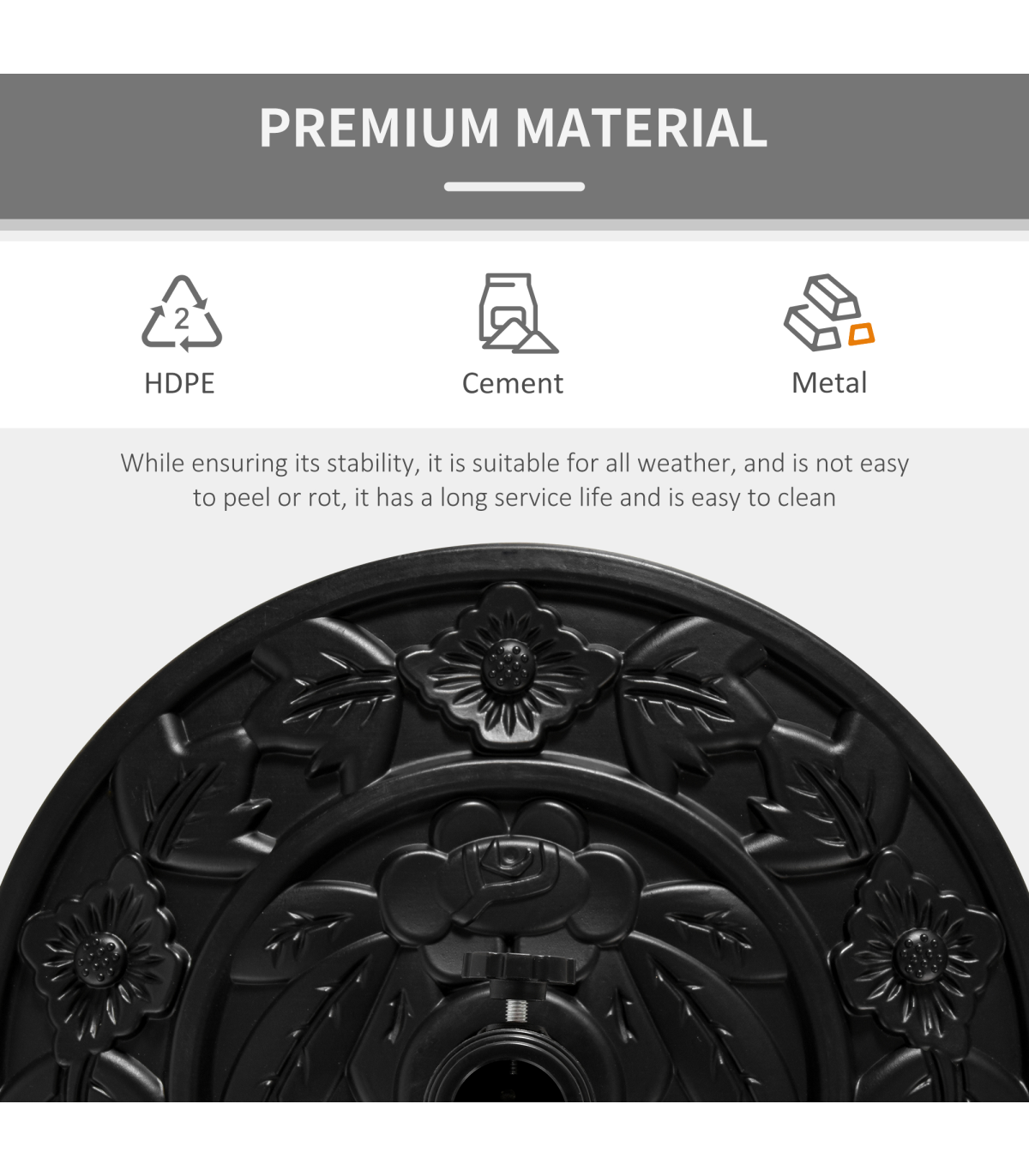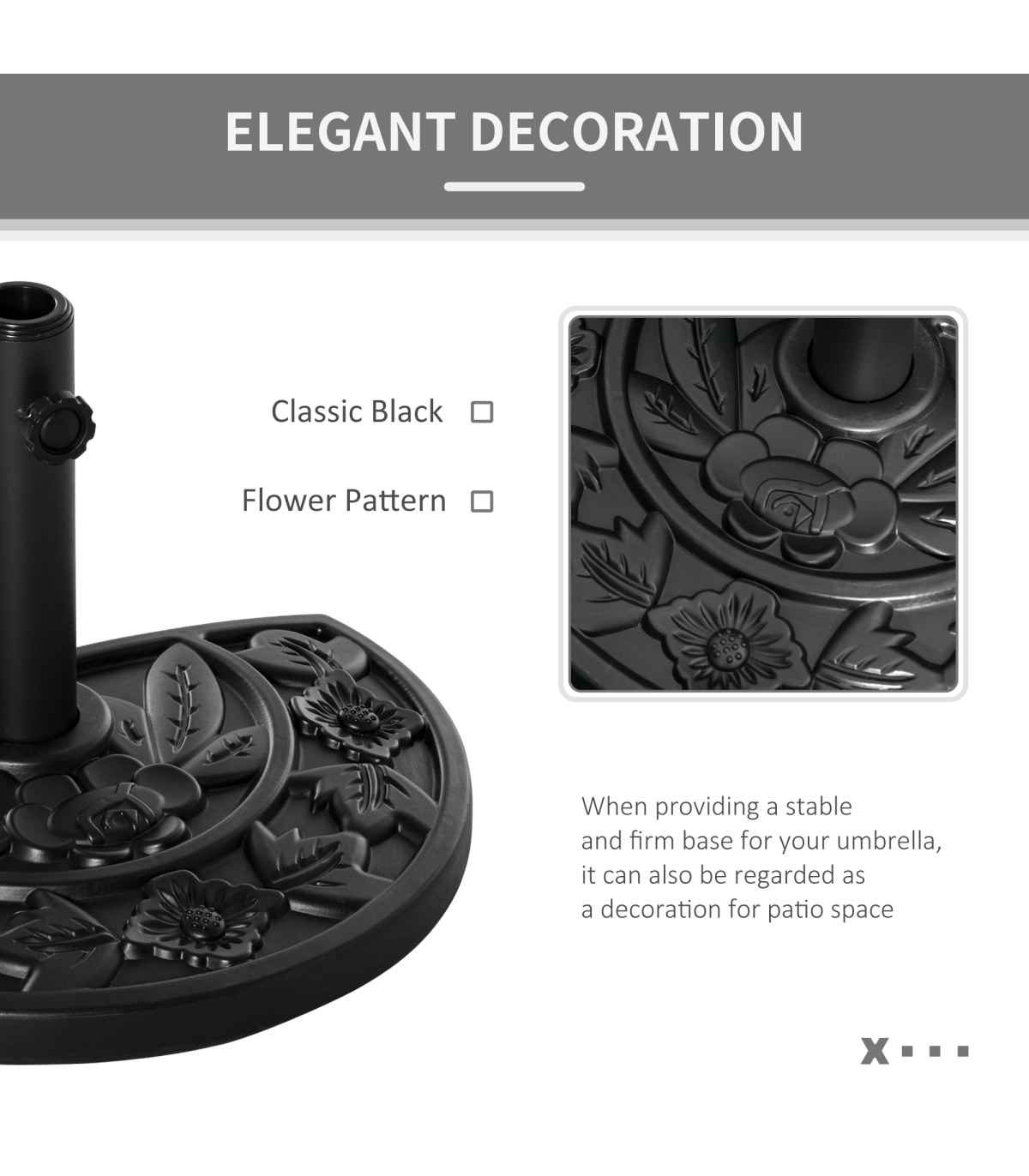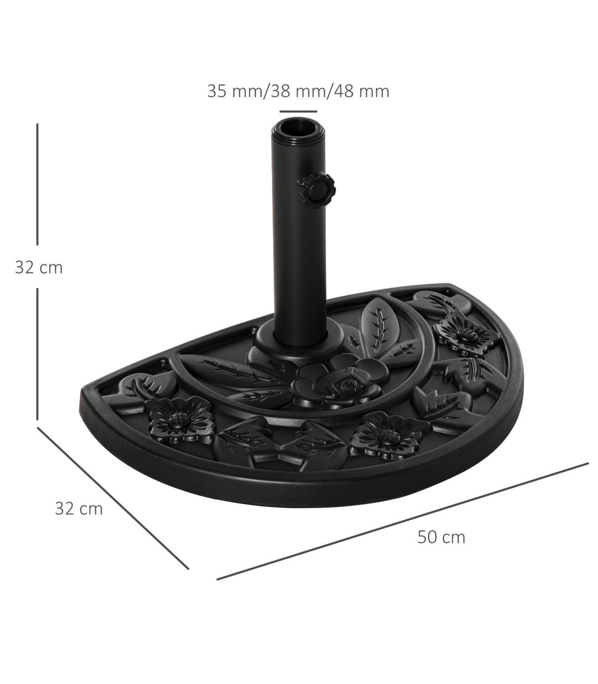 Incorporate elegance into your garden furniture with this half parasol umbrella base from Outsunny. Made from a blend of HDPE, cement, and metal, weighing 10kg, it can withstand heavy rain and wind conditions, making it suitable for use all year round. In a versatile black hue, it features a top engraved with a delicate and beautiful flower design and is finished with a tightening screw to hold the parasol pole securely in place all day long. It's the perfect combination of beauty and functionality.Dimensions: