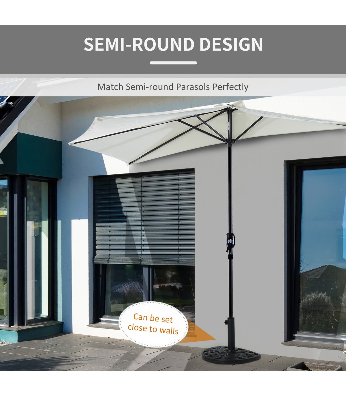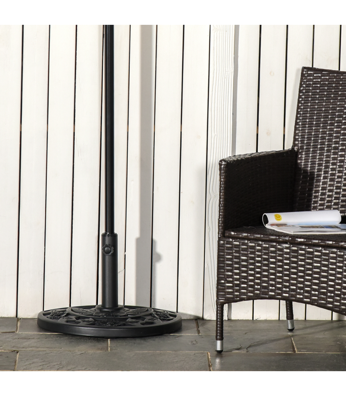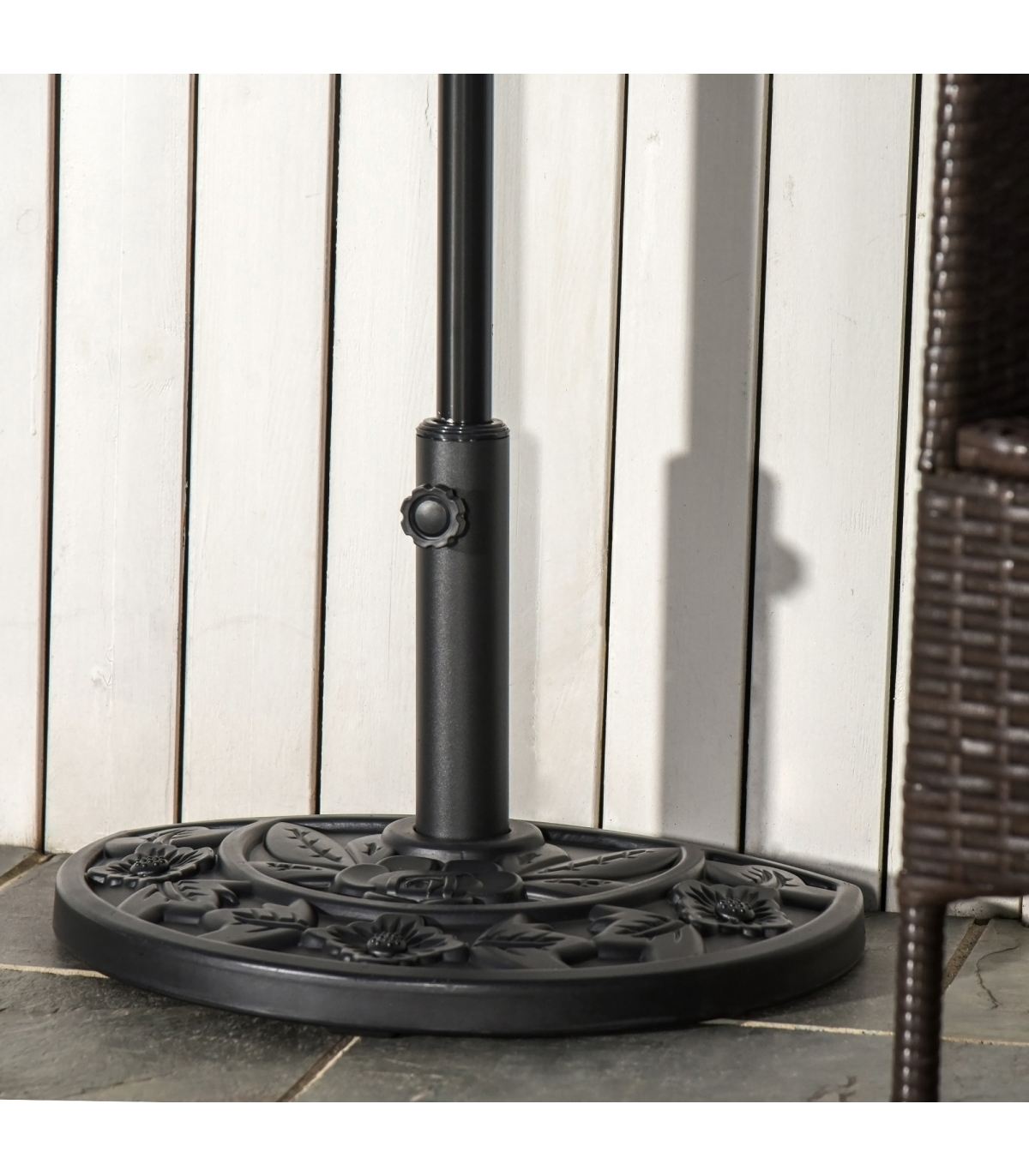 Incorporate elegance into your garden furniture with this half parasol umbrella base from Outsunny. Made from a blend of HDPE, cement, and metal, weighing 10kg, it can withstand heavy rain and wind conditions, making it suitable for use all year round. In a versatile black hue, it features a top engraved with a delicate and beautiful flower design and is finished with a tightening screw to hold the parasol pole securely in place all day long. It's the perfect combination of beauty and functionality.Dimensions: