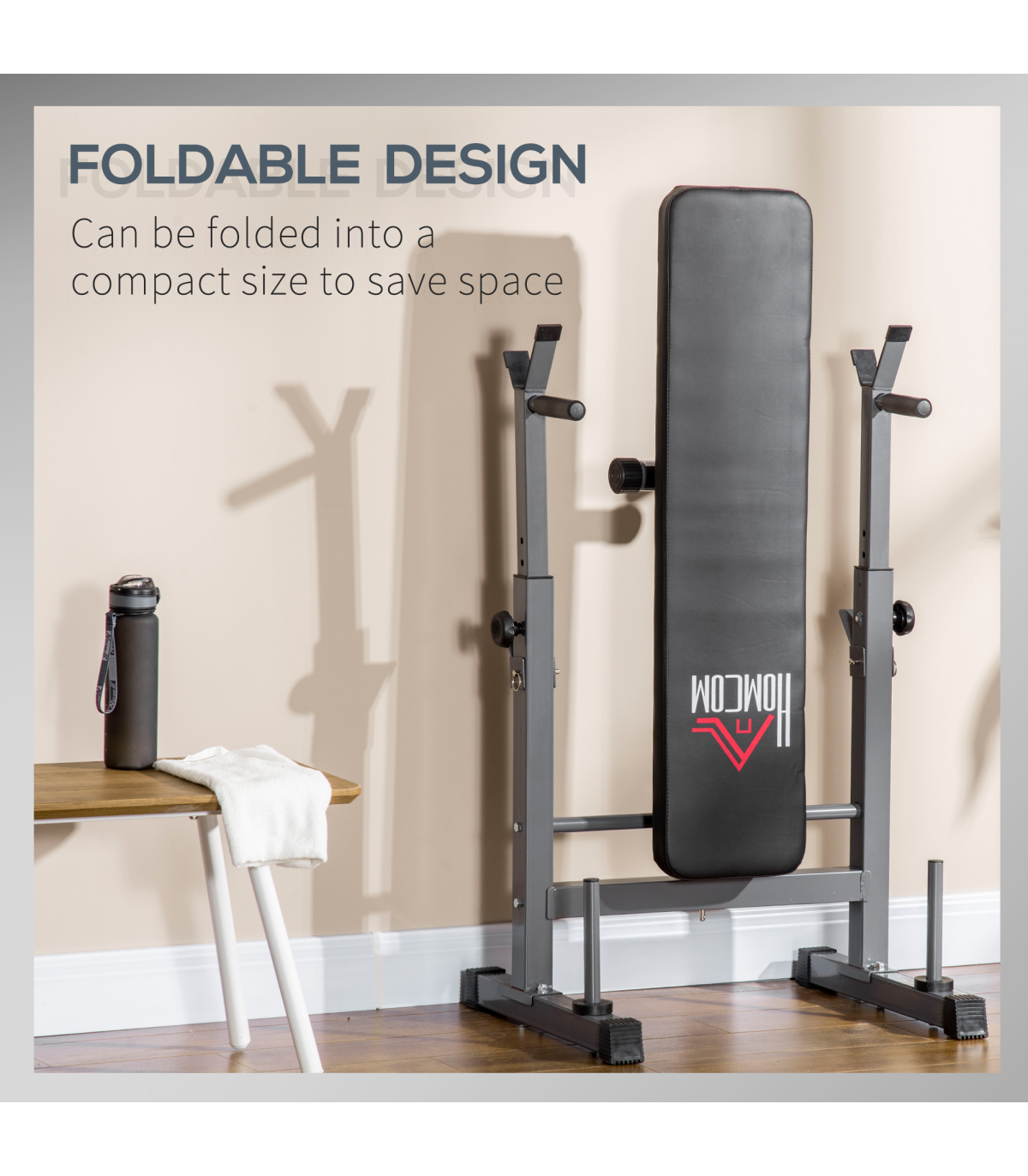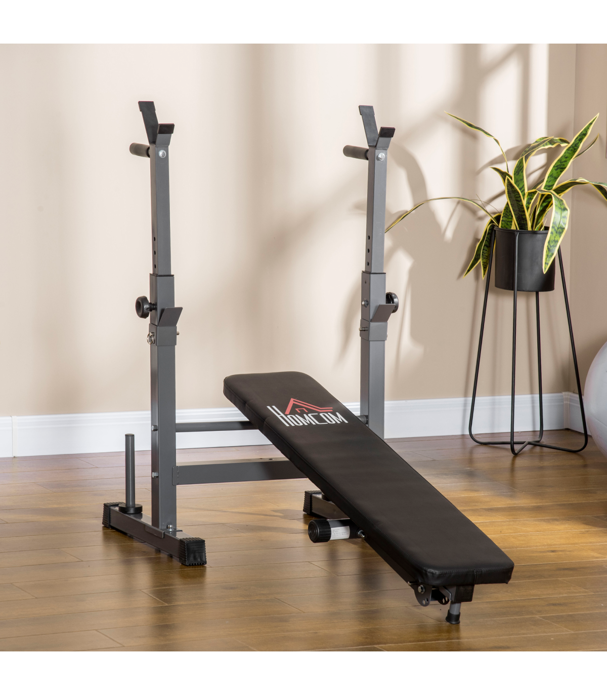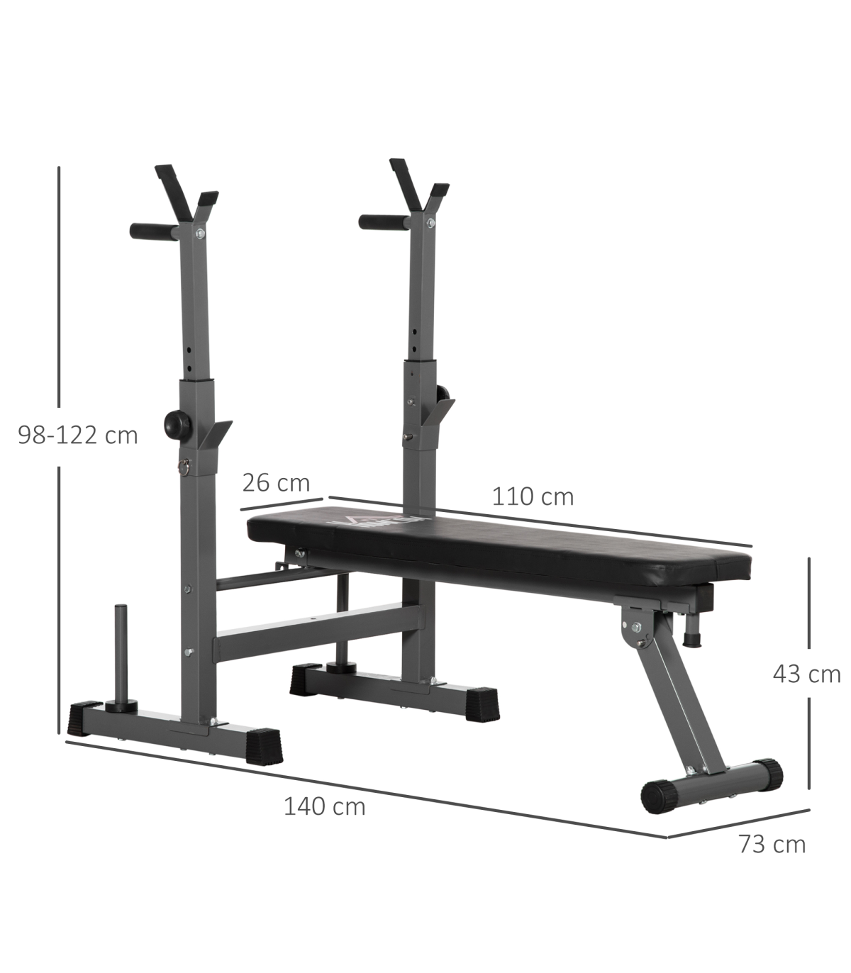With this HOMCOM weight bench, strength training has never been easier. Great for working your upper body, you can do bench presses, push ups, dips, rows and more. The barbell rack has eight different positions, so you can choose the right level for the best workout. The bench is padded with soft foam for maximum comfort. When finished, the bench can be folded and stored away, saving space. You can now stay fit and strong from home – no need for a gym.
