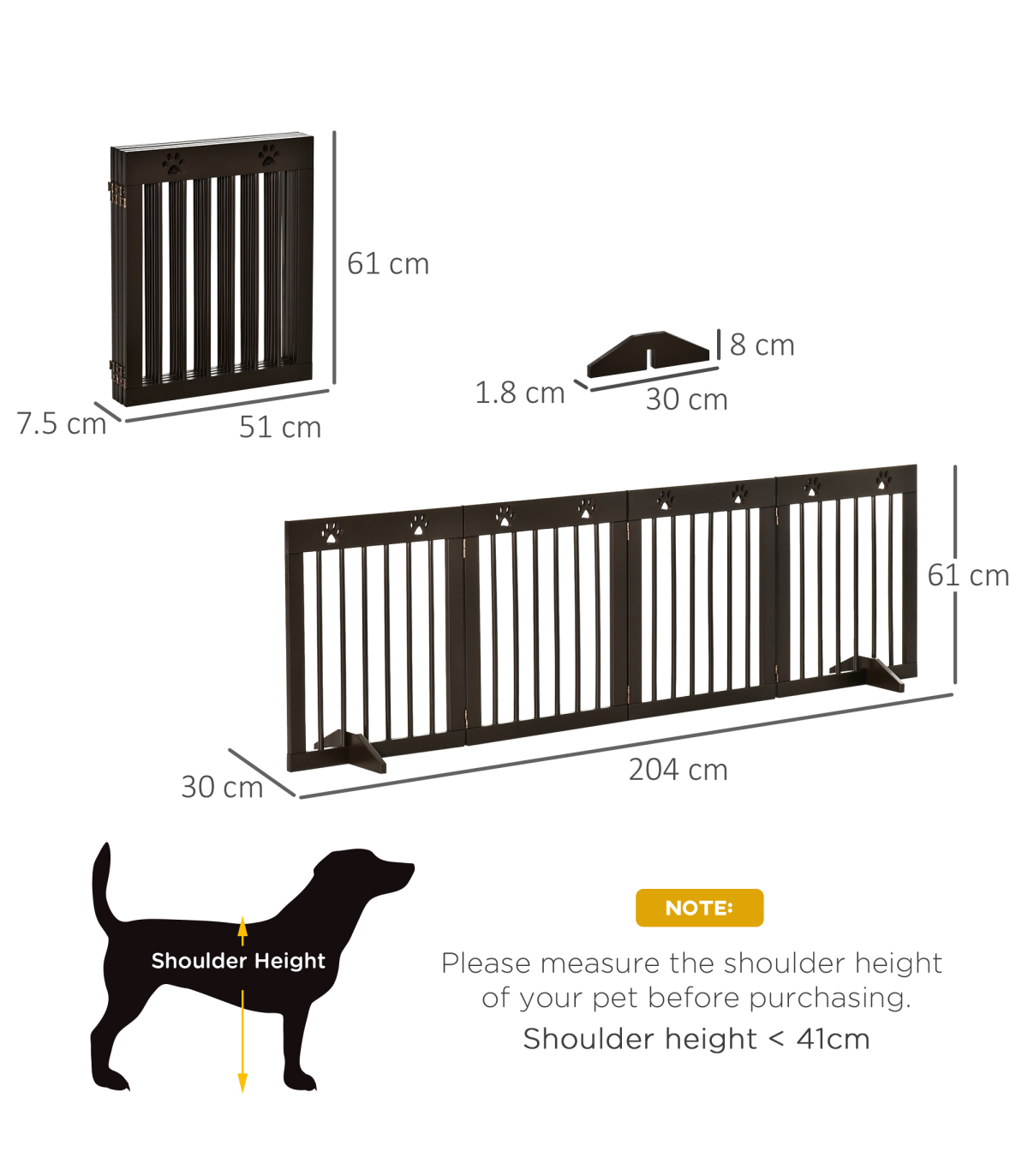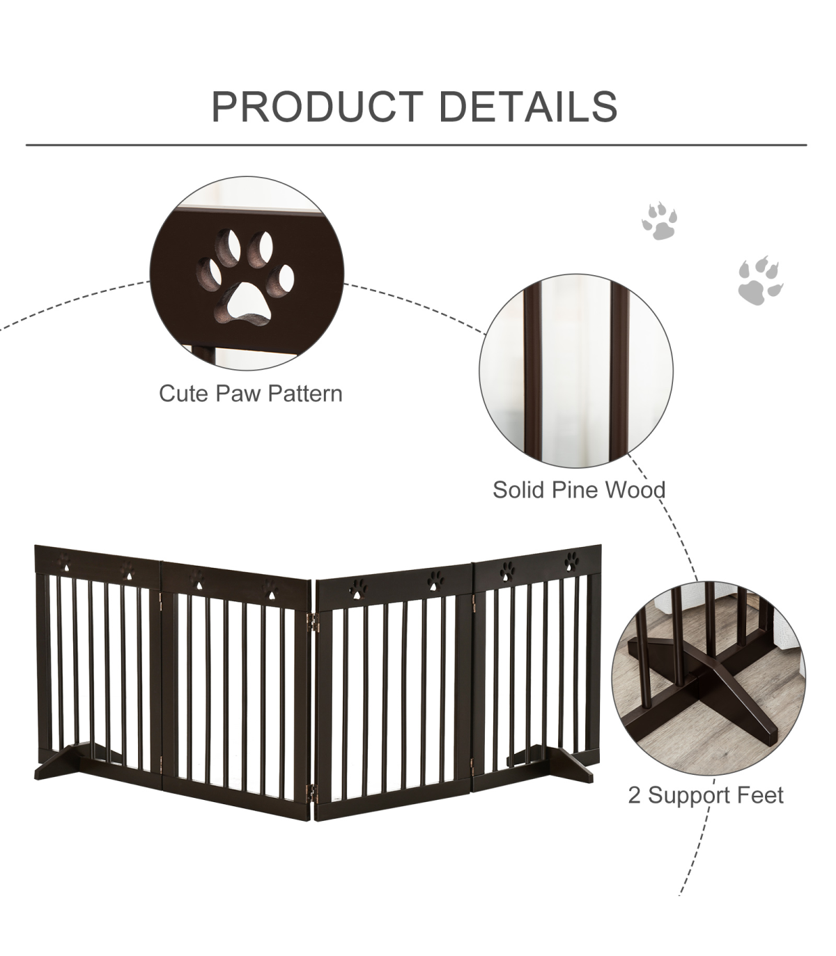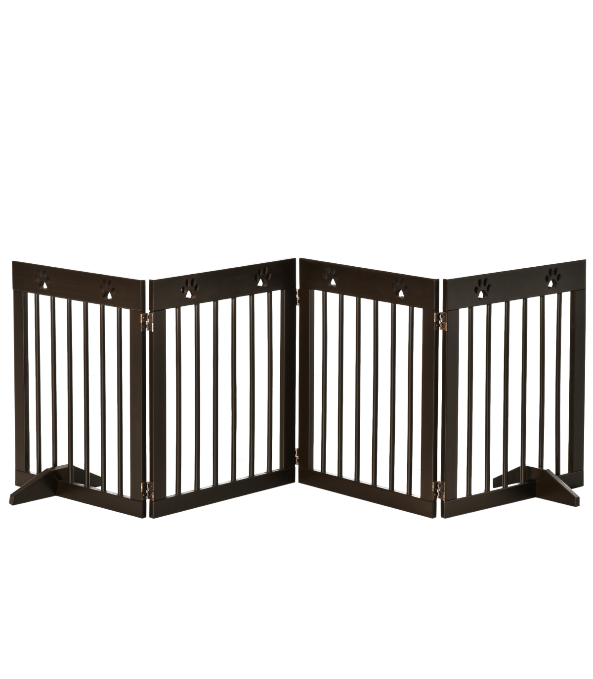 - Solid pine wood frame is durable and pet-friendly - Duel-sided Folding system with quality dual hinges makes it easy to set into different shapes - Great for doorways, halls, bedrooms, and staircases - Cut-out paw pattern on top is cute - Two removable feet for added stability - Unsuitable for strong dogs This PawHut pet gate is the perfect solution to limit your pet's activities in a safe and effective way. Made of solid pine wood, this gate consists of four panels connected by hinges, allowing you to adjust its shape to fit different spaces. When not in use, simply fold it up to save space. Ideal for doorways, stairs, and entrances, this gate is a reliable tool to keep your pets secure when needed. - Dimensions: 204L x 30W x 61H cm - Weight: 20.00 kg - Colour: Brown
