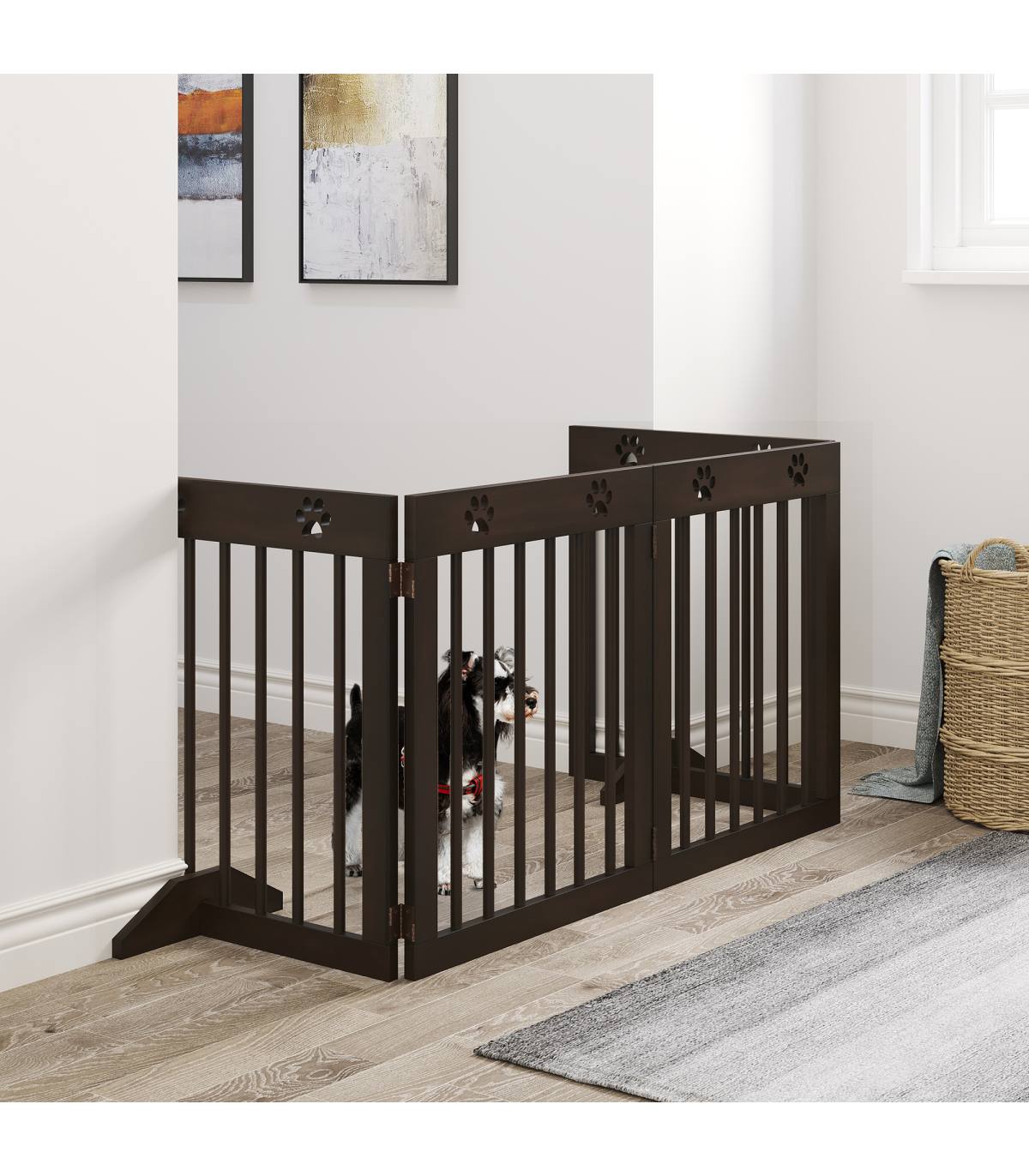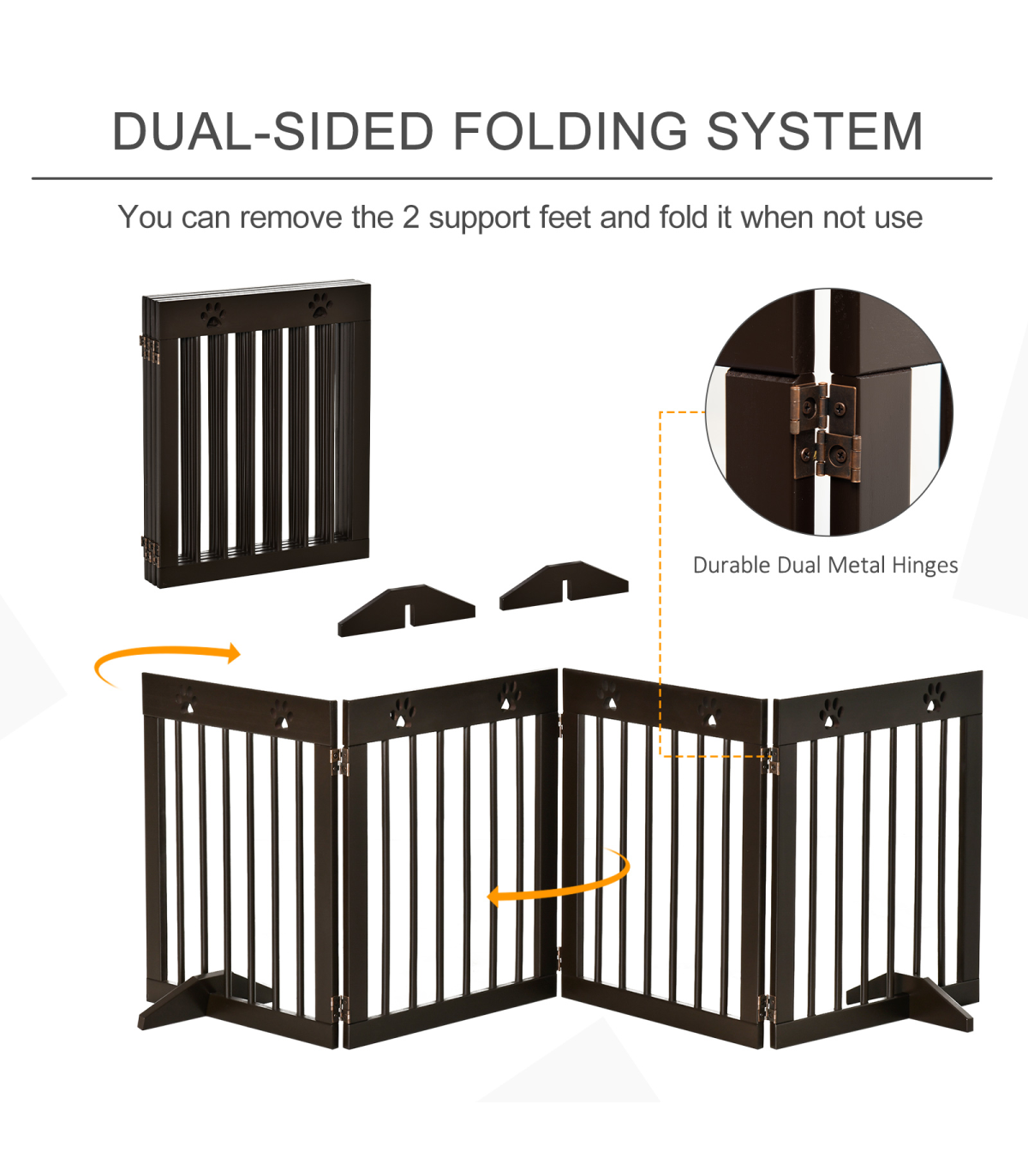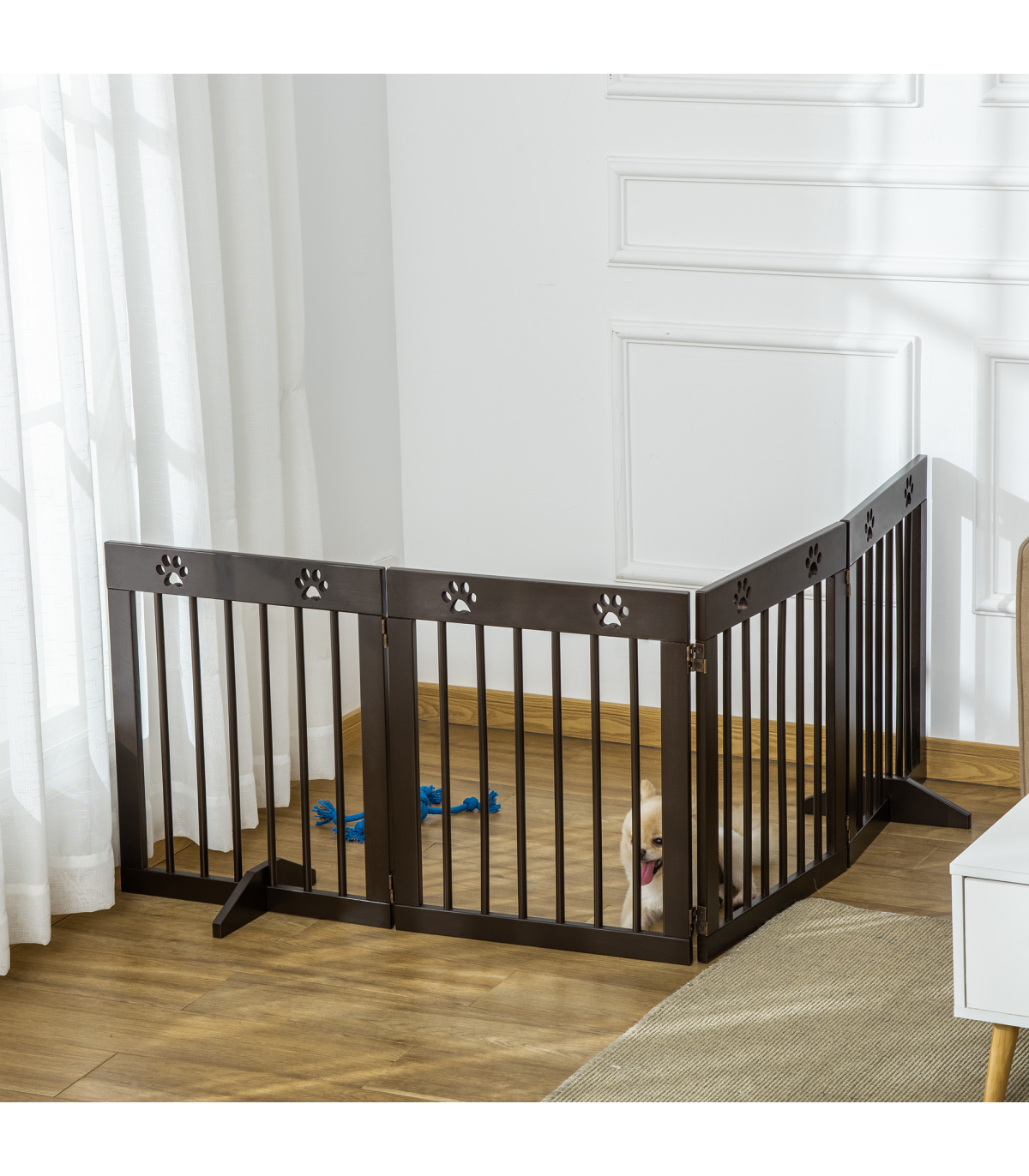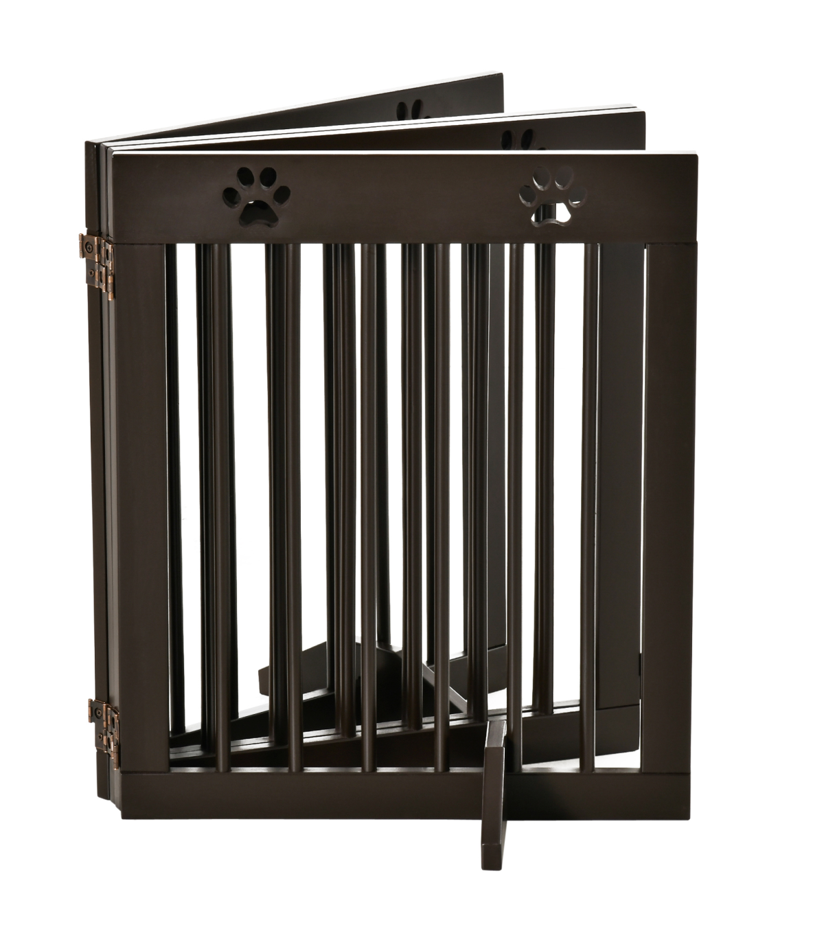 - Solid pine wood frame is durable and pet-friendly - Duel-sided Folding system with quality dual hinges makes it easy to set into different shapes - Great for doorways, halls, bedrooms, and staircases - Cut-out paw pattern on top is cute - Two removable feet for added stability - Unsuitable for strong dogs This PawHut pet gate is the perfect solution to limit your pet's activities in a safe and effective way. Made of solid pine wood, this gate consists of four panels connected by hinges, allowing you to adjust its shape to fit different spaces. When not in use, simply fold it up to save space. Ideal for doorways, stairs, and entrances, this gate is a reliable tool to keep your pets secure when needed. - Dimensions: 204L x 30W x 61H cm - Weight: 20.00 kg - Colour: Brown