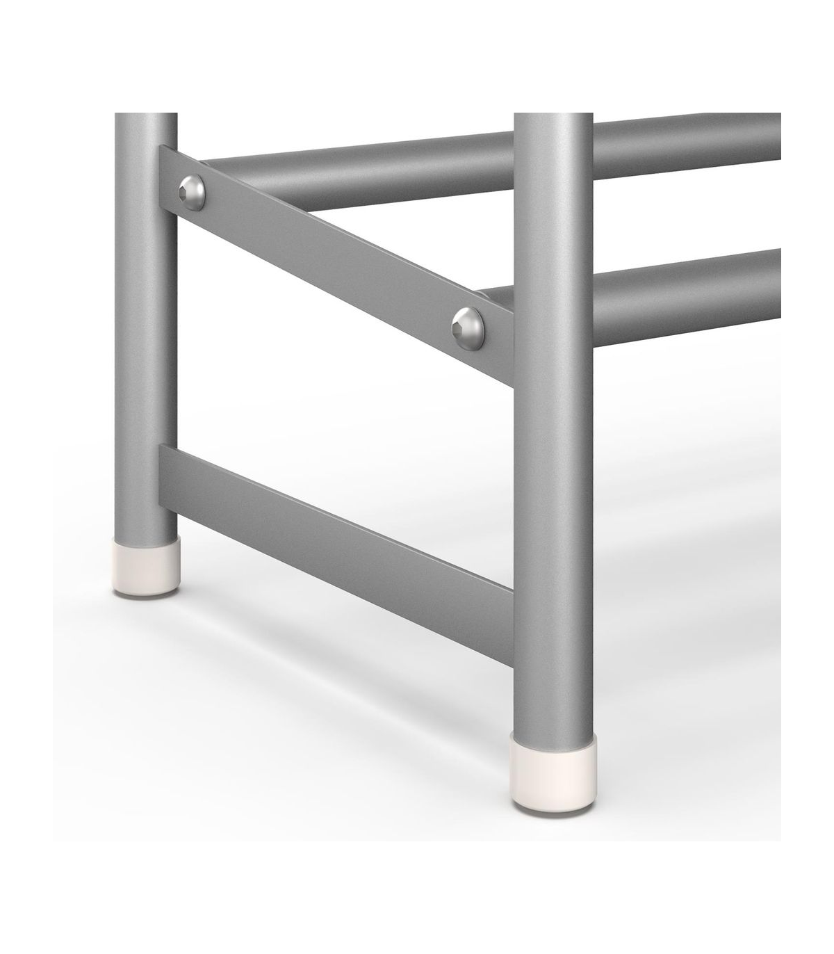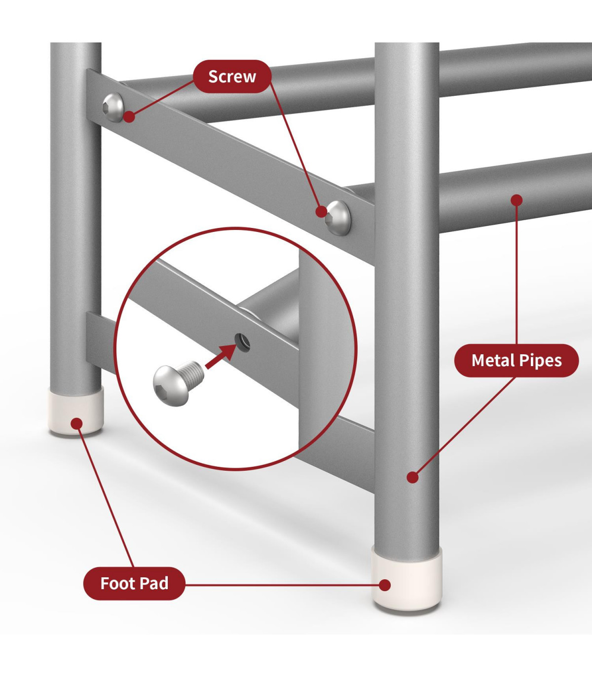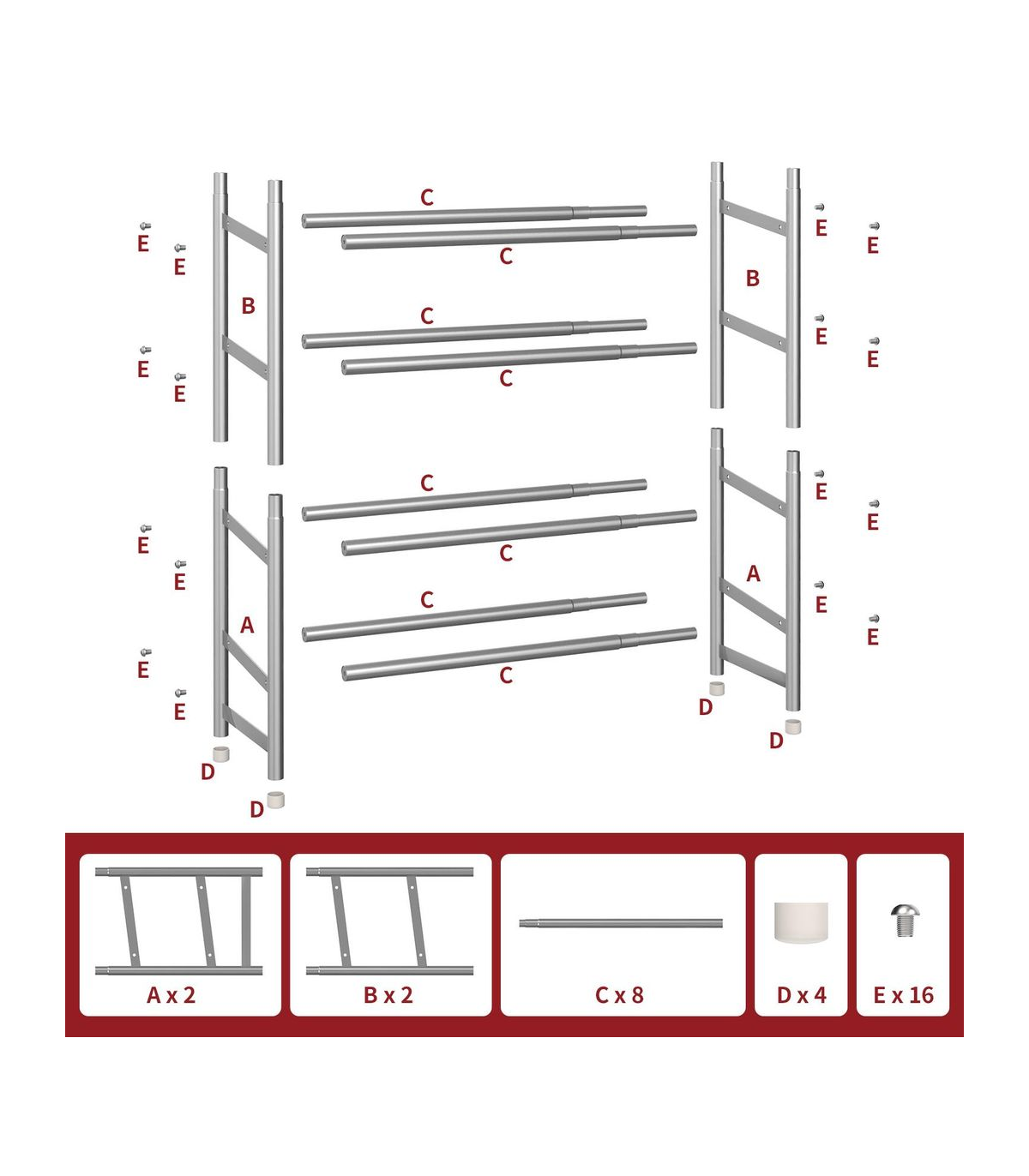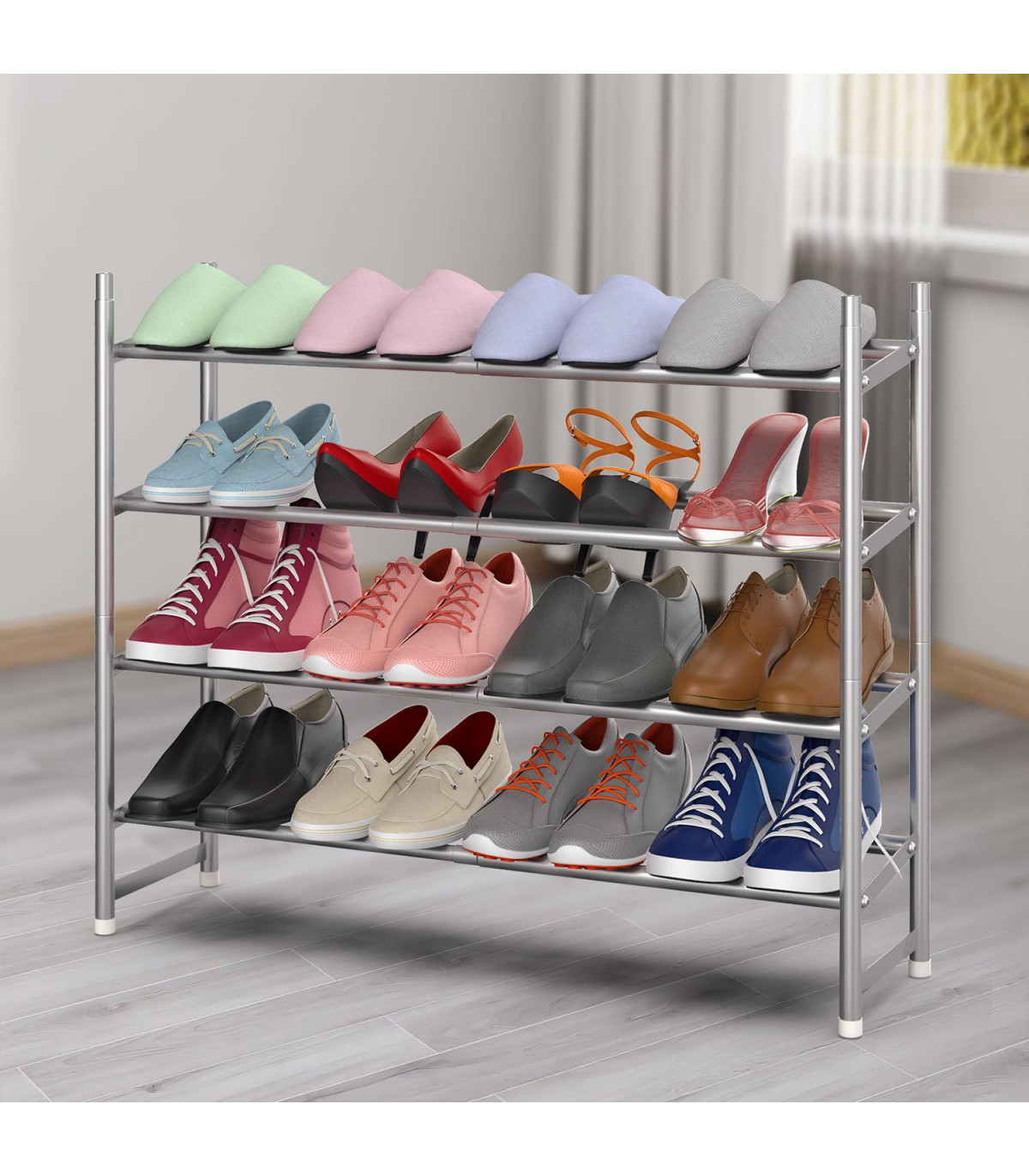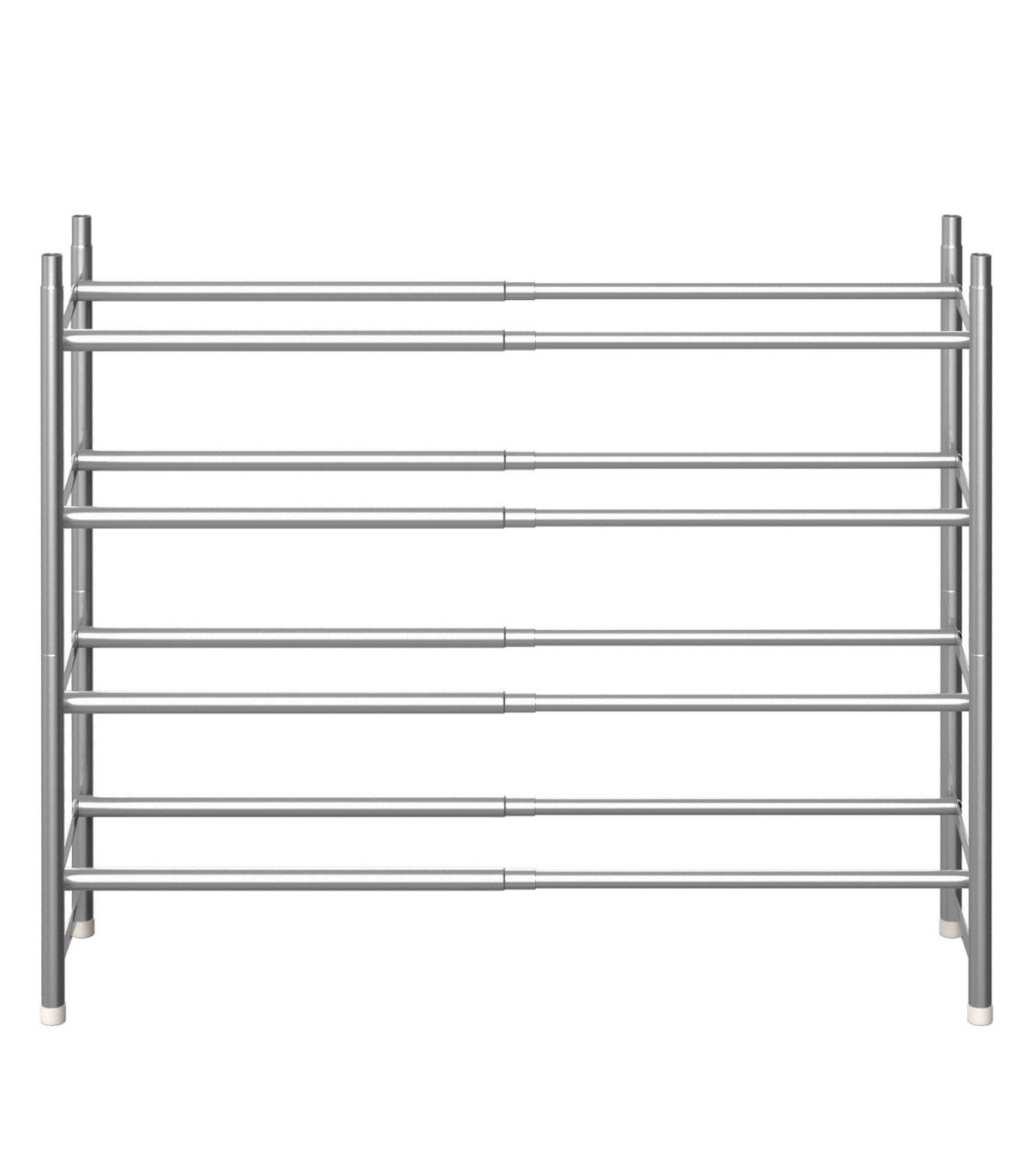 This 4 Tier Minimalist Shoe Rack Organiser Stand in Grey is the perfect solution for keeping your hallway, entryway, or balcony organized and clutter-free. The modern sleek design with a minimalist metal frame adds a stylish touch to any space, whether it's the entrance, corridor, closet, bedroom, or laundry room. Constructed from high quality metal pipes, this shoe rack is durable and sturdy, with foot pads to protect the floor from scratches and ensure stability. It can be extended to the length you require, making it versatile and suitable for a variety of decorative styles. The shoe rack can store up to 8-16 pairs of high-heeled shoes, ballet shoes, casual shoes, or children's shoes, making it a practical and functional storage solution. Assembly is quick and easy, with included instructions for your convenience.