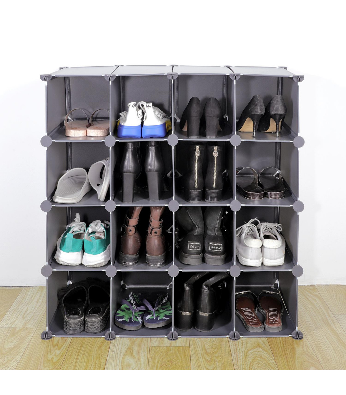 This Grey Plastic 16 Section Shoe Rack Organiser Cube is the perfect solution for organizing your cluttered shoes. The interlocking design allows you to create different combinations of cubes to fit in various spaces, making it versatile and multifunctional. The durable plastic panels are reinforced with steel frames and moulded locks for added strength, ensuring your shoes are protected from getting scuffed or marked.