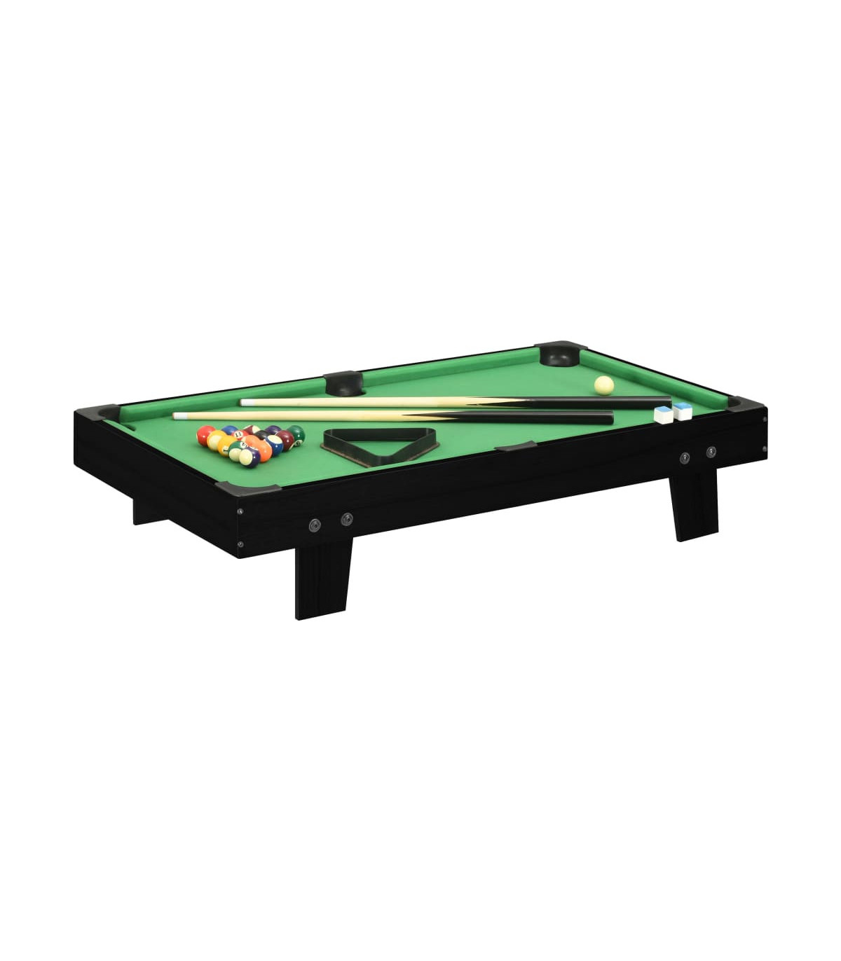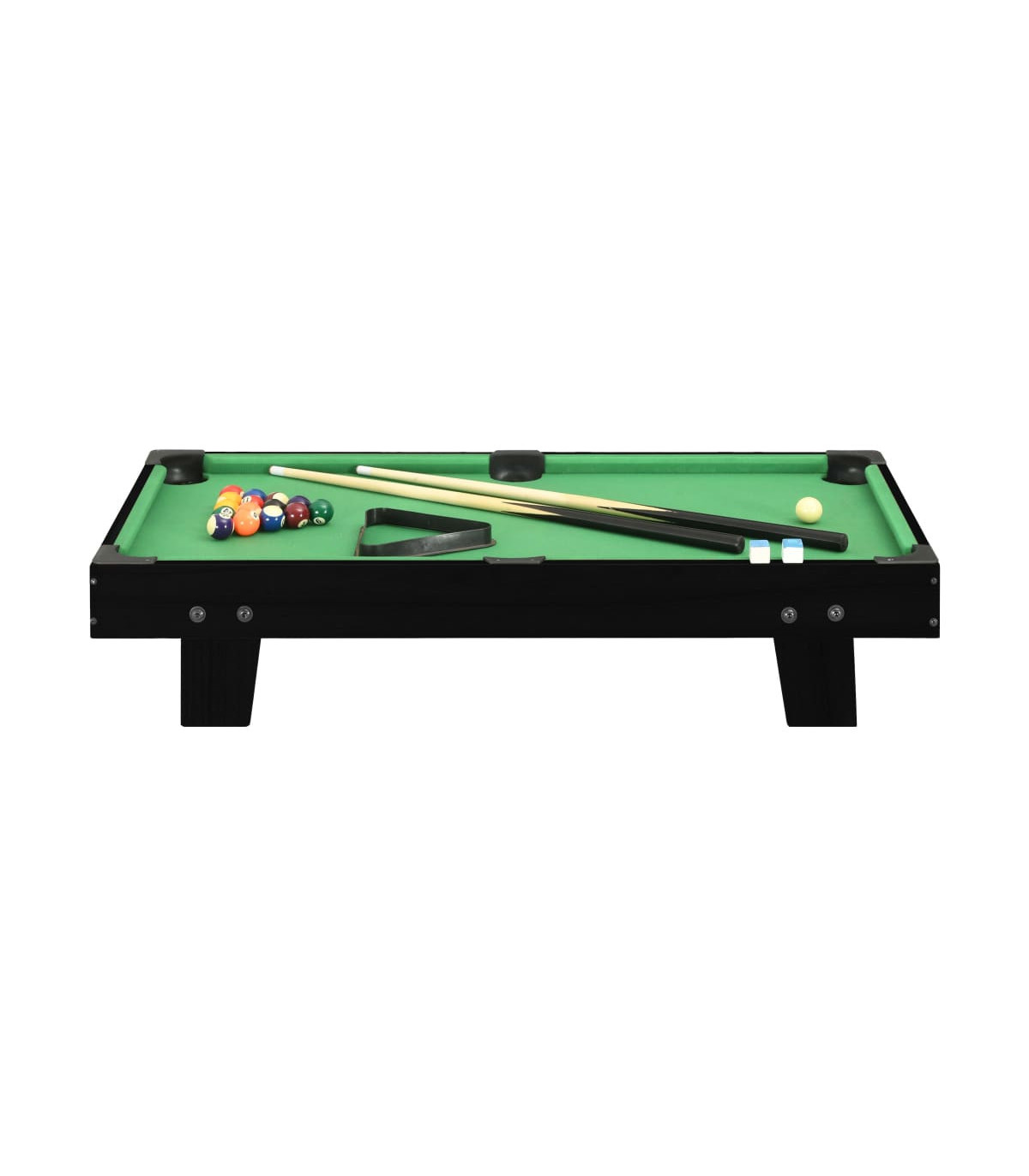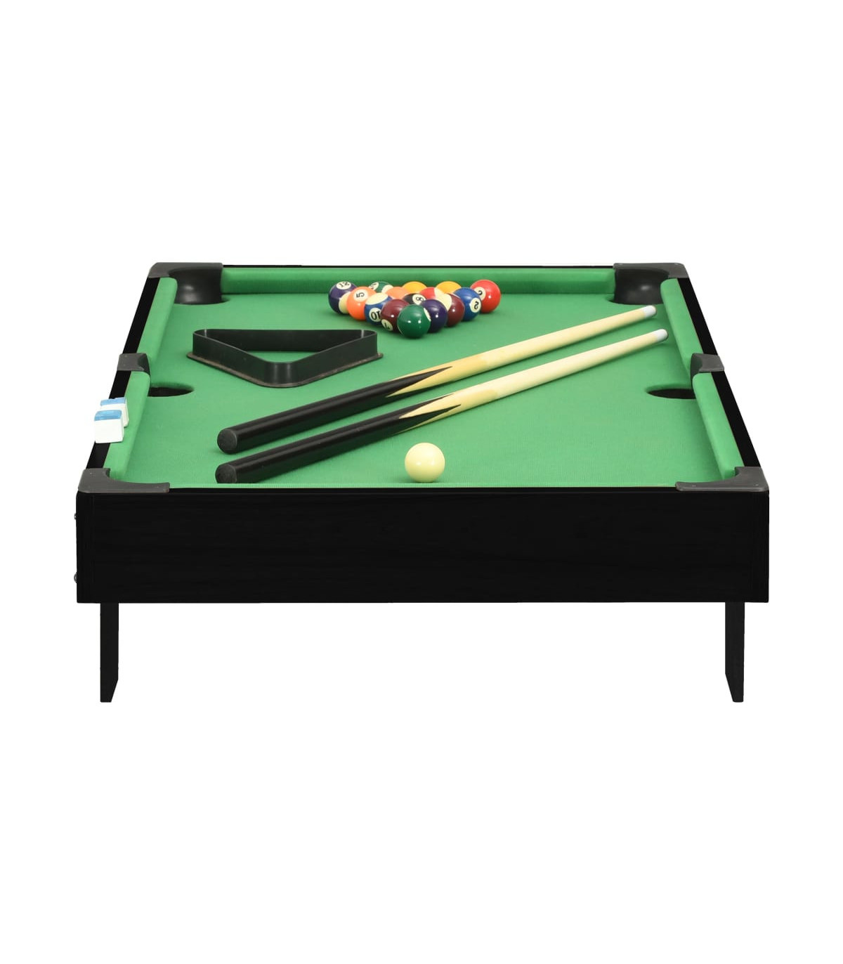Our mini portable pool table is truly a must for any pool fan who doesn't have the space for a full sized table. It can be placed on any regular table top and then you’re ready to play! Made of quality MDF board, billiard table is exceedingly stable for long term use. This game table is very suitable for green hands to get familiar with the rules. When not in use, you can just store in the corner and will not occupy much room. This fun set includes 1 billiard table, 1 triangle rack, 16 balls, 2 cues, as well as 2 billiard chalks.