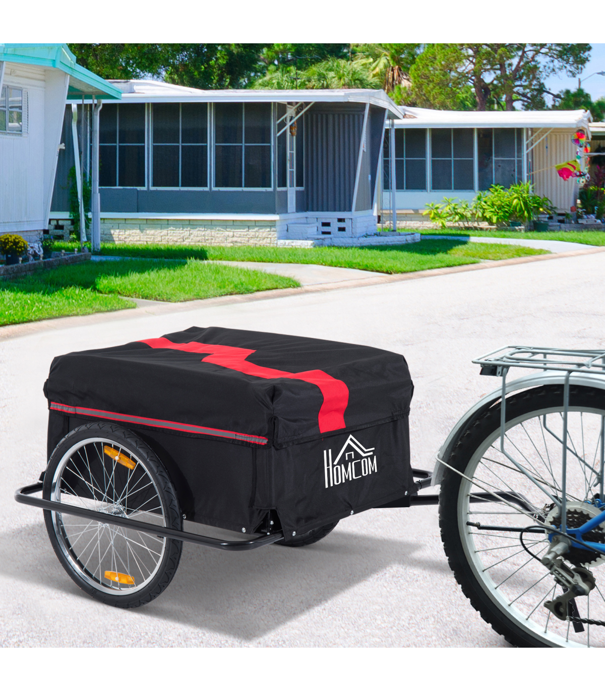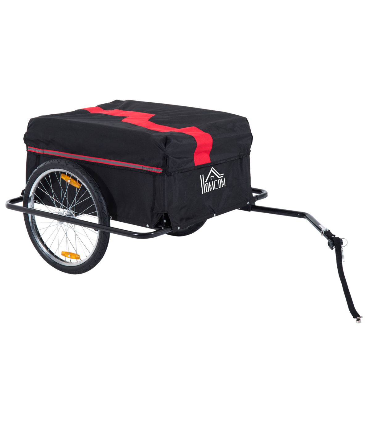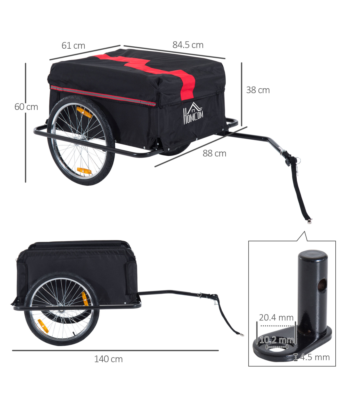 STEEL BASE: A solid platform which keeps this push bike trailer steady and balanced when in motion. Holds the carrier securely so nothing falls off when properly packed.SPACIOUS BAG: Offers plenty of safe holding room for your shopping essentials. Made from oxford cloth, this cycle trailer is tough and durable, with a top cover to protect from light rain and wind.TWO WHEELS: This allows smooth movement on the ground when you're on the go. Reflectors on both sides of this bike trailer for visibility and safety. Releases from the frame for easy storage.HITCH CONNECTION: Attaches to your bike easily and keeps in place securely. DIMENSIONS: 60H x 140L x 88Wcm. Inside storage: 38H x 84.5L x 61Wcm.MAXIMUM LOAD 40KG. EASY TO ASSEMBLE.