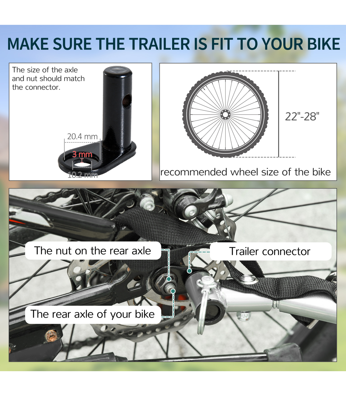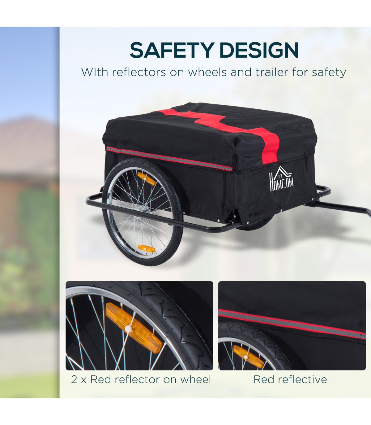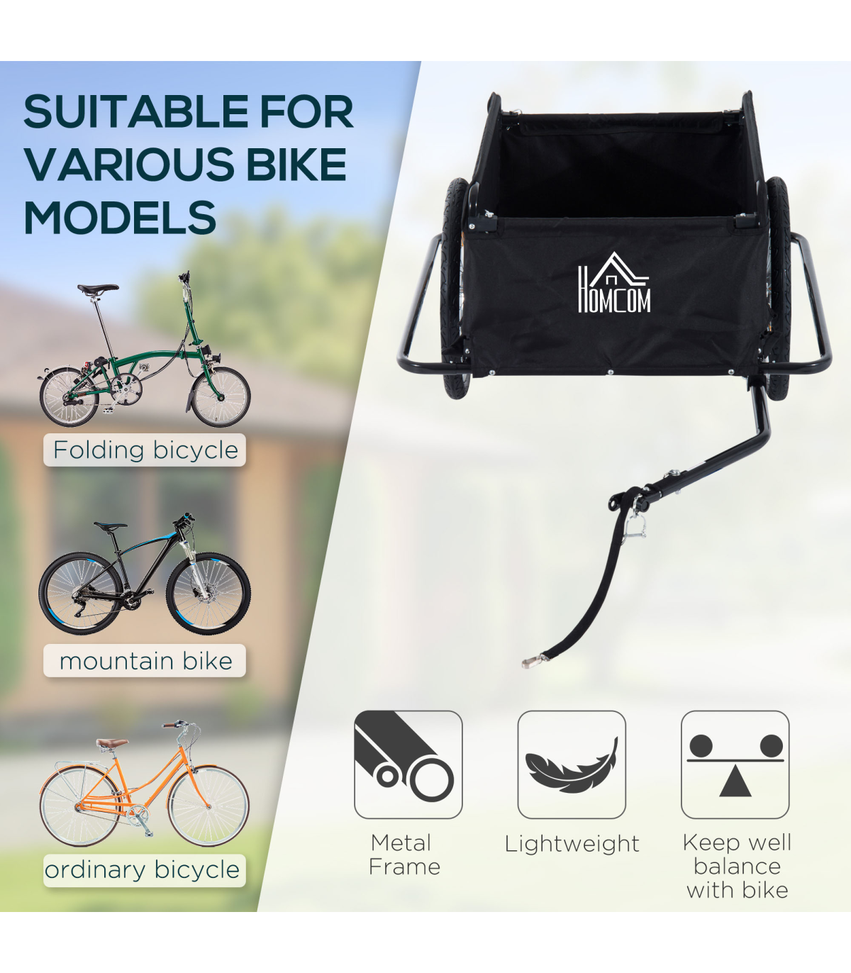 STEEL BASE: A solid platform which keeps this push bike trailer steady and balanced when in motion. Holds the carrier securely so nothing falls off when properly packed.SPACIOUS BAG: Offers plenty of safe holding room for your shopping essentials. Made from oxford cloth, this cycle trailer is tough and durable, with a top cover to protect from light rain and wind.TWO WHEELS: This allows smooth movement on the ground when you're on the go. Reflectors on both sides of this bike trailer for visibility and safety. Releases from the frame for easy storage.HITCH CONNECTION: Attaches to your bike easily and keeps in place securely. DIMENSIONS: 60H x 140L x 88Wcm. Inside storage: 38H x 84.5L x 61Wcm.MAXIMUM LOAD 40KG. EASY TO ASSEMBLE.