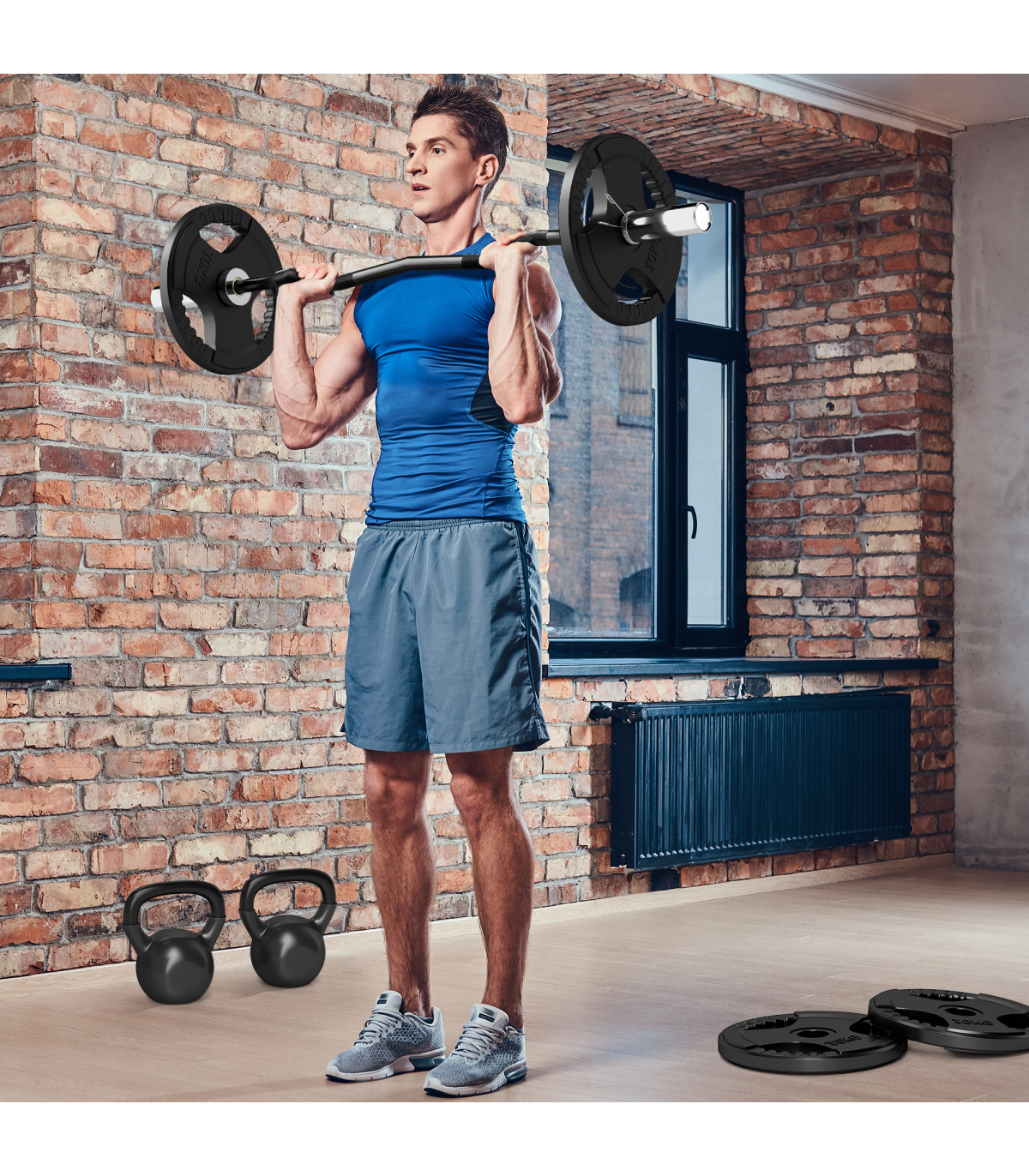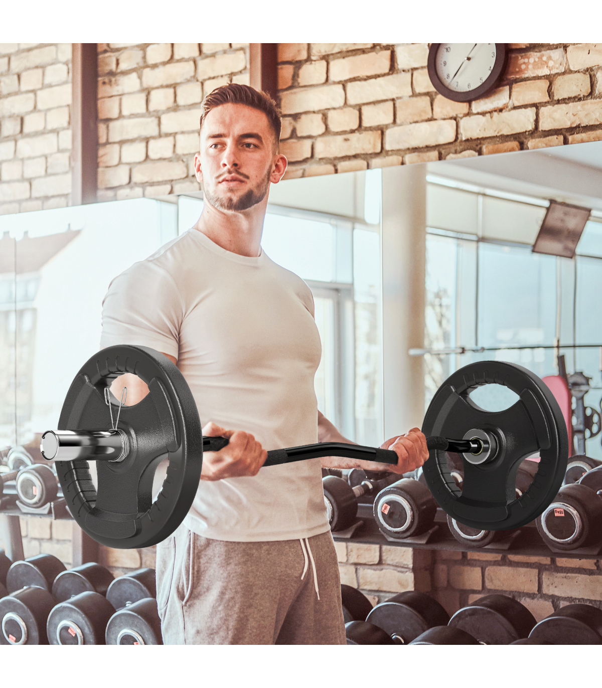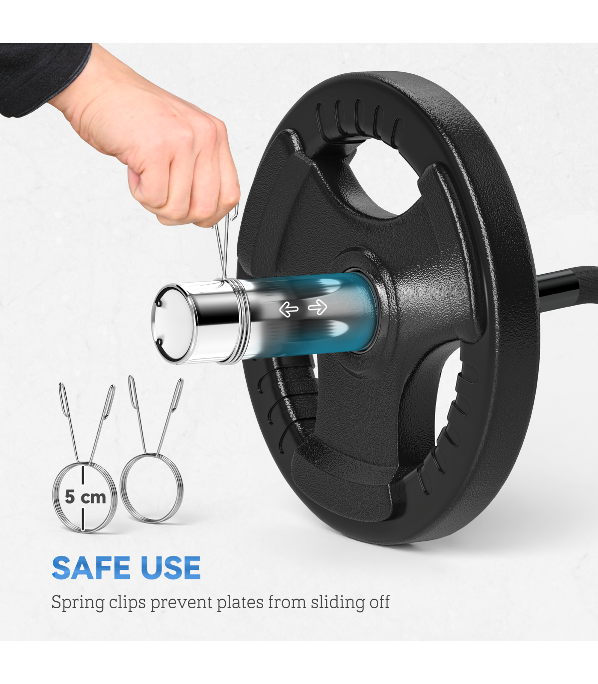 Suitable for weight plates with a 5cm hole � the maximum load is 100kg Non-slip handle gives you a solid grip, ensuring safety when exercising Steel material is strong for long-lasting use Two safety spring buckles, holding the weight plates in place No assembly required