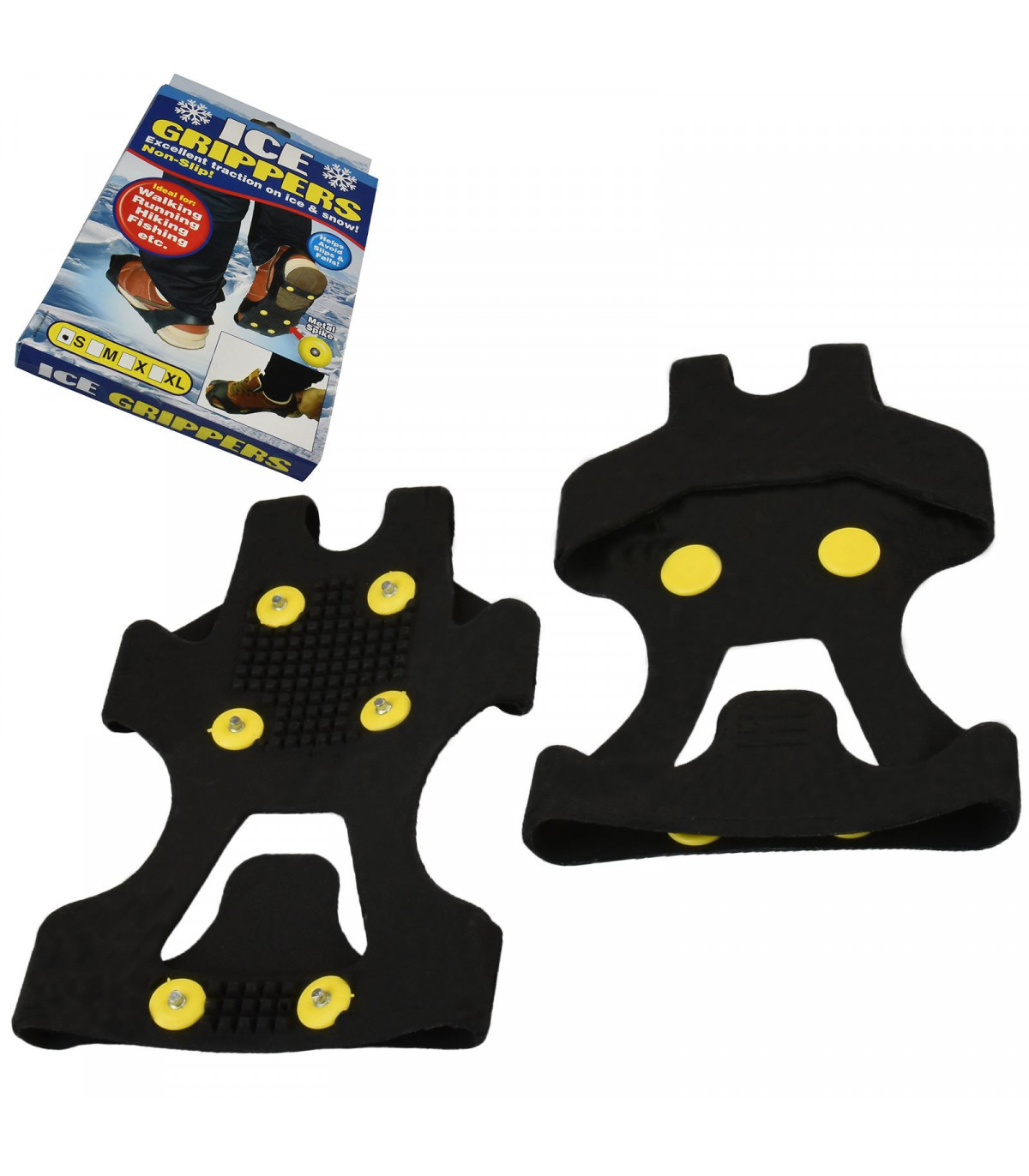 This Ice Grippers (also known as Active Grip) offers an easy-to-use, reliable, lightweight ice gripper for shoes and boots. Importantly, the Ice Runner is a studded ice gripper offering superior traction on snow and ice compared to non-studded models which are effective on snow. This Ice Runner offers a snug fit around the footwear with the rubber needing to be stretched around the footwear to achieve a safe and comfortable fit. The Ice Runner is suitable for pedestrians, businesspeople, keen walkers or joggers, athletes and anyone else who wants greater stability on ice and snow. The elderly and people with limited strength in their arms should consider other ice gripper models by spring yard such as winter grip or Icy Heel. Both of these are heel models with an easy to attach function. Protective Equipment, Excellent Anti-Slip effect. Four sizes to choose from: S, M, L, & XL Main Colour: Black Features: Features: Helps to avoid Slip & Falls Four sizes to choose from: S,M, L & XL Ideal for walking, running, hiking, fishing etc. The Ice Runner (also known as Active Grip) offers an easy-to-use Ice Runner has 6 metal Spikes, steel studs on the sole and heel providing optimal durability and excellent traction
