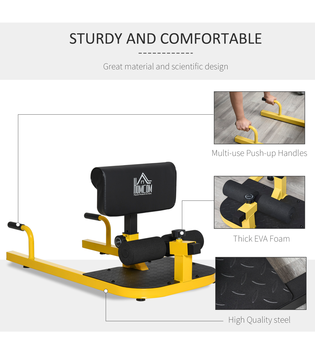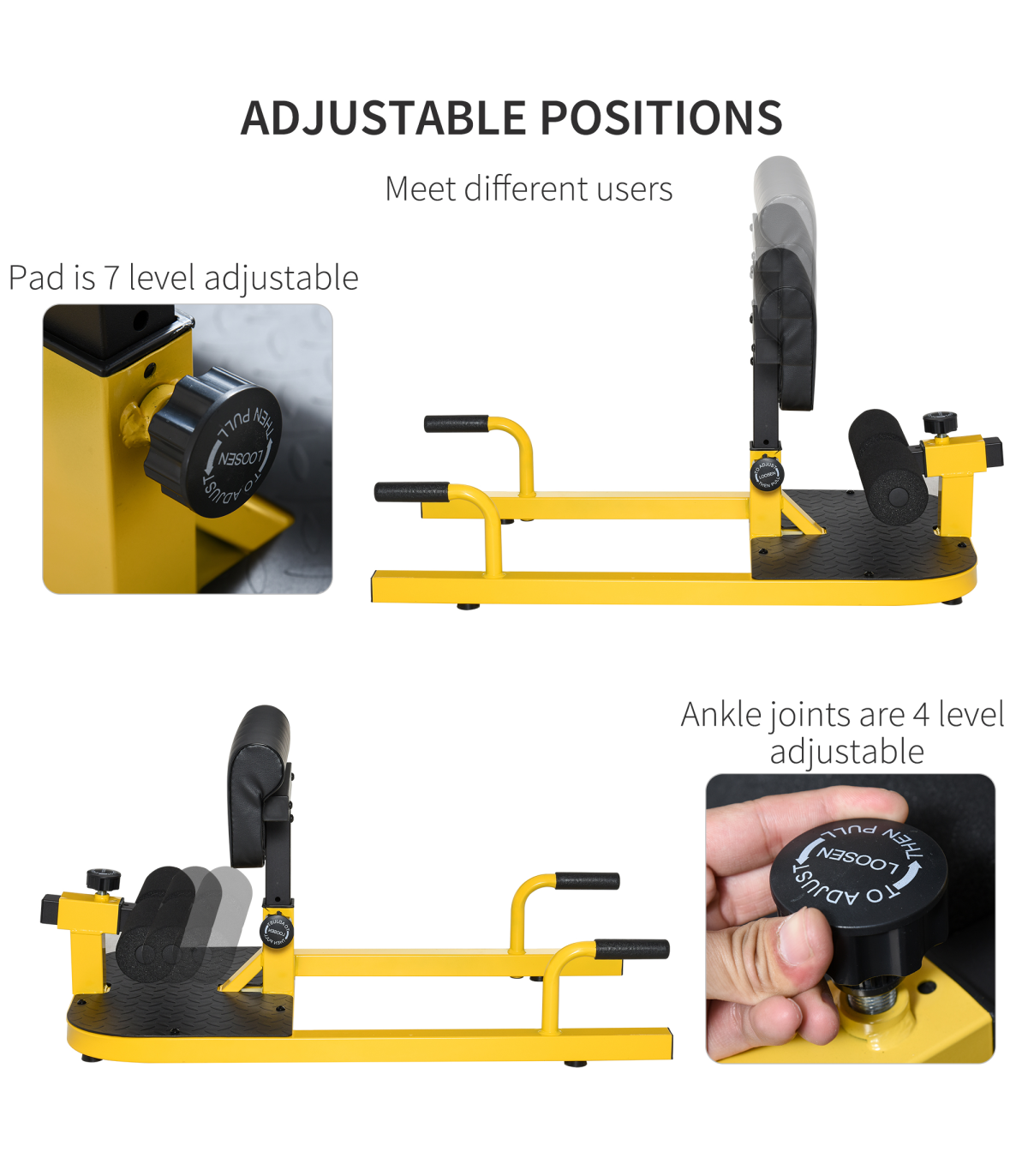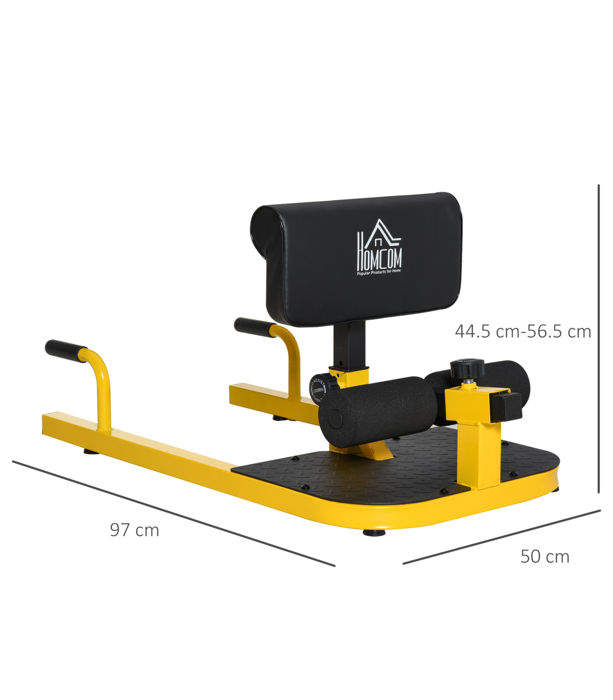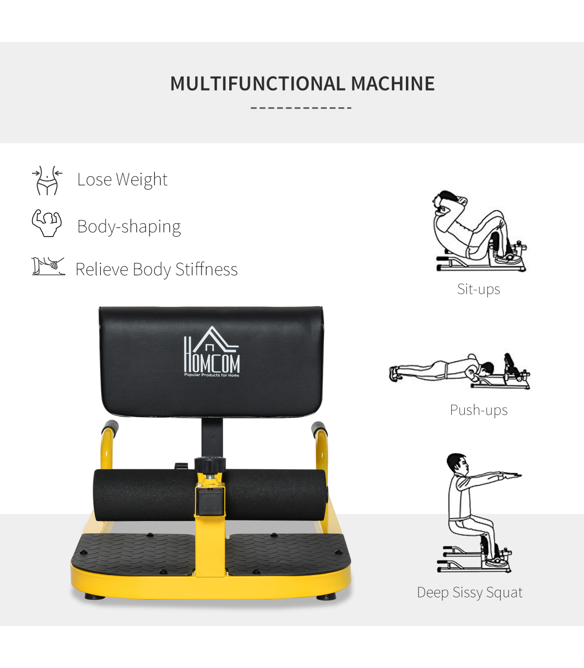 Multiple Exercise Machine: This 3-in-1 leg curl machine is perfect for performing deep sissy squats, sit-ups, and push-ups, to work your core, quads, glutes, and calved for training and conditioningFull Body Workout: This deep squat machine works to target all muscle groups in the quadriceps and glutes, while strengthening your knee and hip joints. Sit-ups and Push-ups functions help to strengthen your core, biceps, and lateral musclesSturdy Construction: The sissy squat bench made from a sturdy steel frame, this squat machine is durable for long lasting use. The foam roller footrest and calf pads keep your legs comfortably protected and secure as you work outNon-Slip Foot Plate: The leg training machine features 4 suction cup pads to keep the squat machine secure and stable on any hard surfaceLeg Exerciser Dimensions: Overall Dimension: 50W x 97D x 44.5-56.5H cm, Weight Capacity: 120kg